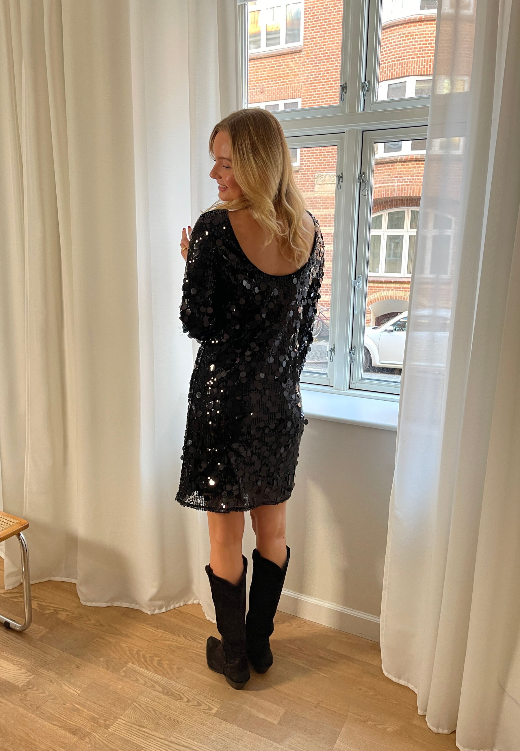 GAVEA-DR is a short party dress with long sleeves. The dress is completely covered with large, shiny, overlapping sequins. It has a round neckline at the front and a deep, round back neckline. The model is wearing a size S.