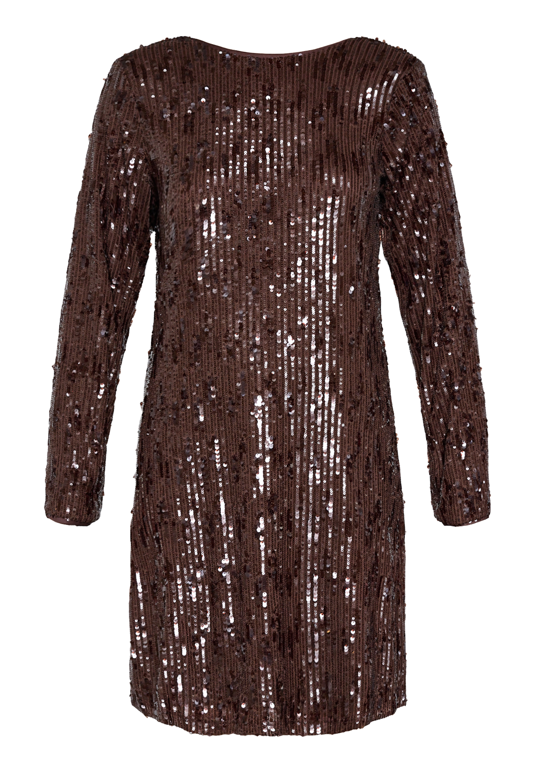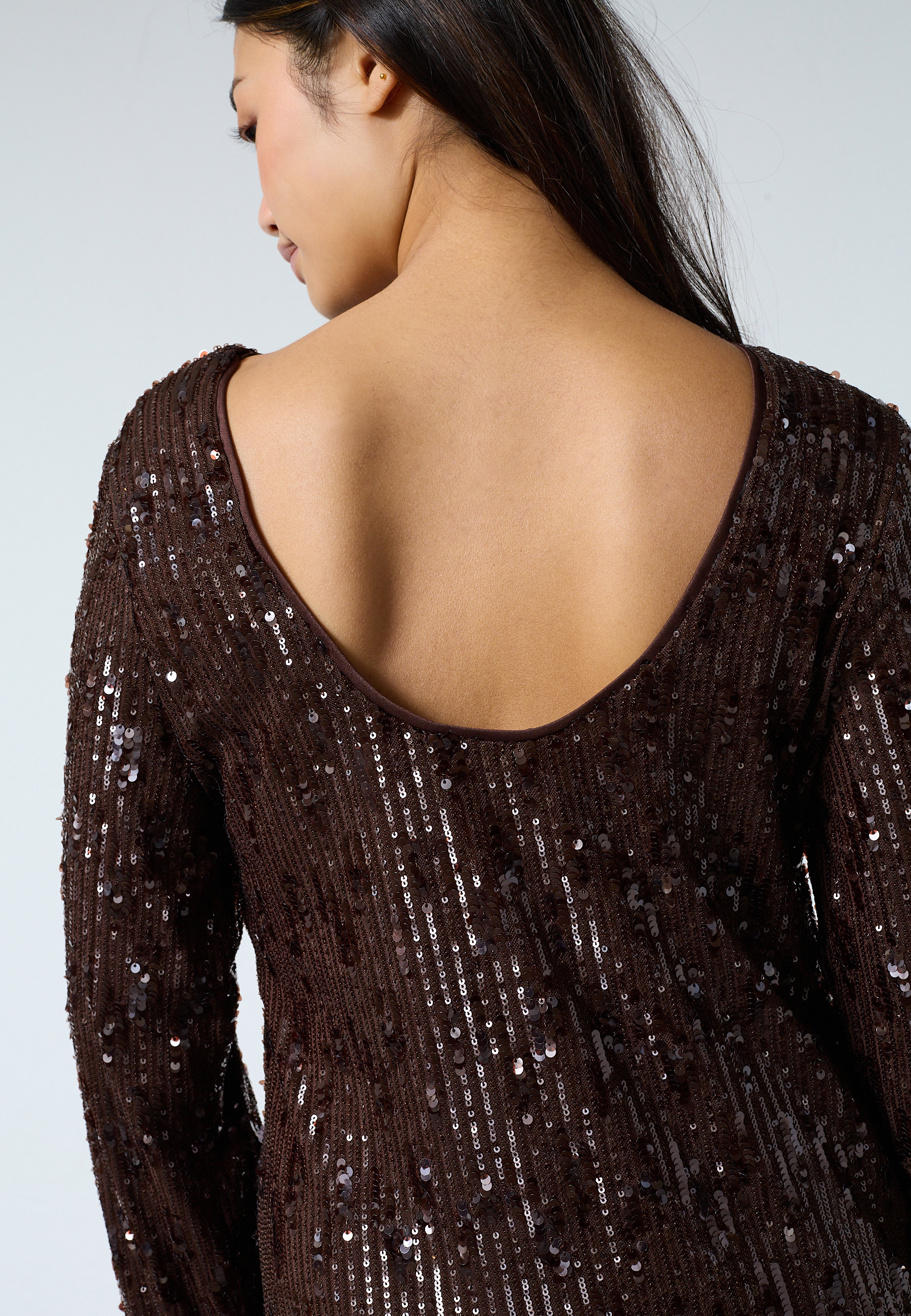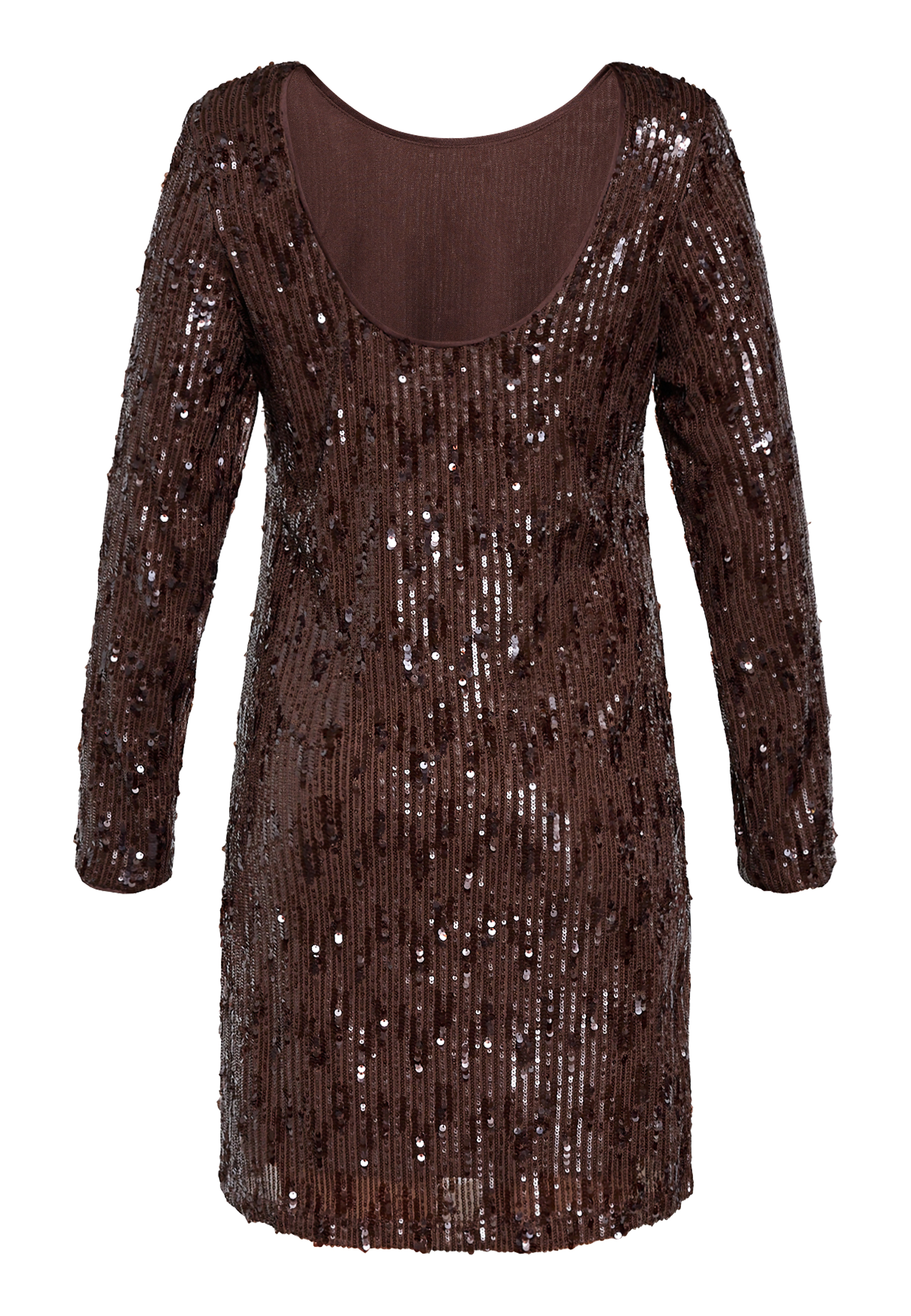 GAVEA-DR1 is a short evening dress with long sleeves. The dress is completely covered in shiny, overlapping sequins. It has a round neckline at the front and a deep, round neckline at the back. The model is wearing a size S