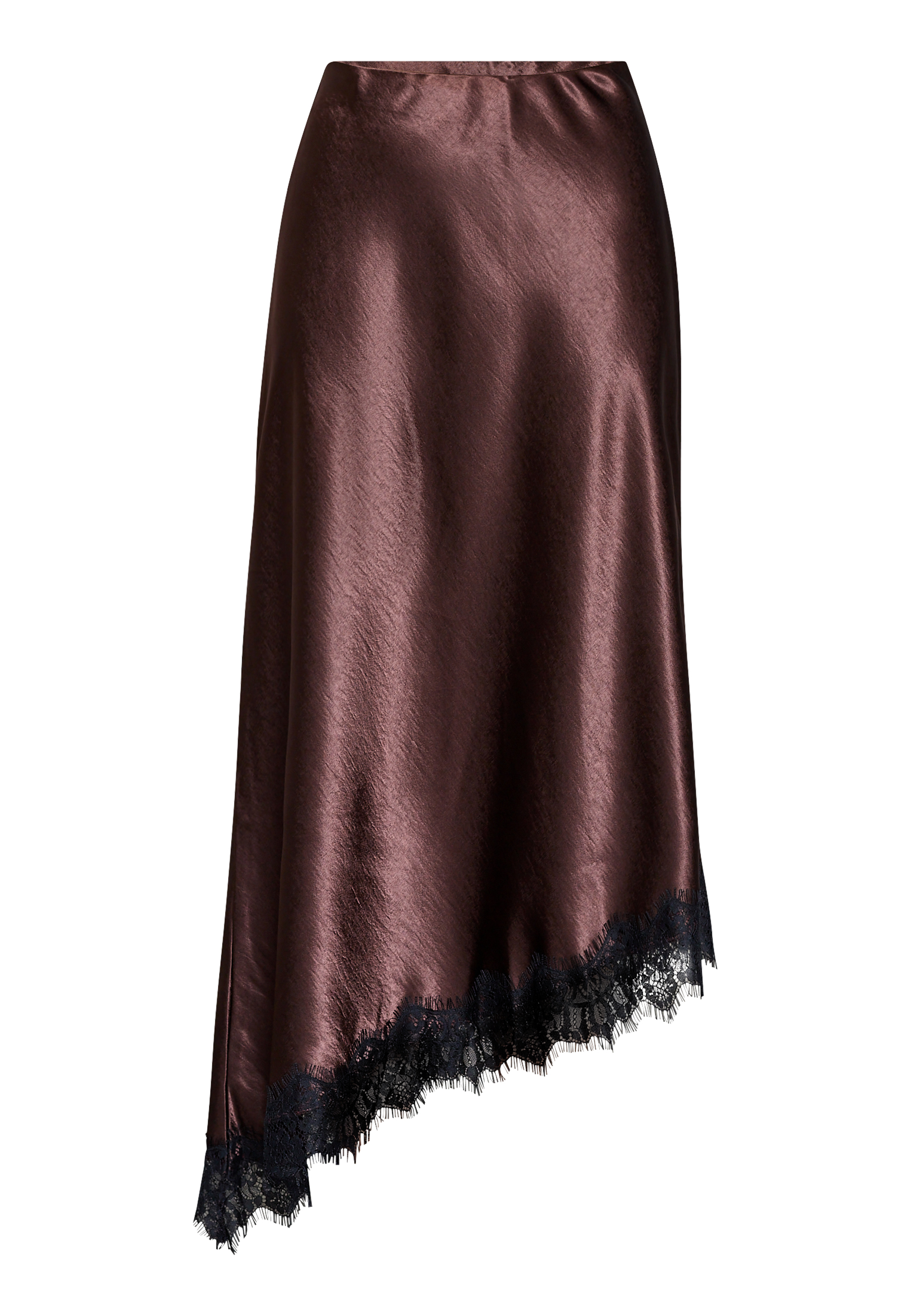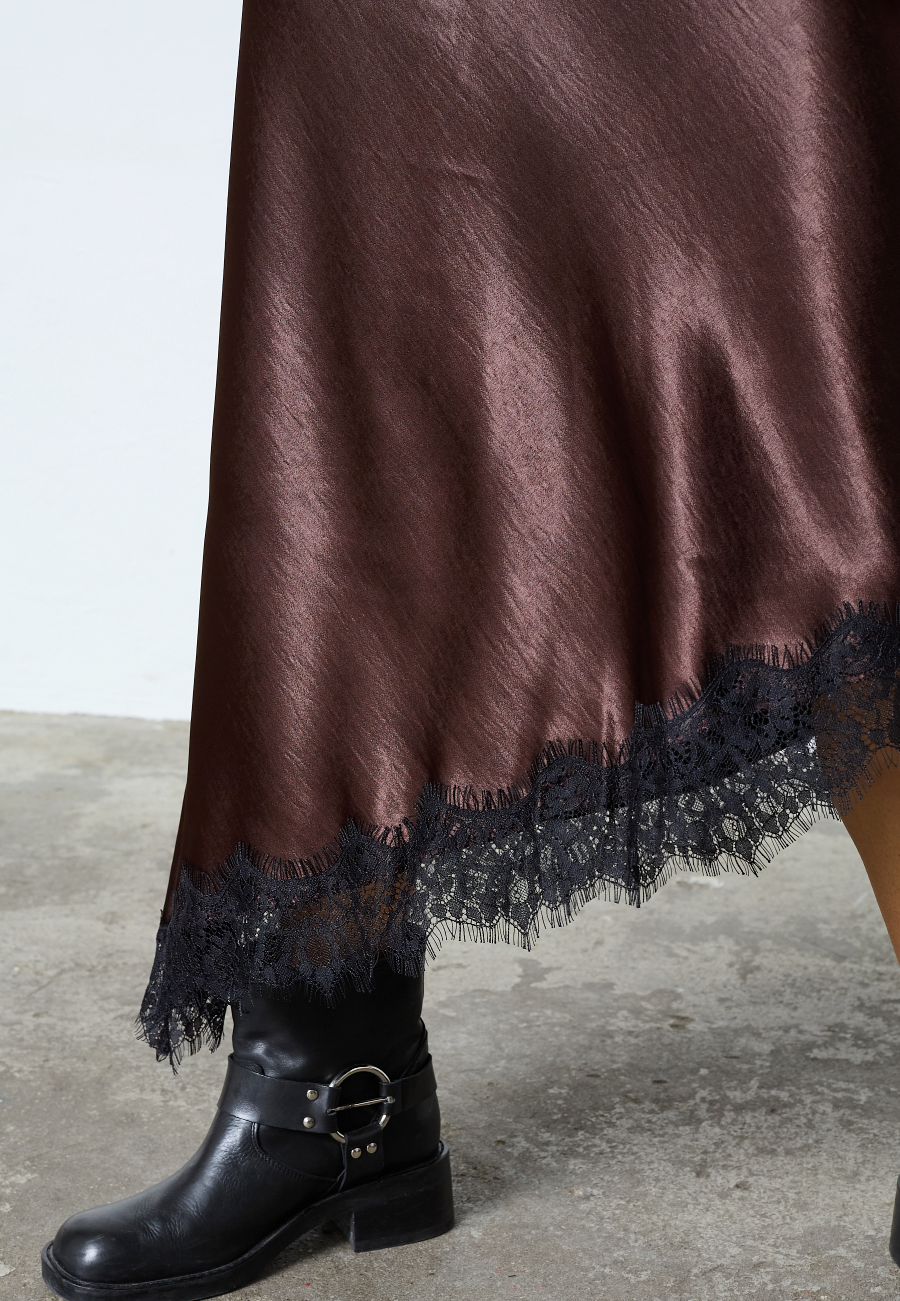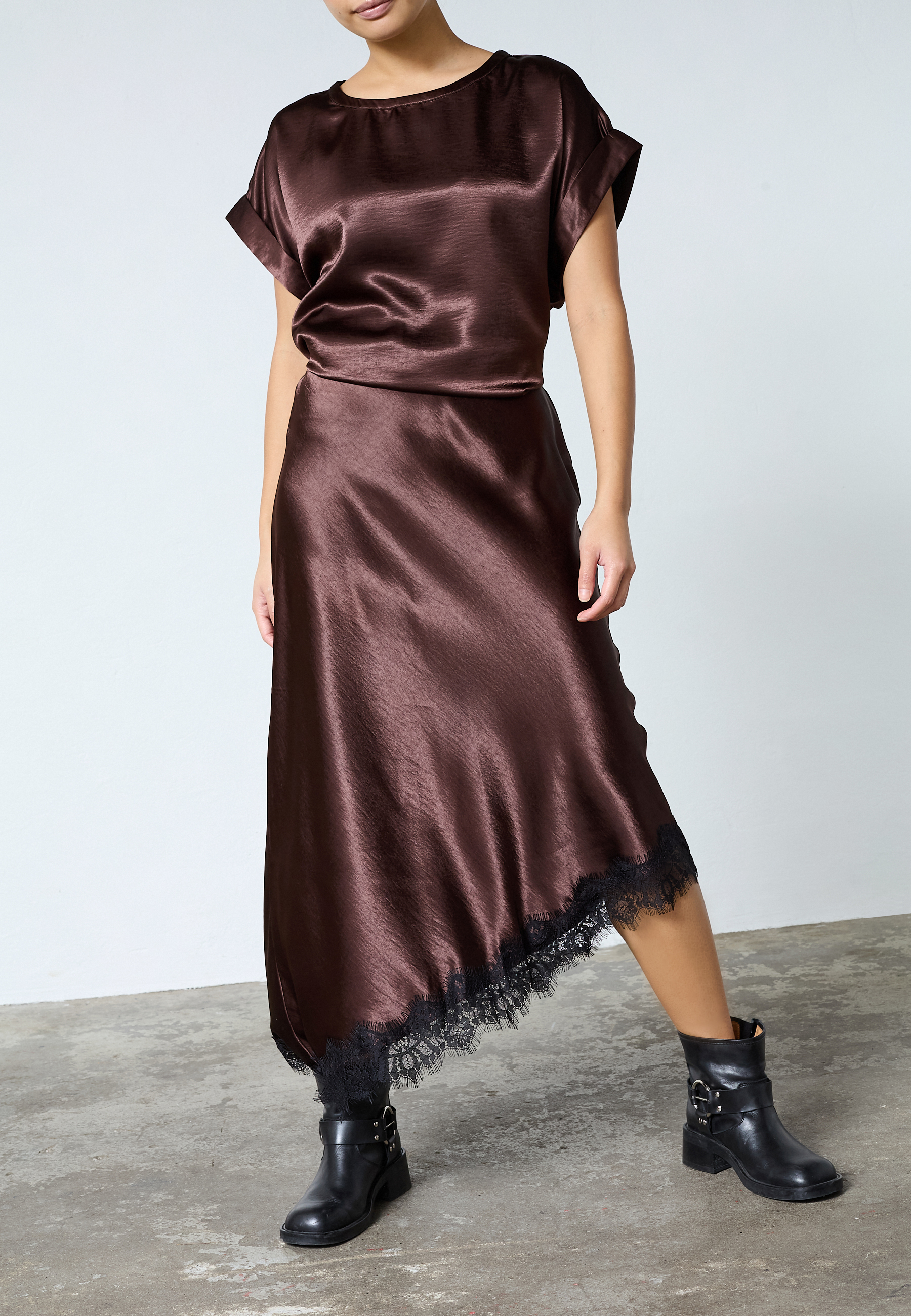 GEWO-LACE.SK is a midi skirt in a shiny satin look, woven material with an asymmetrical cut. It has a slanted cut edge that is detailed with elegant lace. The model is wearing a size S