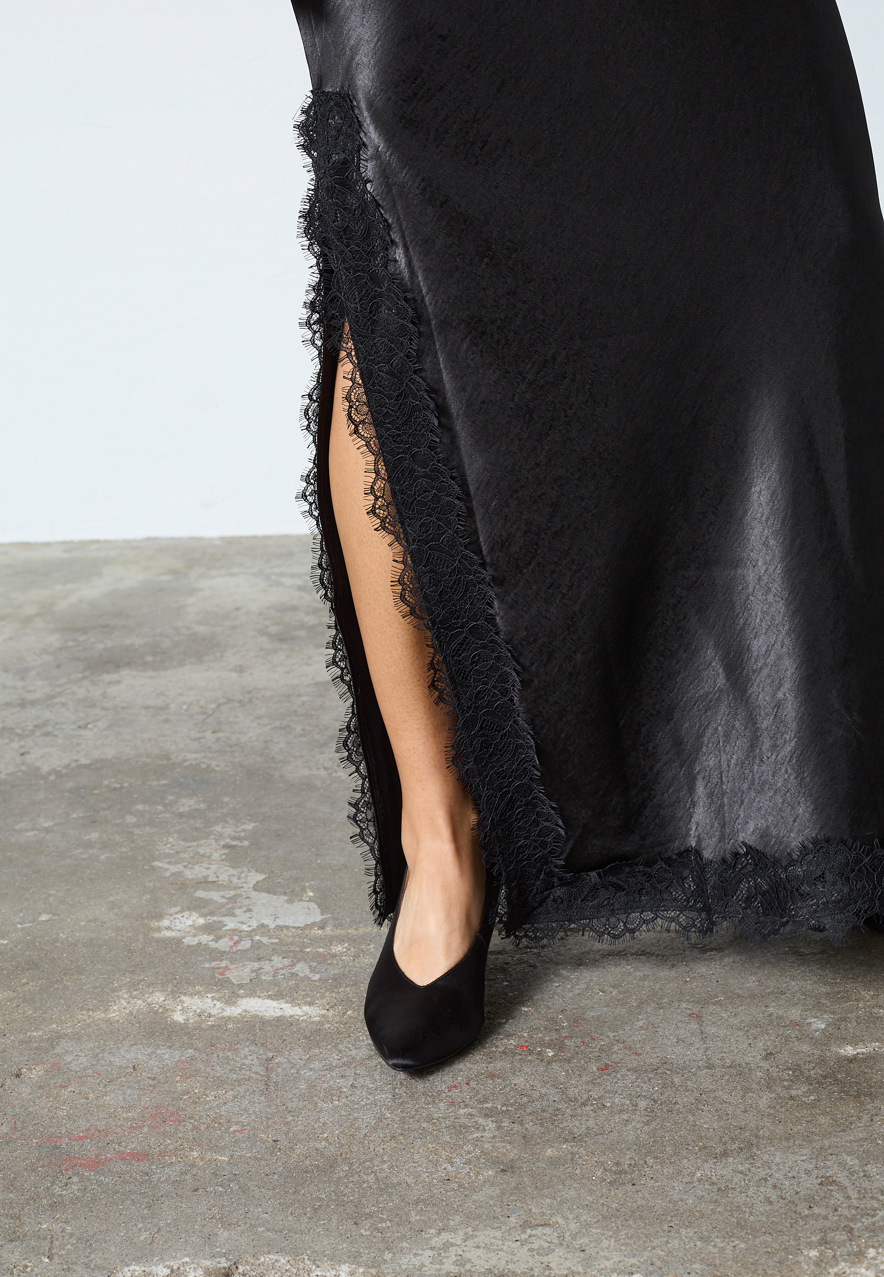 N.ERO-DR1 is a beautiful long satin look dress with a slit in the side with lace details. It has thin adjustable straps and a v-neck. The dress has a feminine fit with a zipper at the waist. The model is wearing a size S