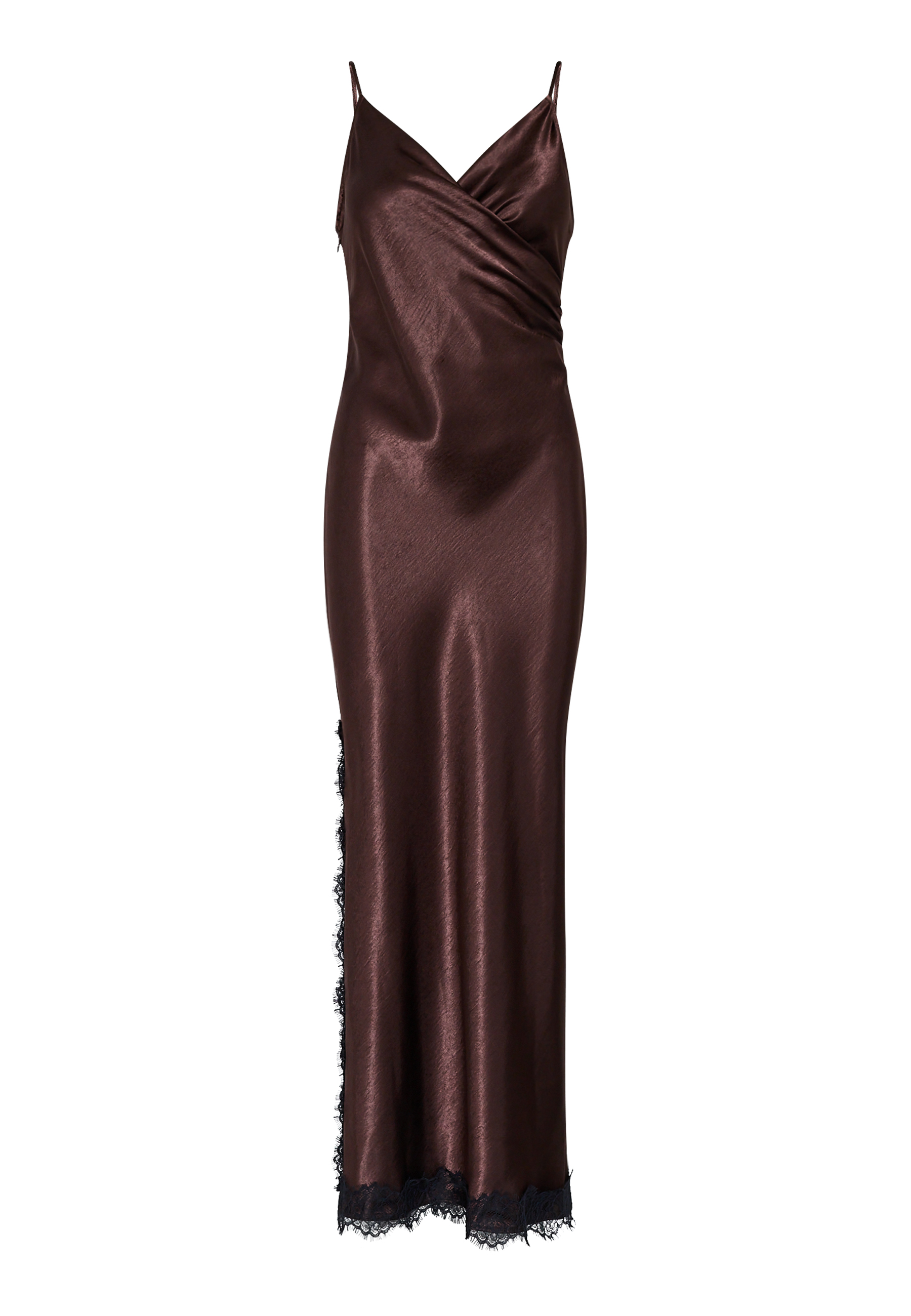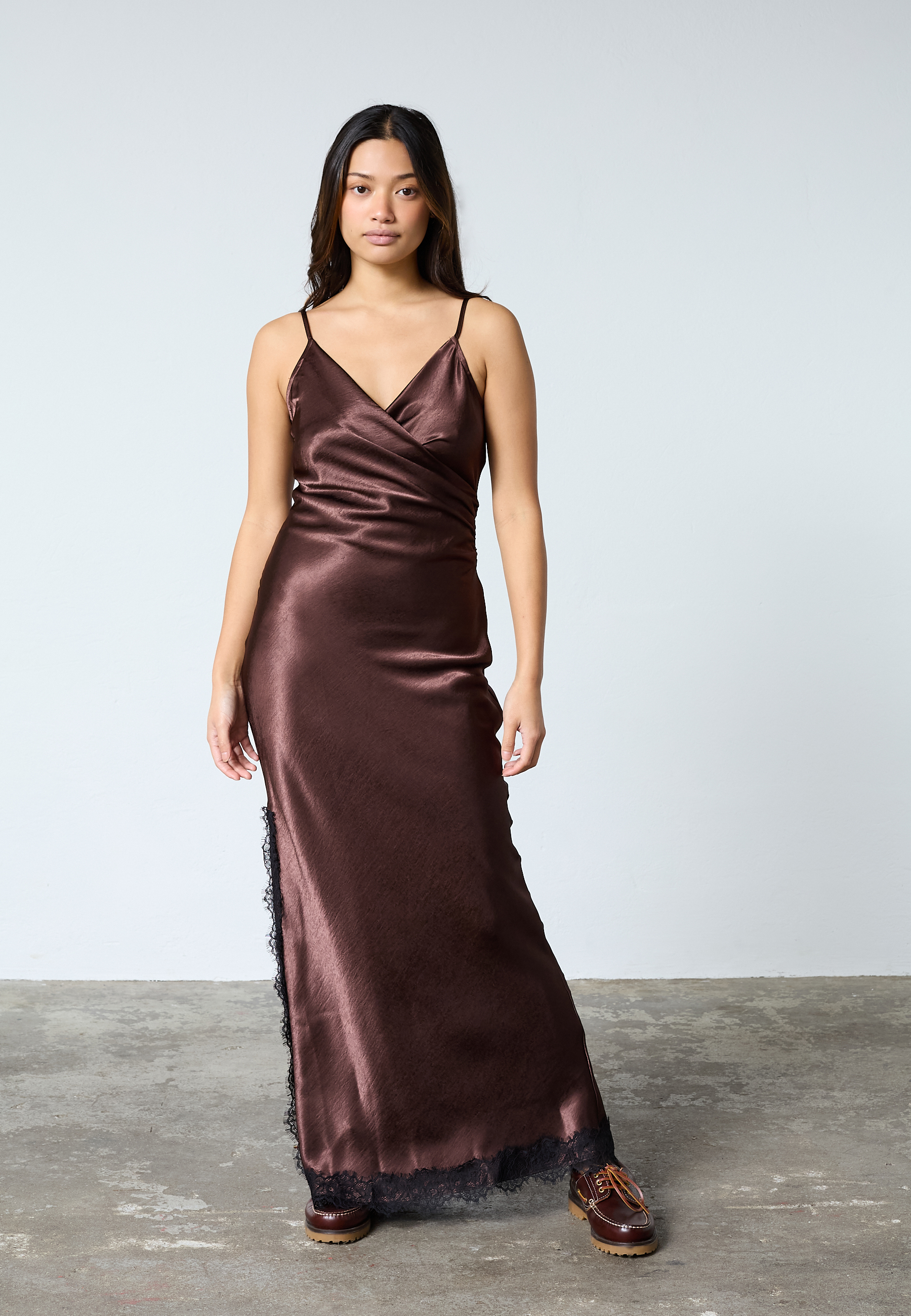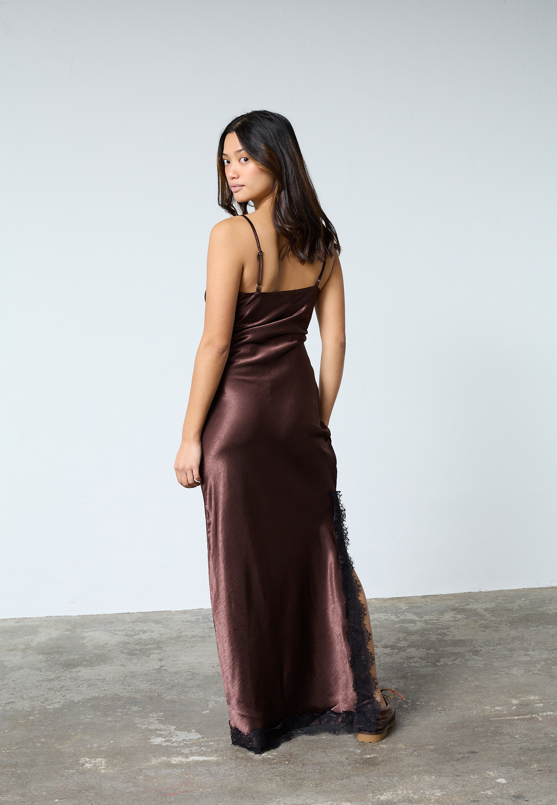 N.ERO-DR1 is a beautiful long satin look dress with a slit in the side with lace details. It has thin adjustable straps and a v-neck. The dress has a feminine fit with a zipper at the waist. The model is wearing a size S