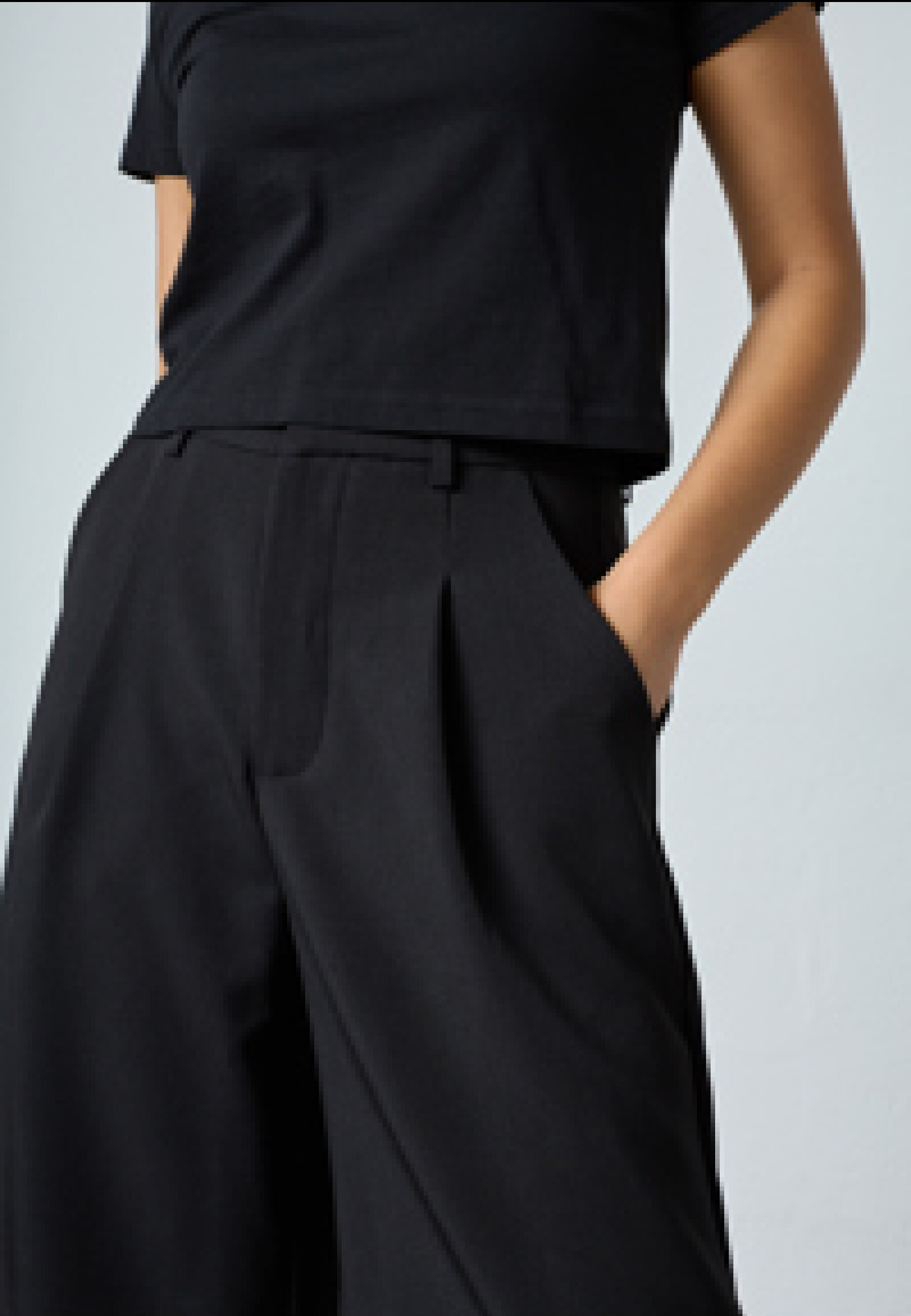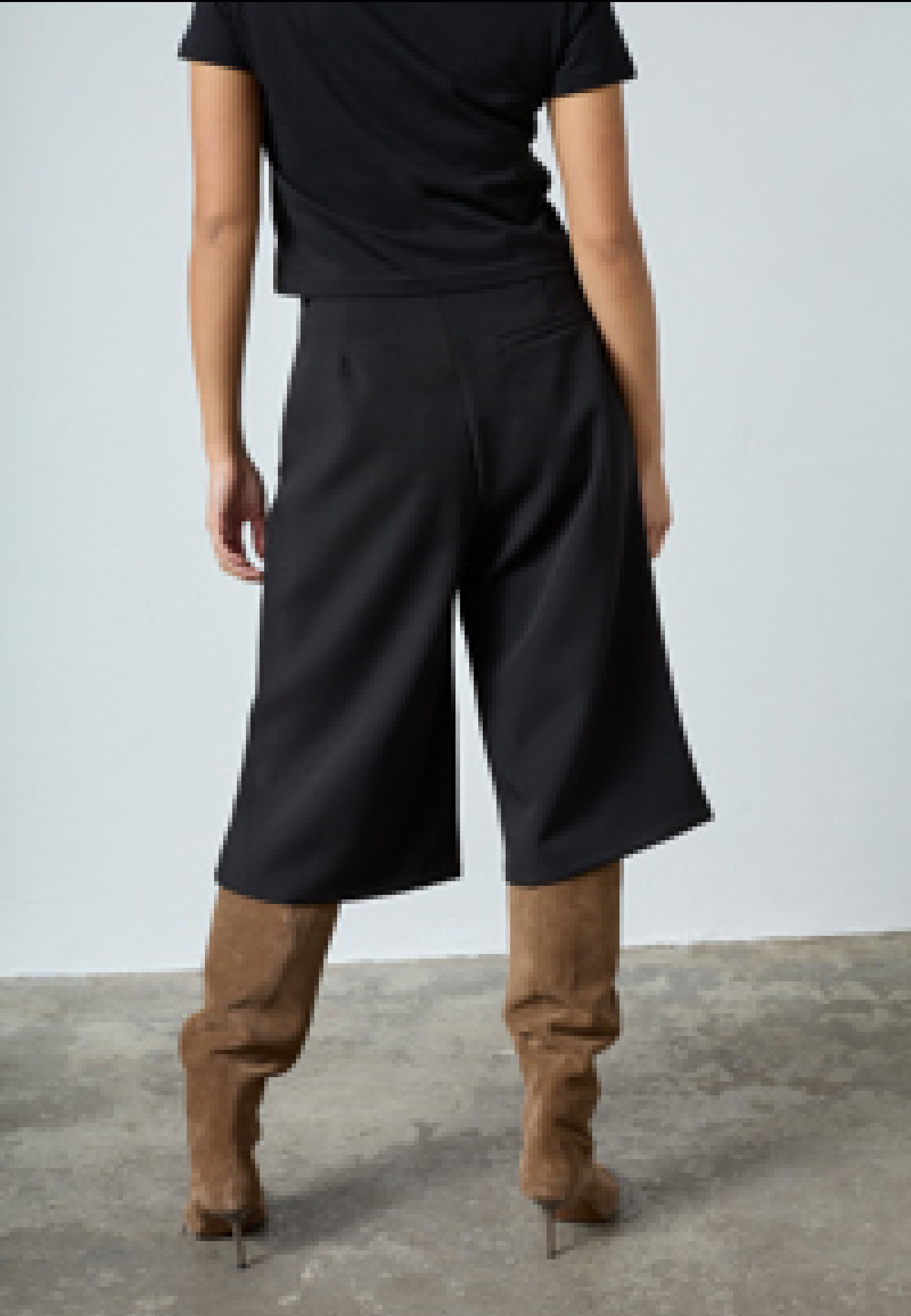 GREAT-L.SHO2 is a pair of culotte shorts with a loose fit to just above the knee, pleats at the front and side pockets. The model is wearing size S