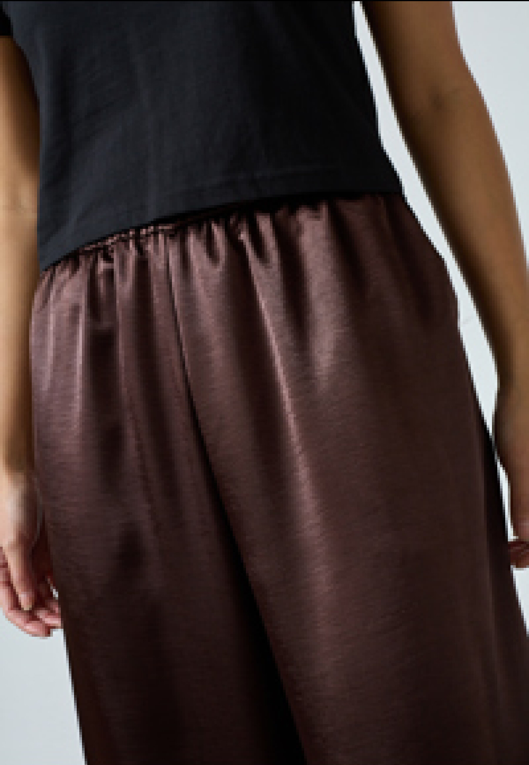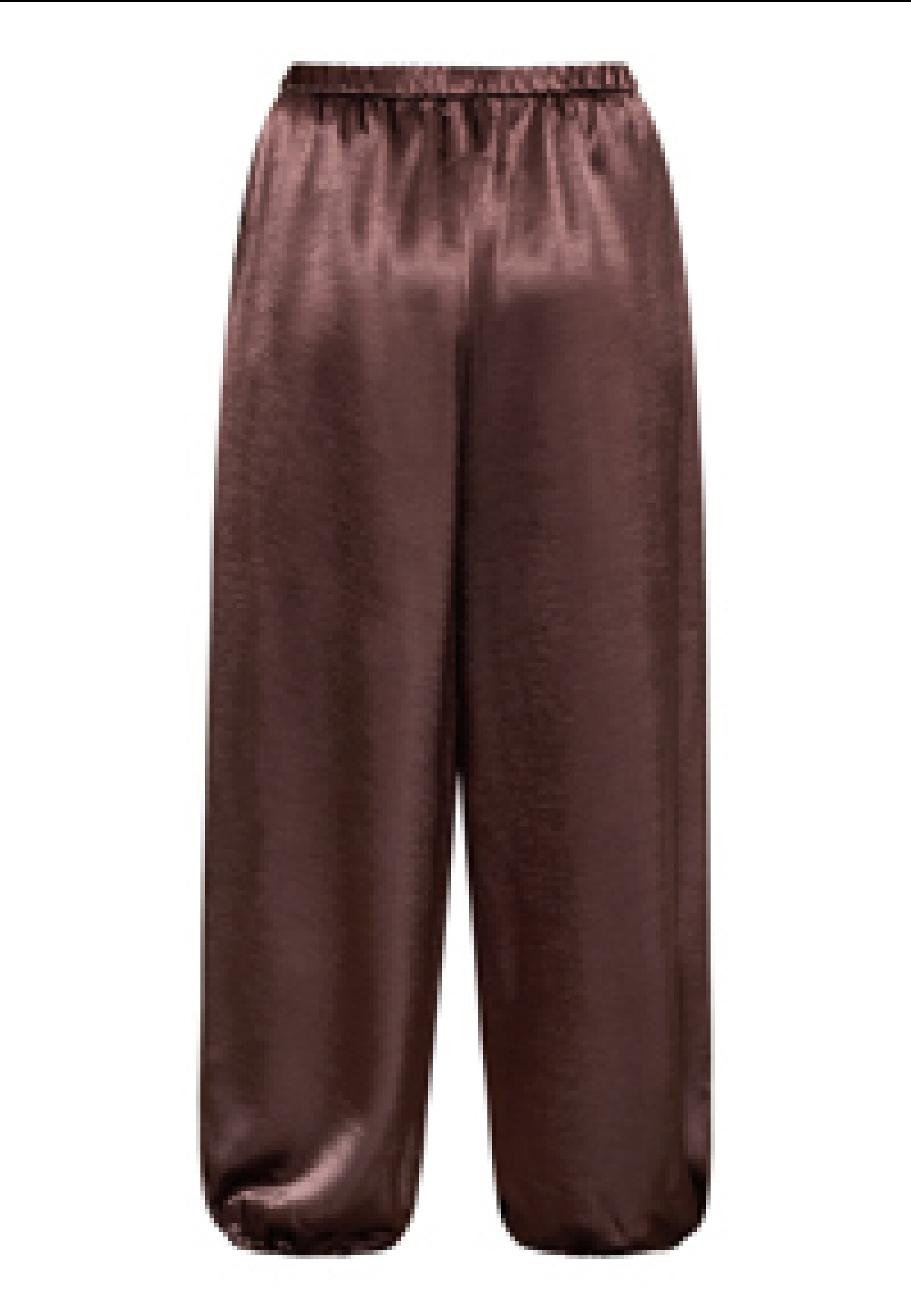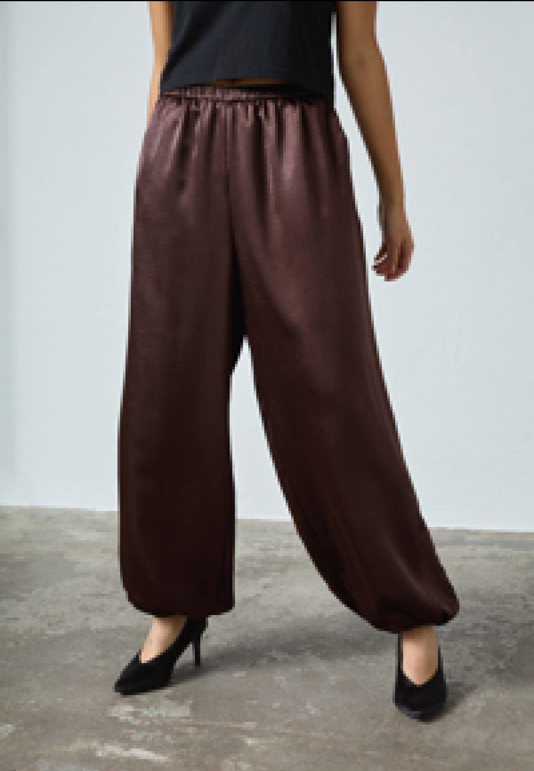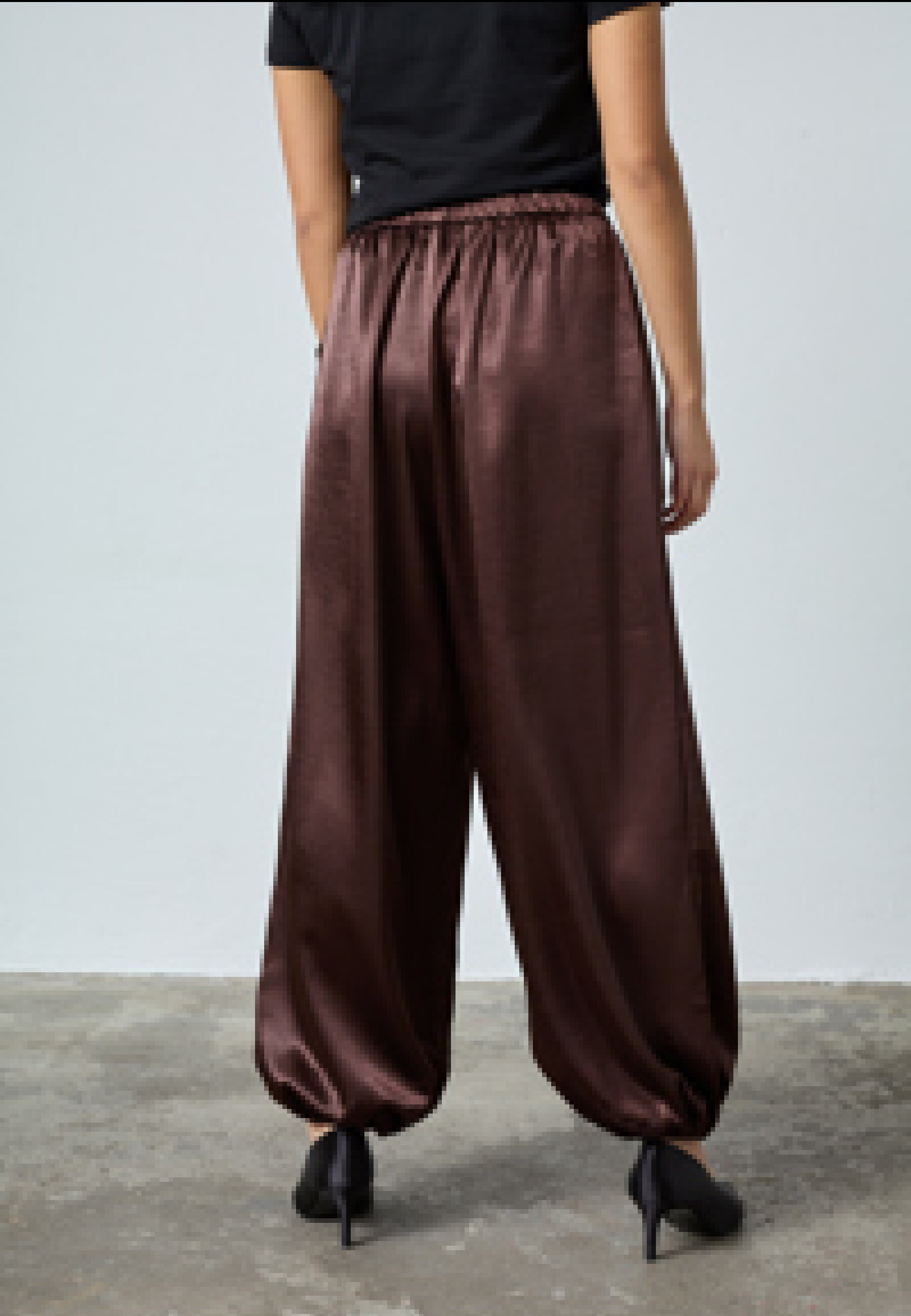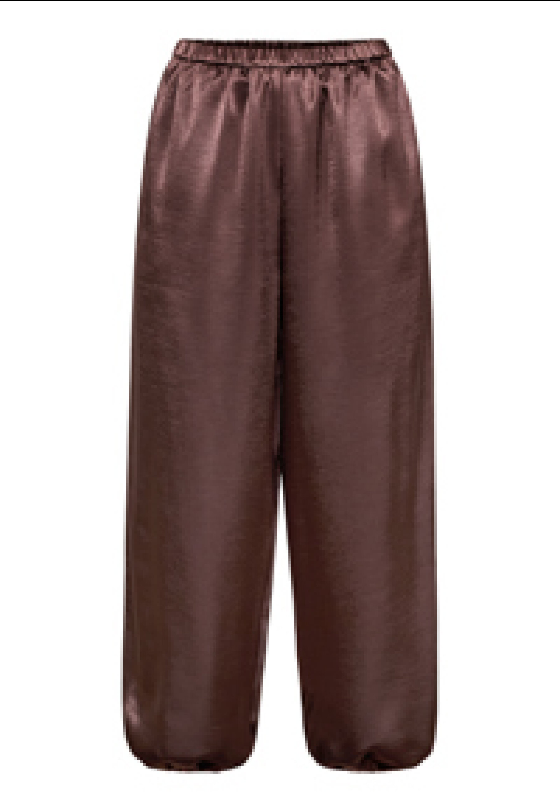 GEWO-PA are a pair of trousers in a smooth, shiny material with an elastic waistband. They have a voluminous, relaxed silhouette with side pockets and are finished with an elastic band at the ankle for a balloon-shaped effect. The model is a size S