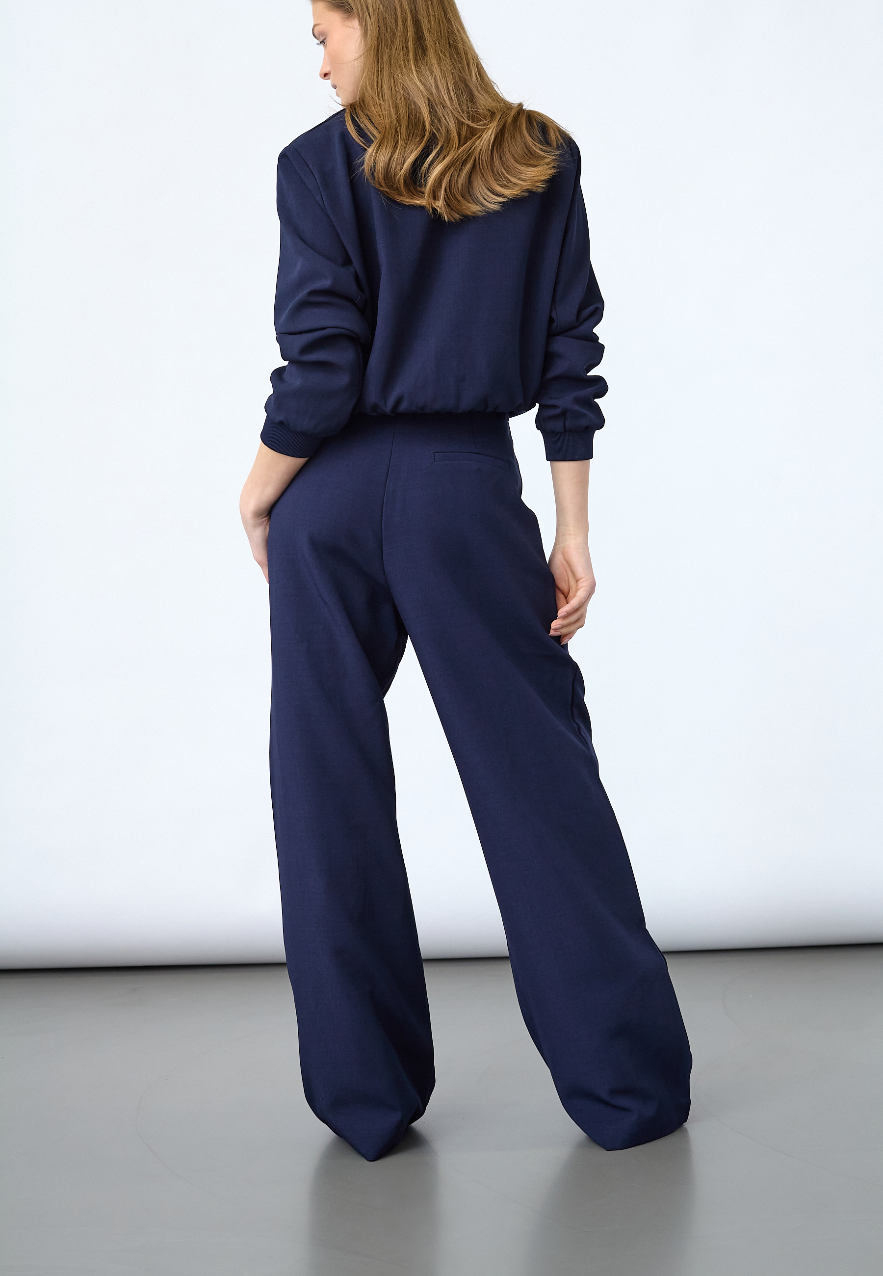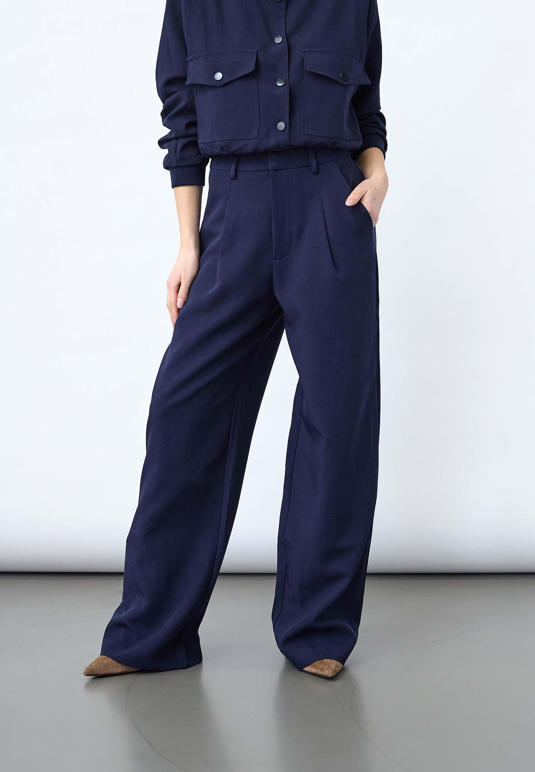 GREAT-PA3 is a loose trouser with wide legs and a clean cut. It features a comfortable fit with front pleats and practical side pockets, perfect for an elegant yet relaxed look. The model is wearing size S and is 171 cm tall.