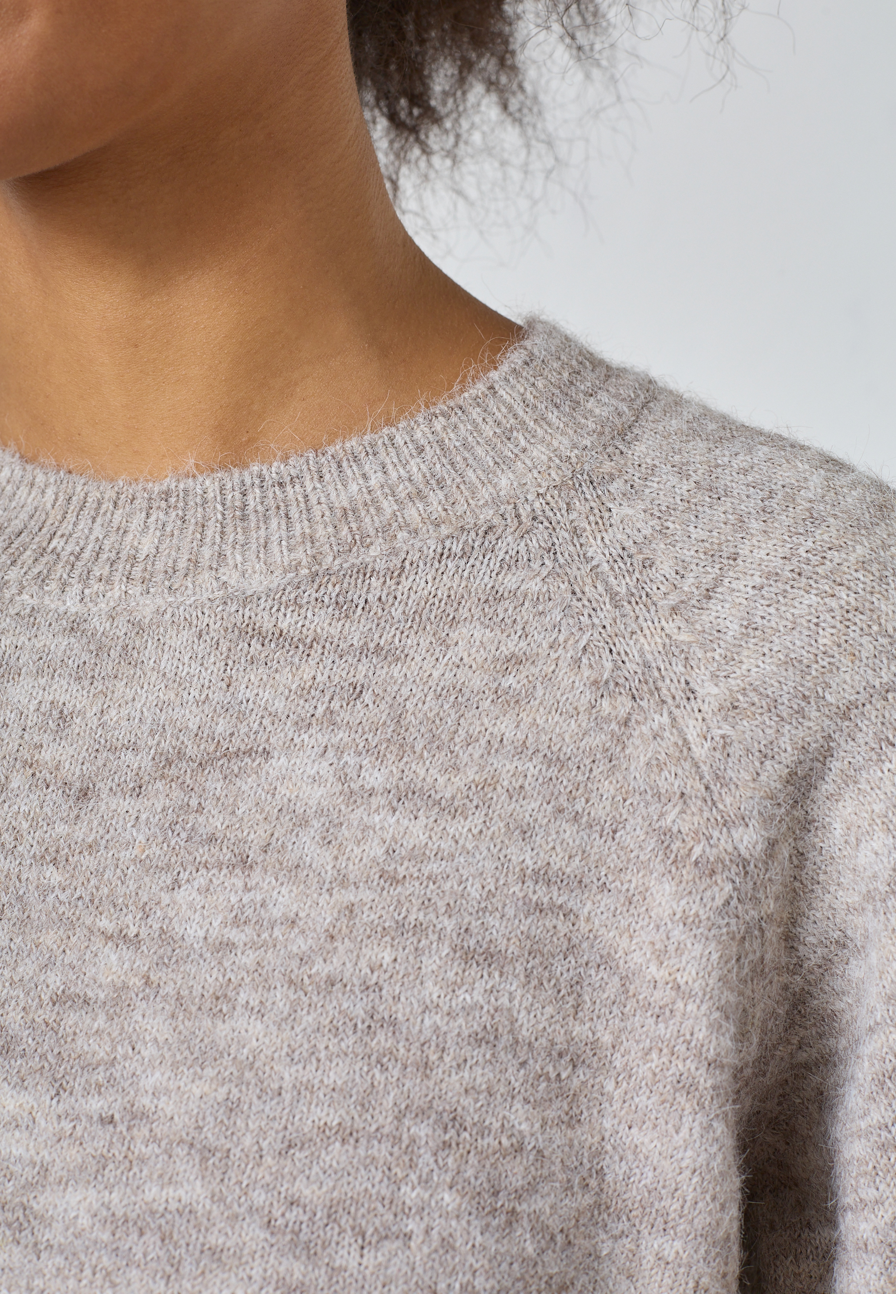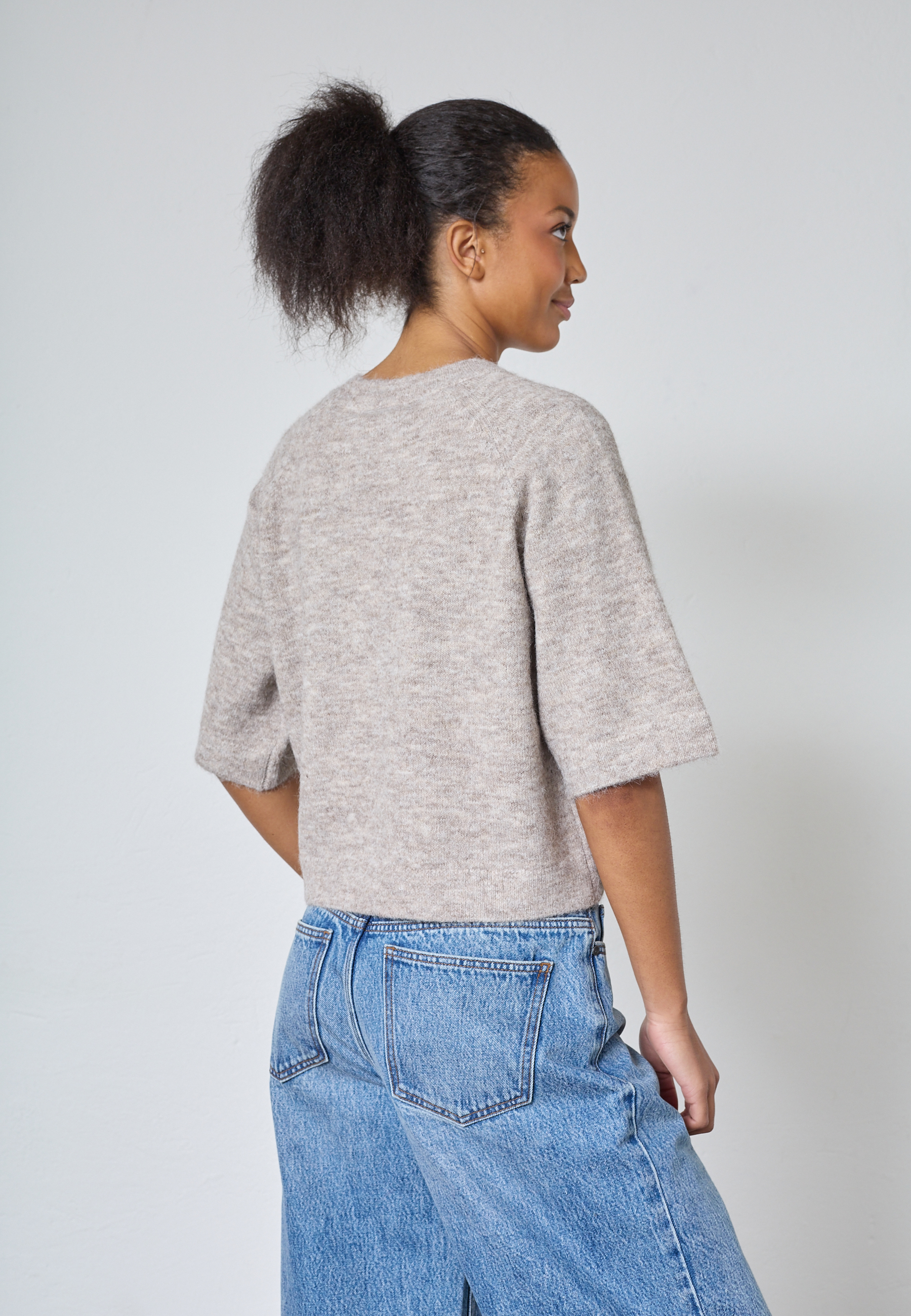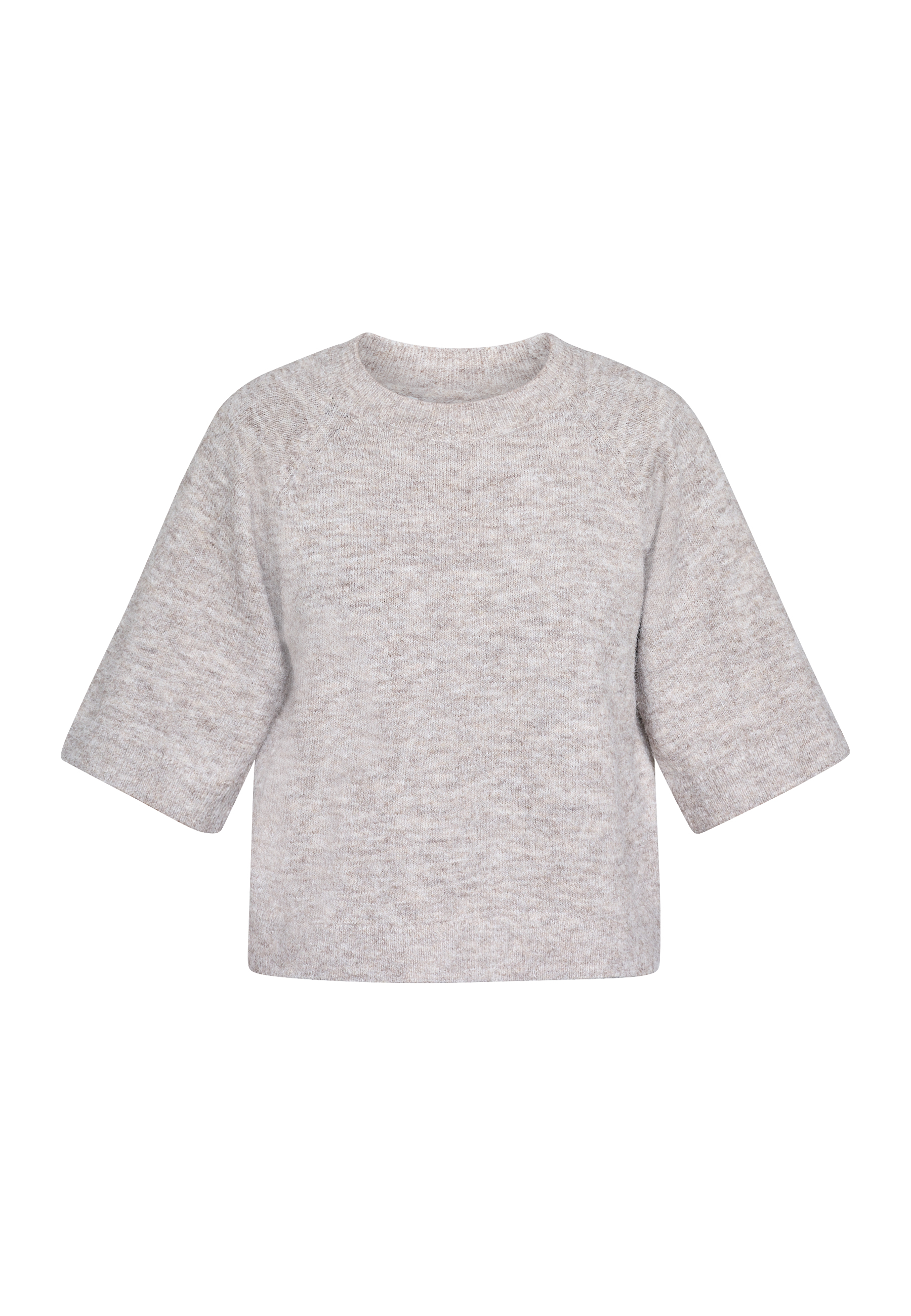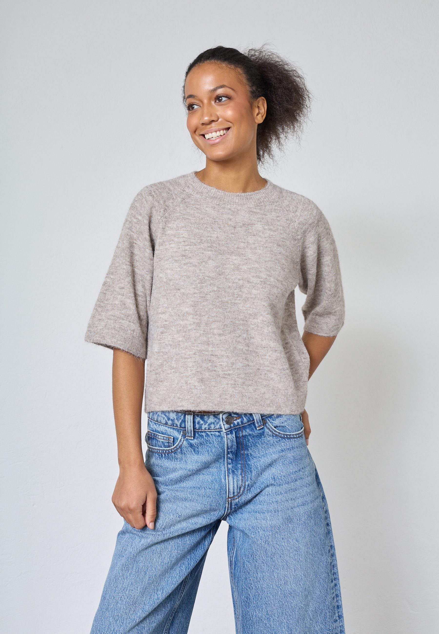 KAPPO-PU is a sweater made from a soft, heathered yarn and has a short, lightweight fit. It is designed with width in the body, a round neckline, and three-quarter length sleeves. The model is wearing a size S.