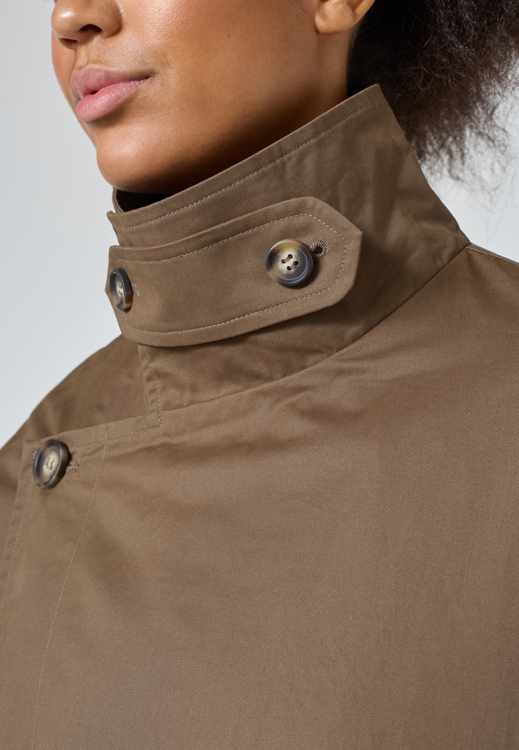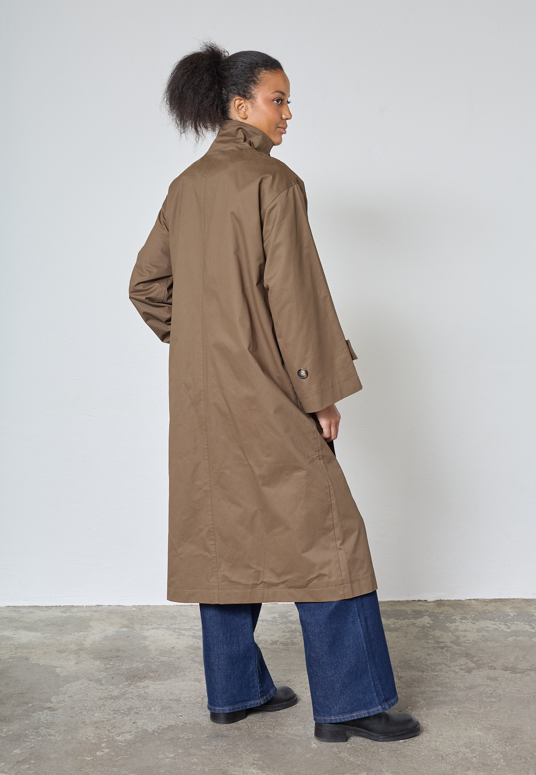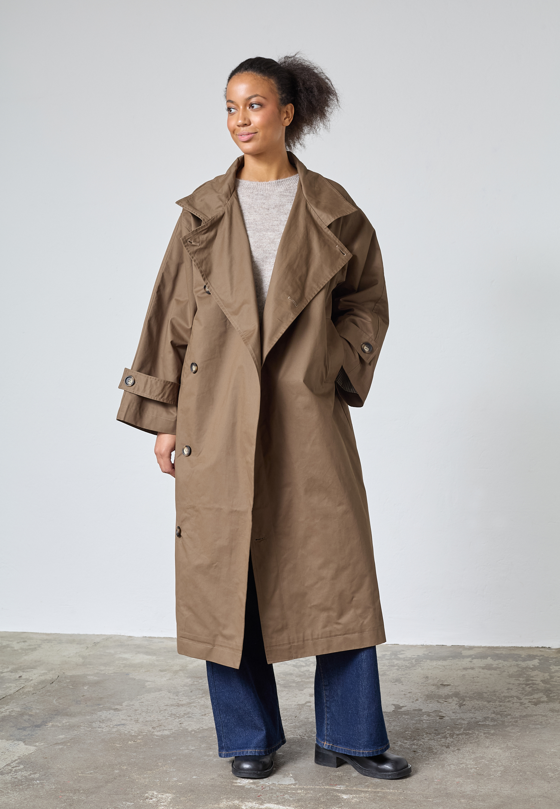 DAR-N.TRENCH1 is a trendy long and oversized trenchcoat. The trenchcoat has two pockets, a button closure and a high neck, with a removable button closure. The model is wearing a size S
