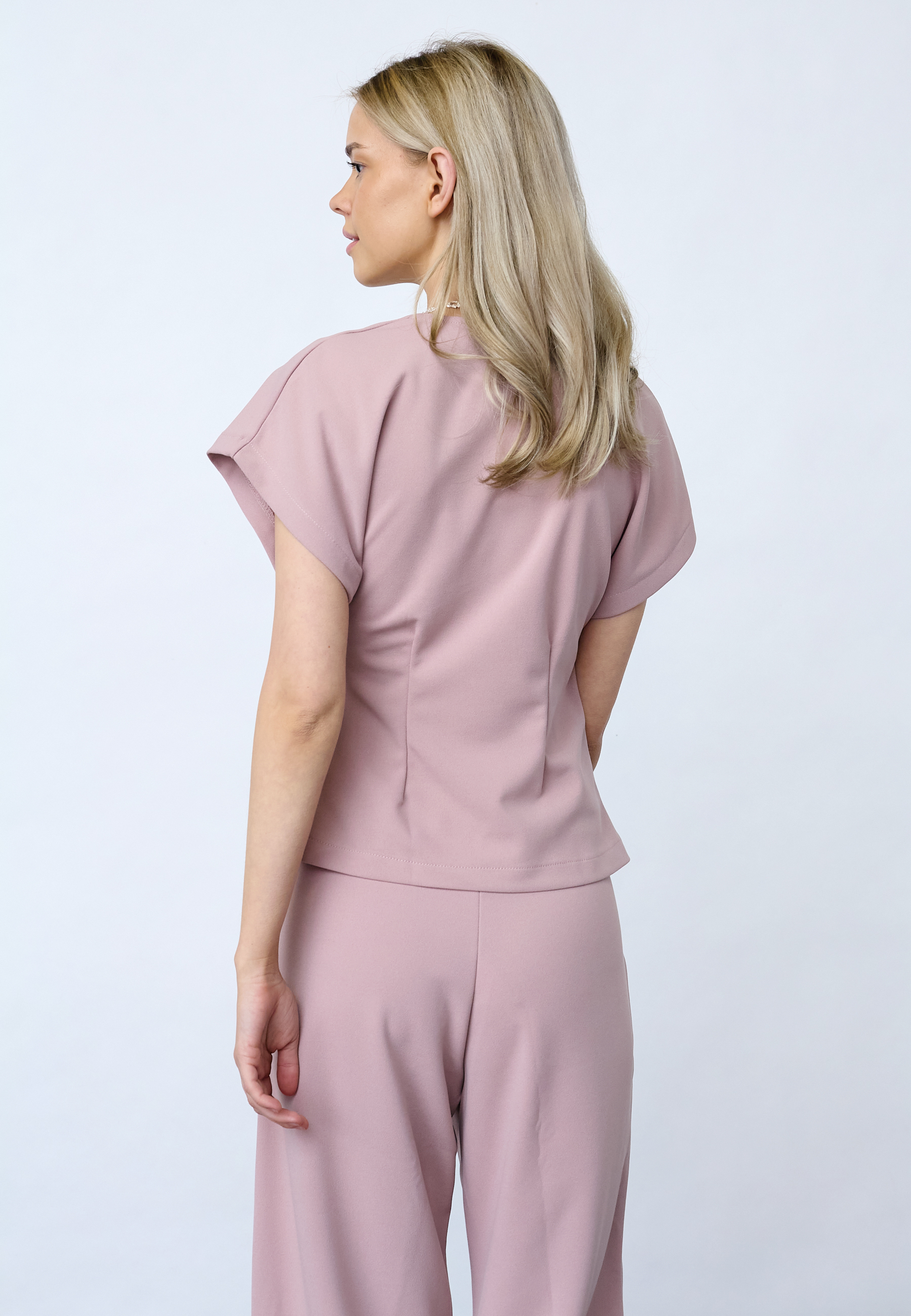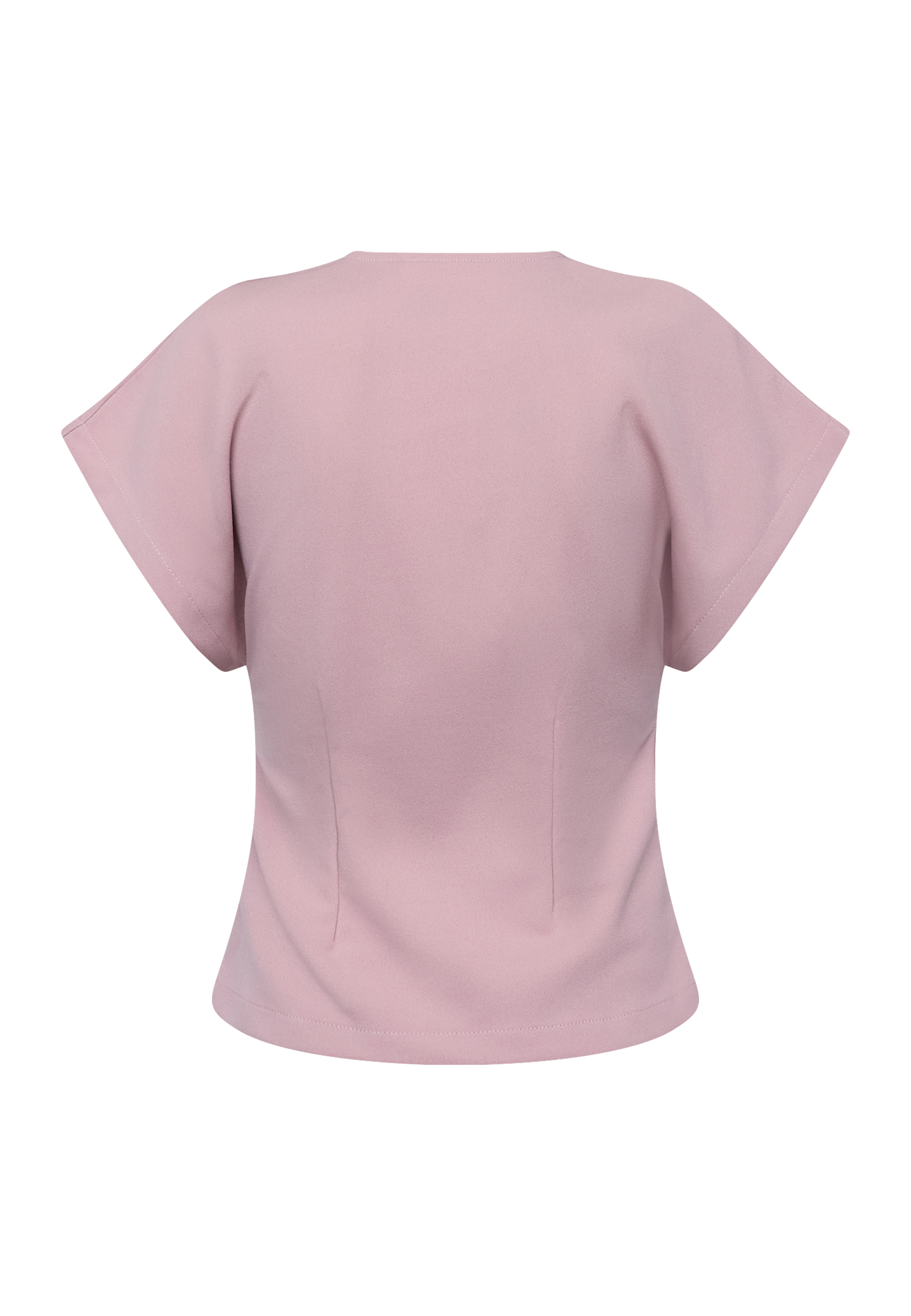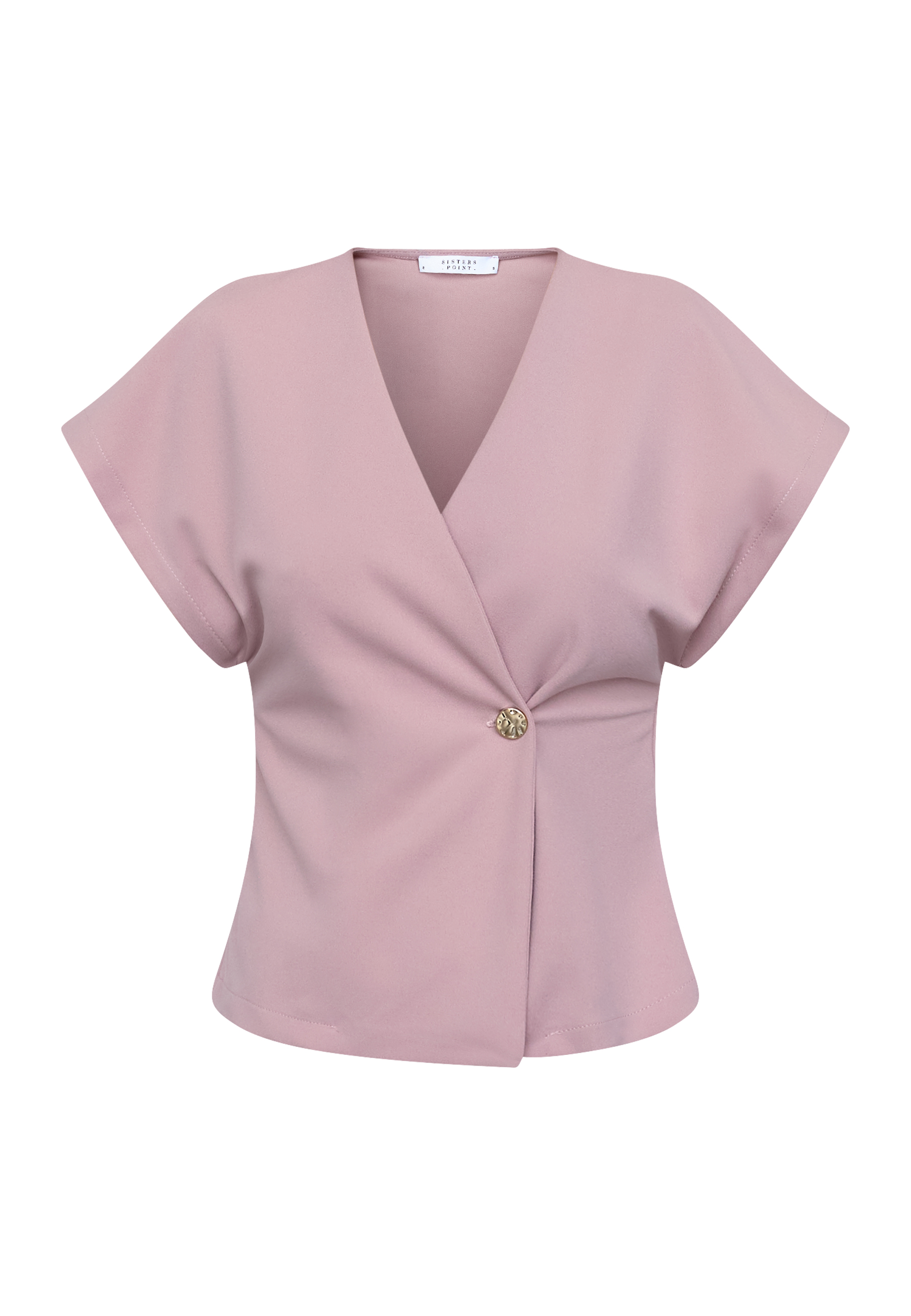 GEVELA-VE is a short-sleeved top with a deep V-neckline and an asymmetrical side closure with a single gold button. The top has slightly marked shoulders and a fitted silhouette. The model has a size S on.