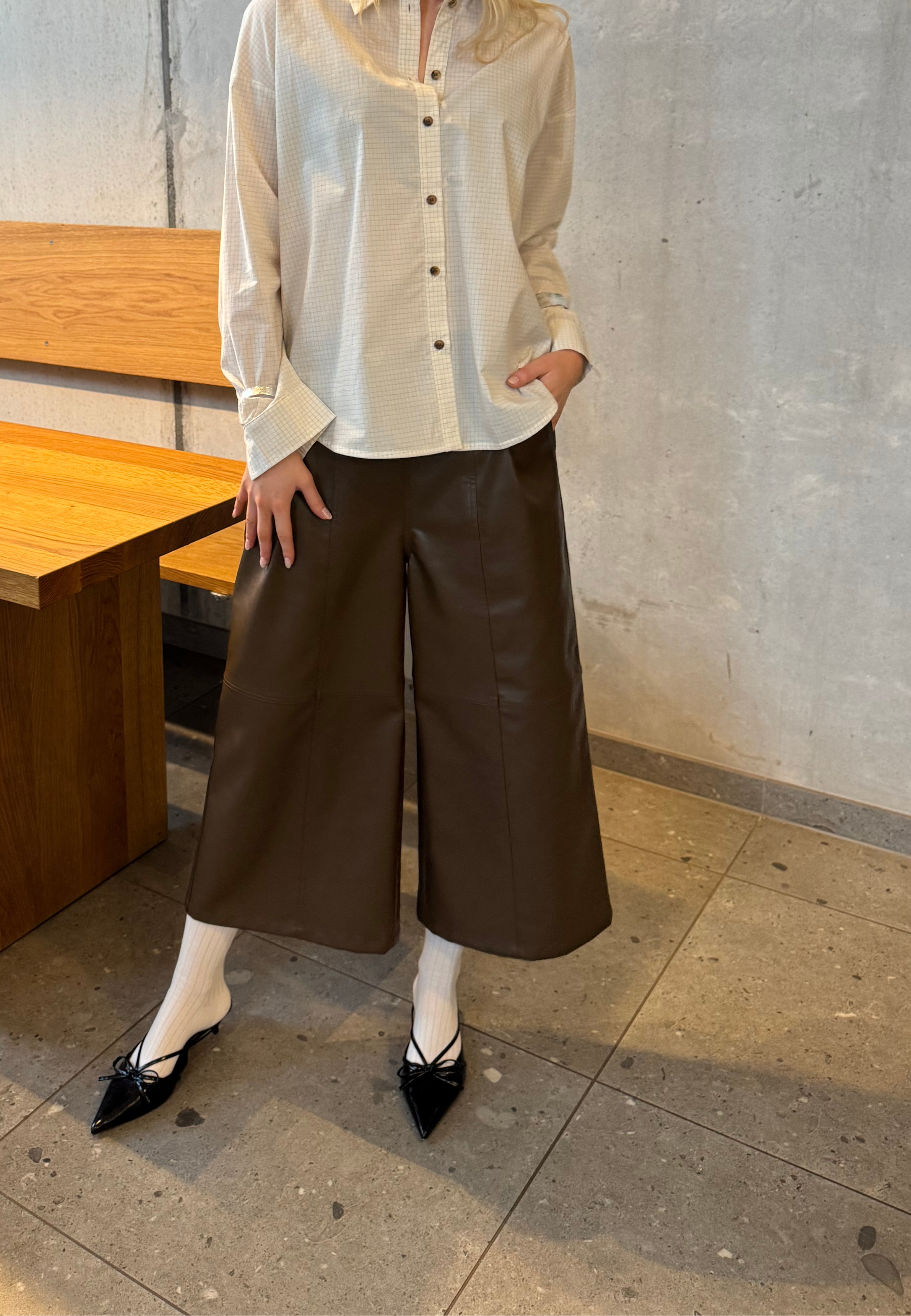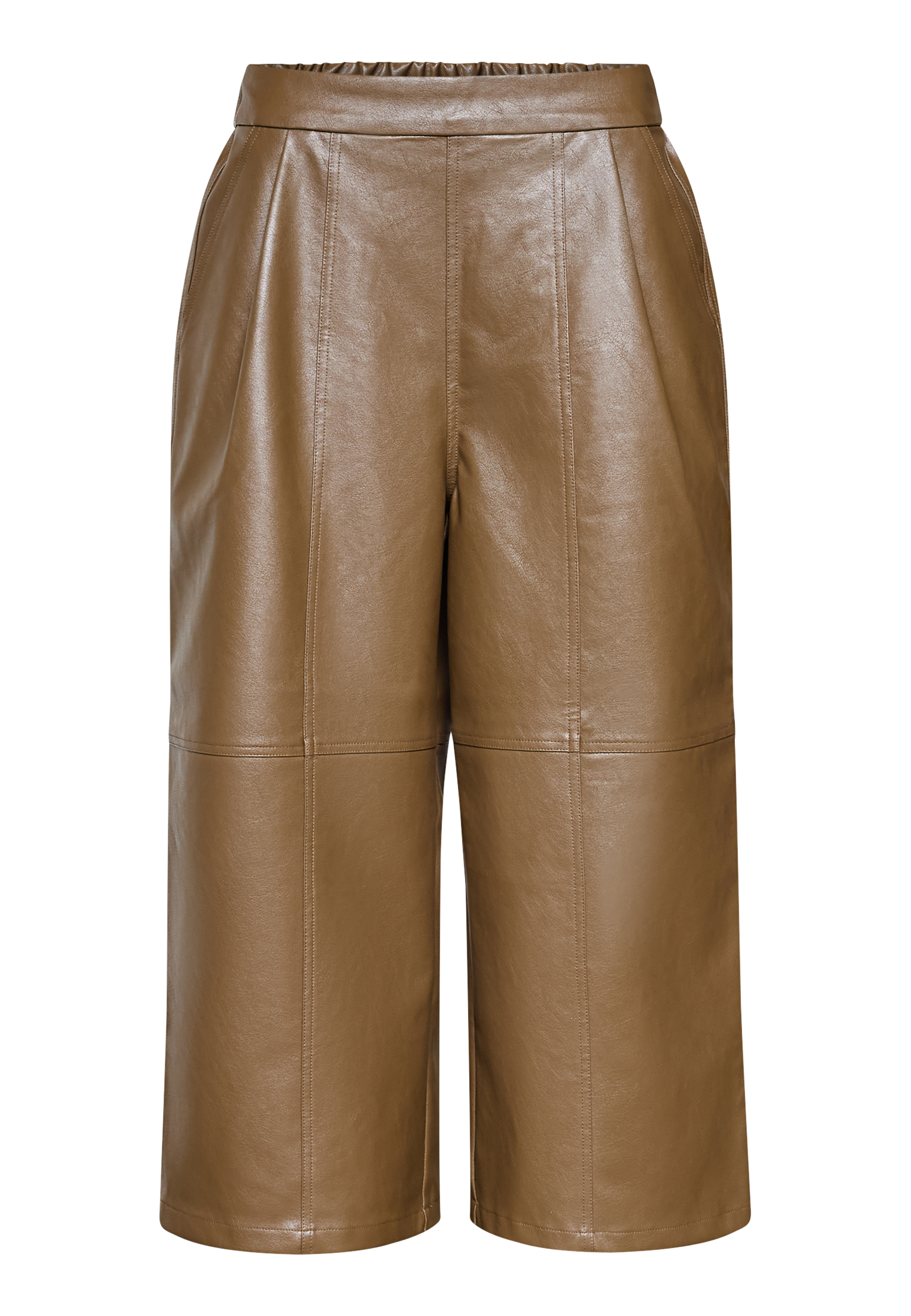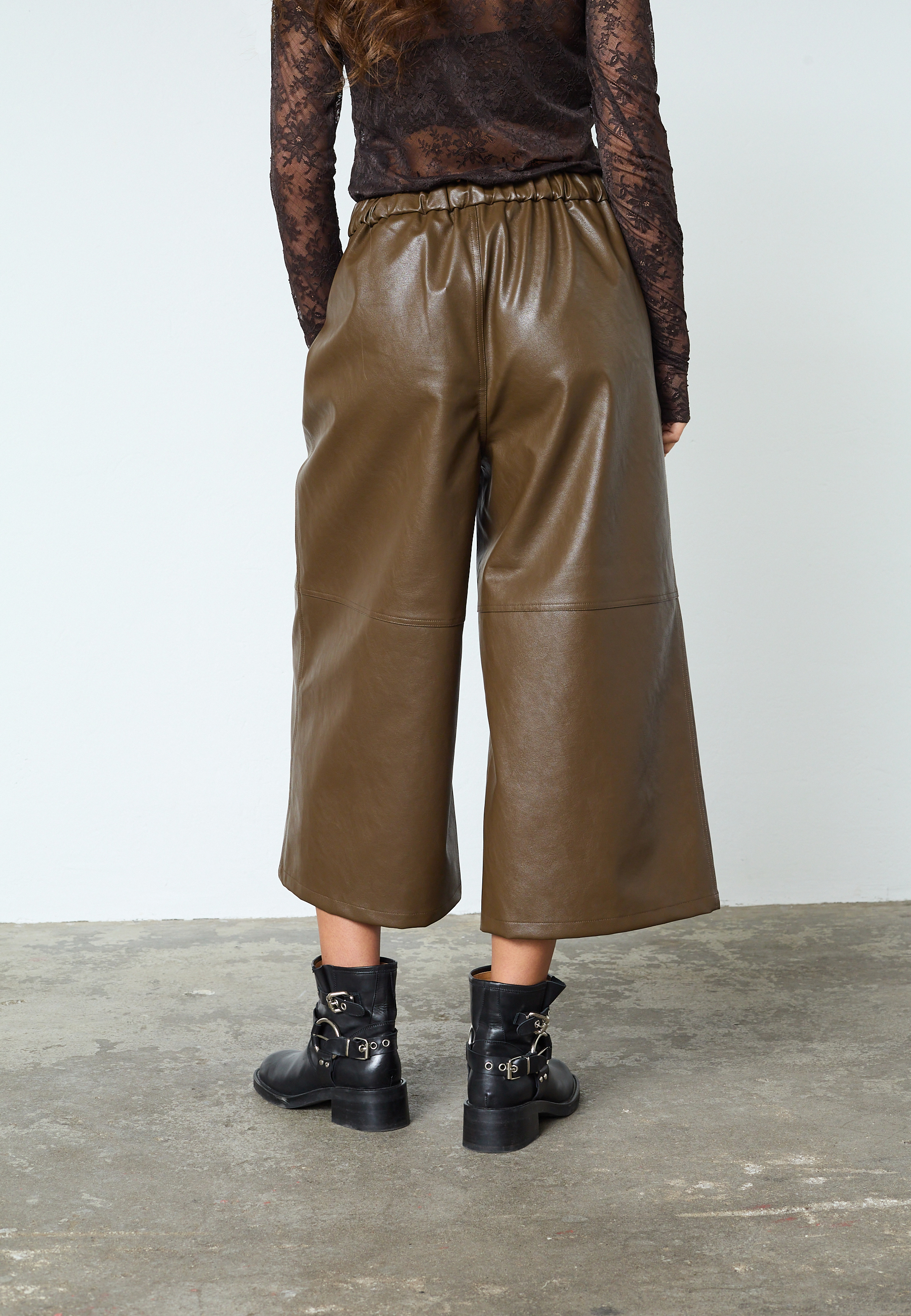 EMME-PA are a pair of culotte trousers in a leather-look.. They have a comfortable elastic waistband. The trousers have a relaxed fit and feature side pockets. The model is wearing a size S and is 175 cm tall.