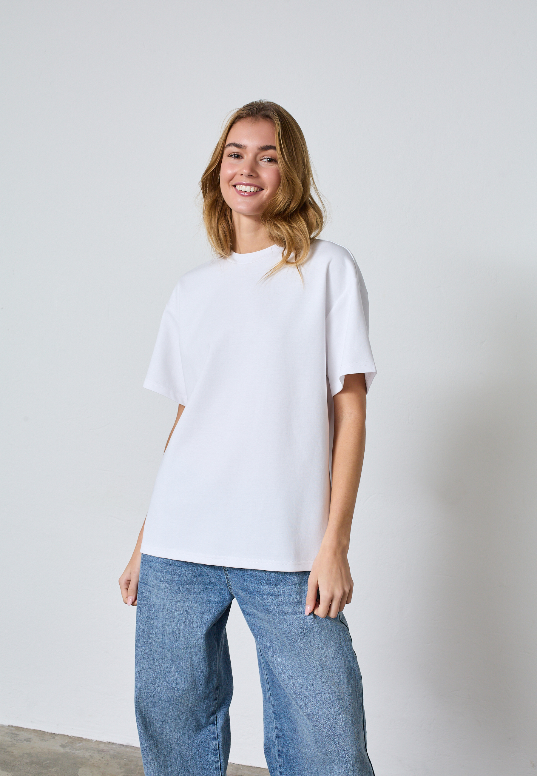 VEDA-SS is an oversized t-shirt with a modern box fit. Designed in heavy cotton with a classic crewneck and loose sleeves for a cool streetwear look. The model is wearing a size S.