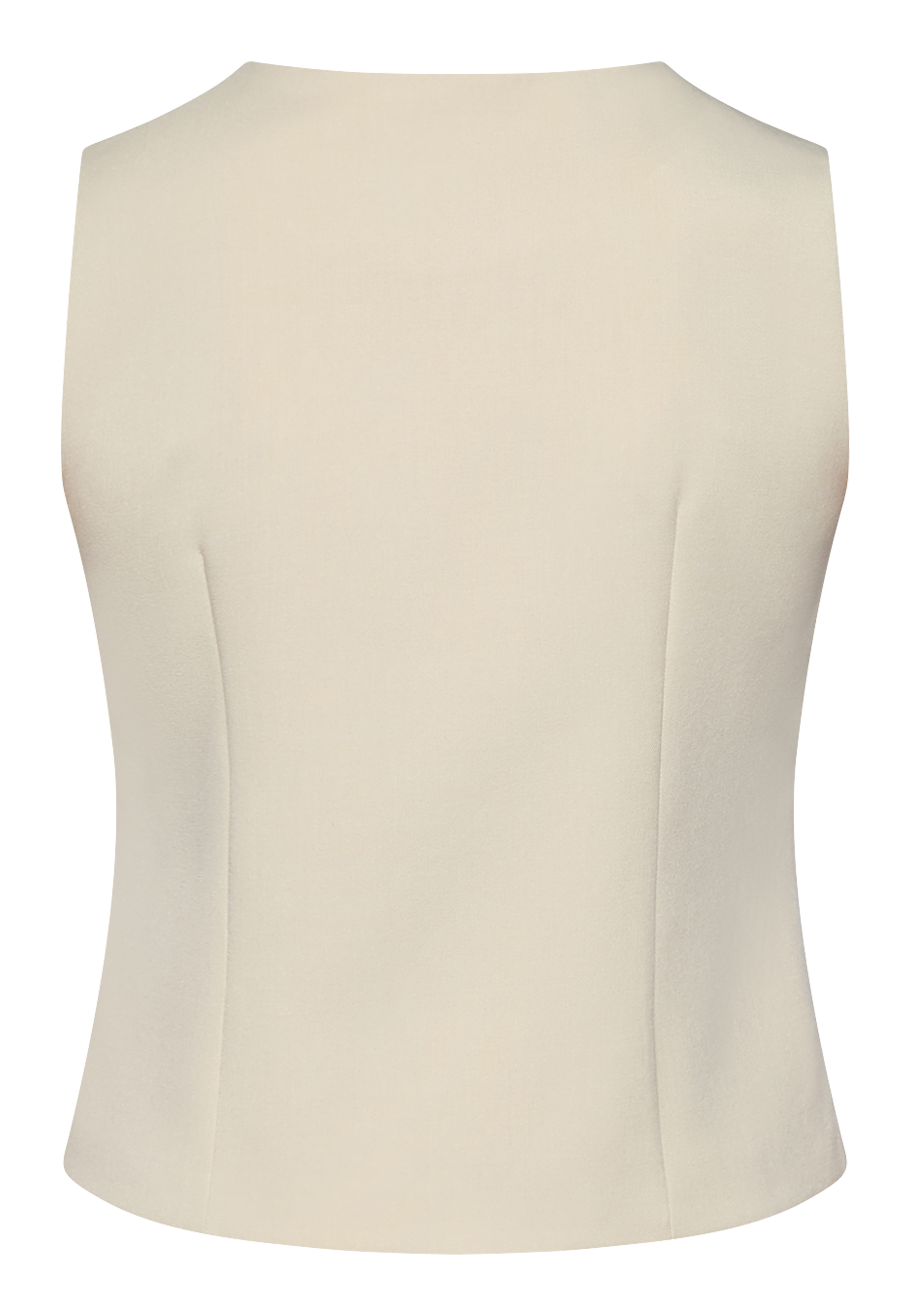 GATA-VE2 is a sleeveless vest with an asymmetrical neckline design. It features a row of decorative buttons down the front and a tailored fit that gives a sophisticated look. The model is wearing a size S.