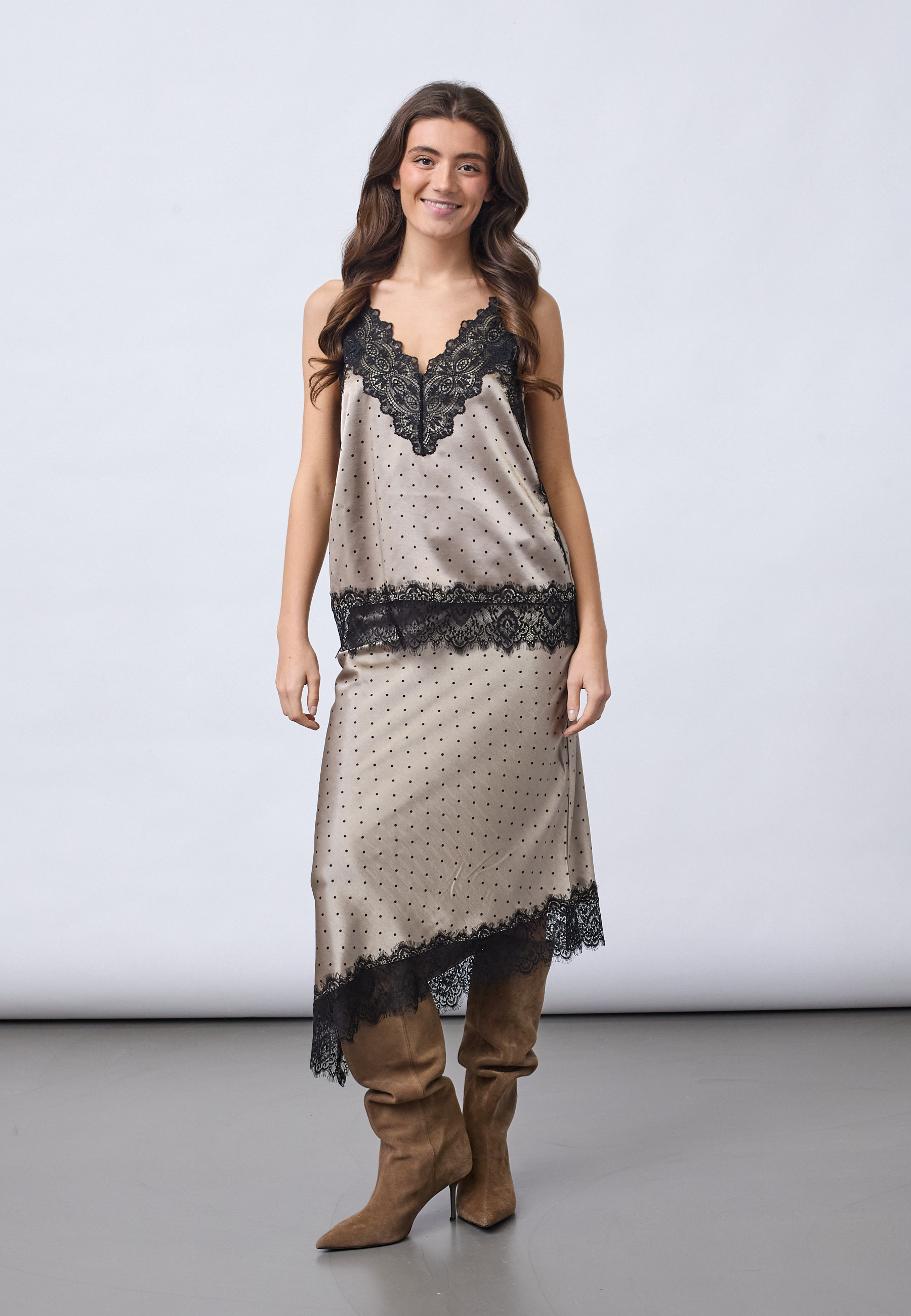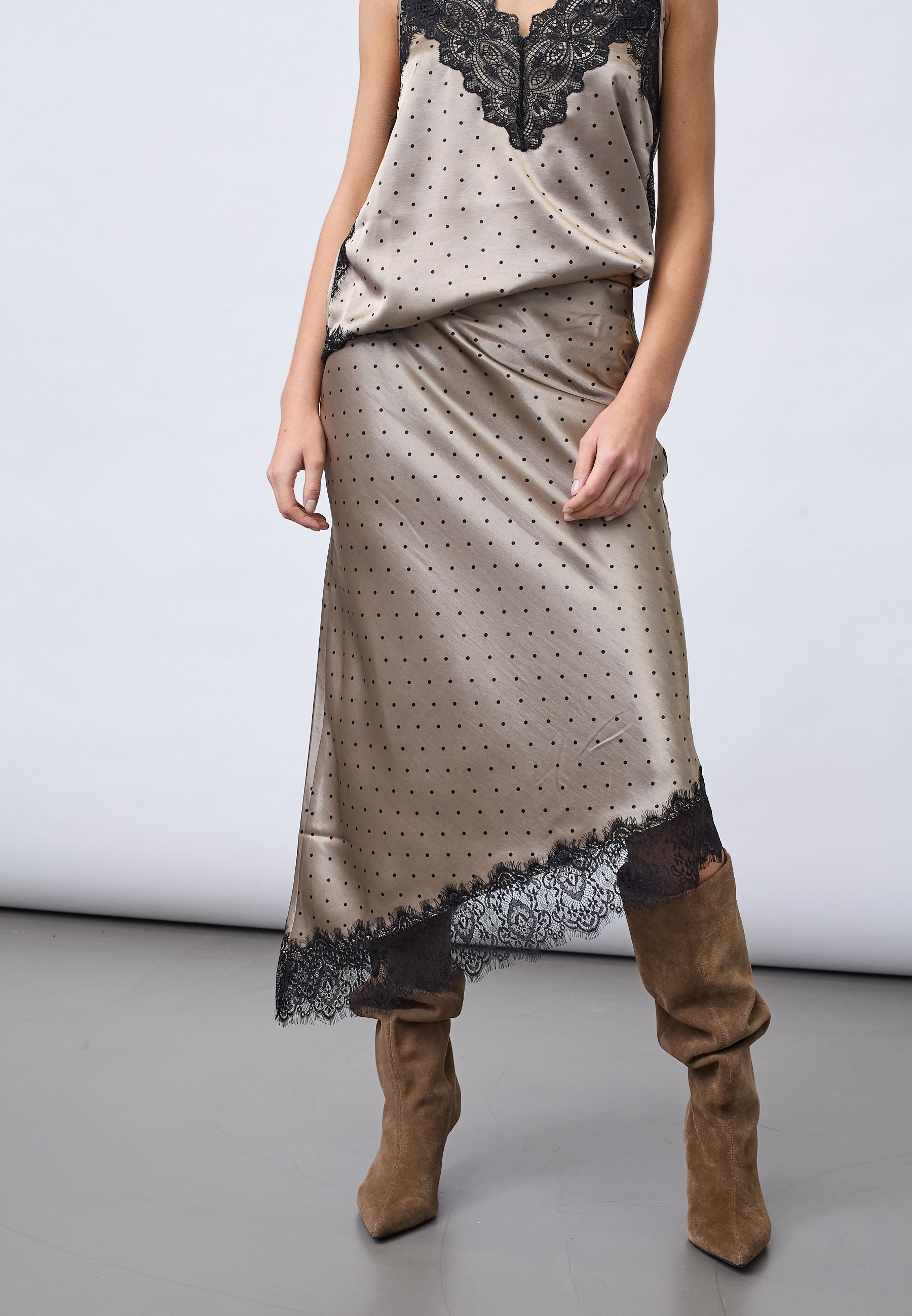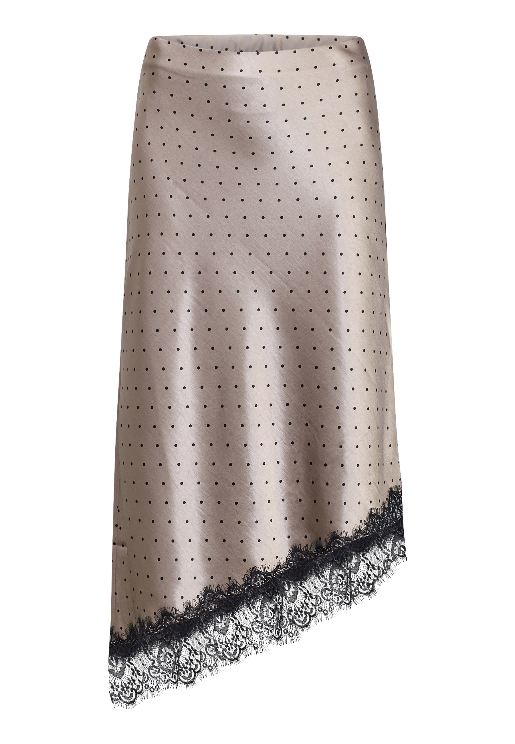 VALERIE-SK is a feminine midi skirt in a luxurious satin quality with a classic polka dot pattern. The skirt has an asymmetrical cut at the bottom, which has a lace edge. The model is wearing a size S and is 175 cm tall.