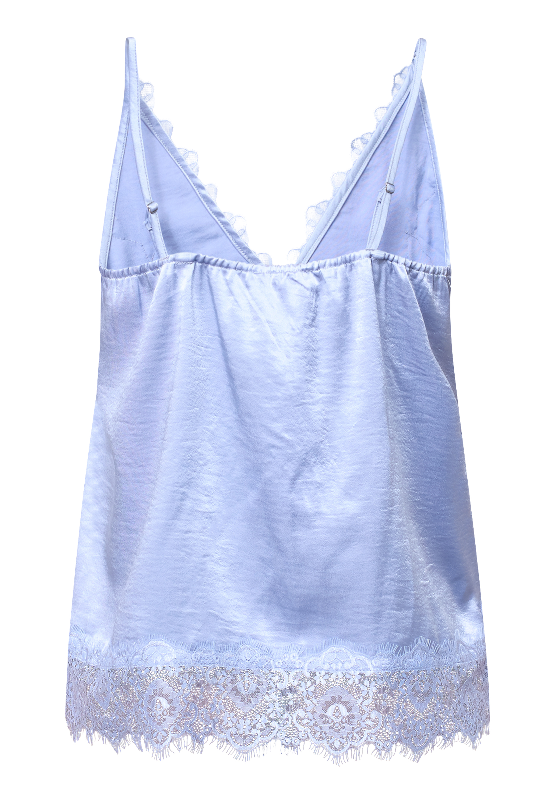 VALERIE-ST1 is an exclusive lingerie top in a shiny satin finish with a feminine expression. The top has a v-neck and a detailed lace edge. Adjustable spaghetti straps complete the light look. The model is wearing a size S.