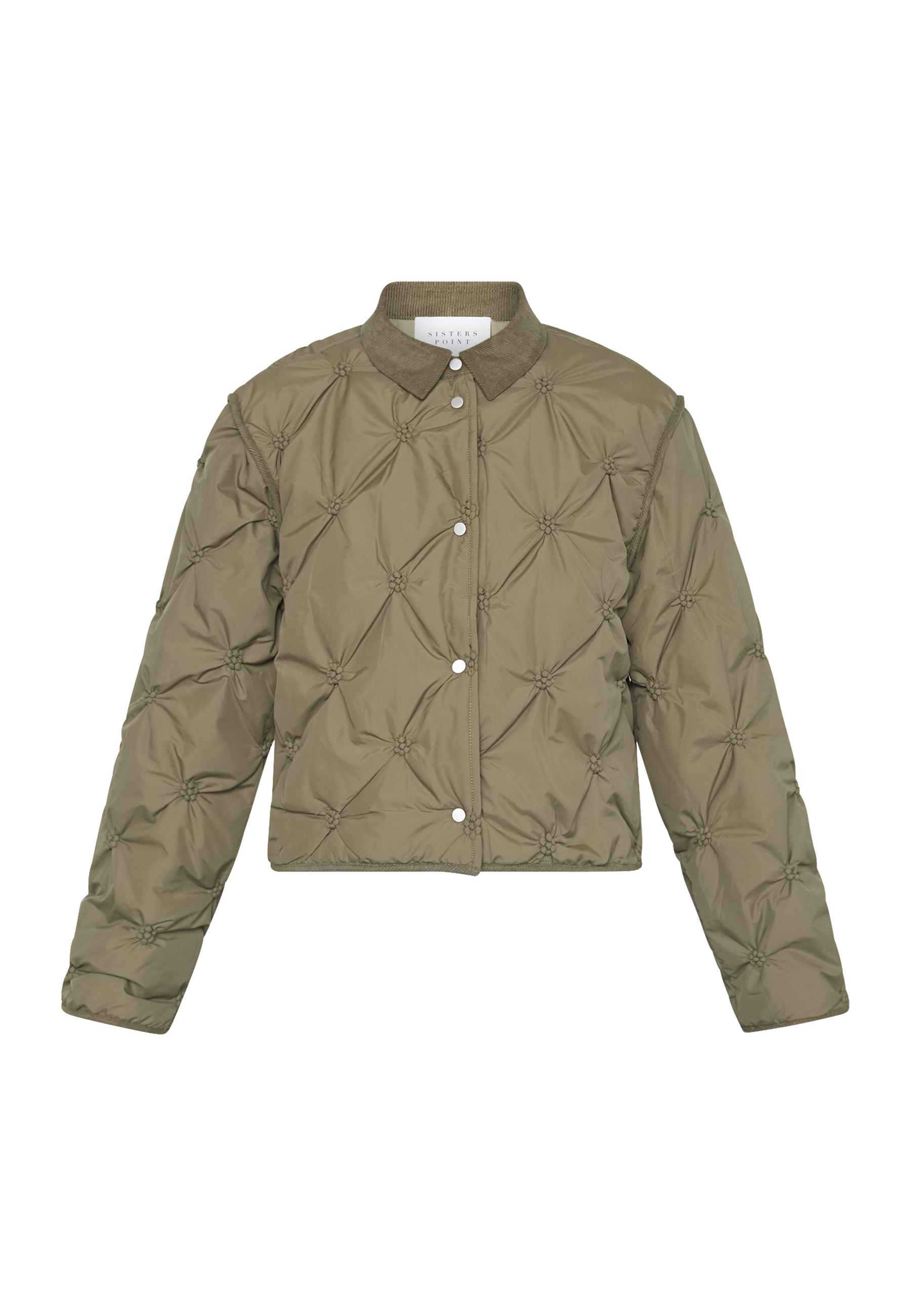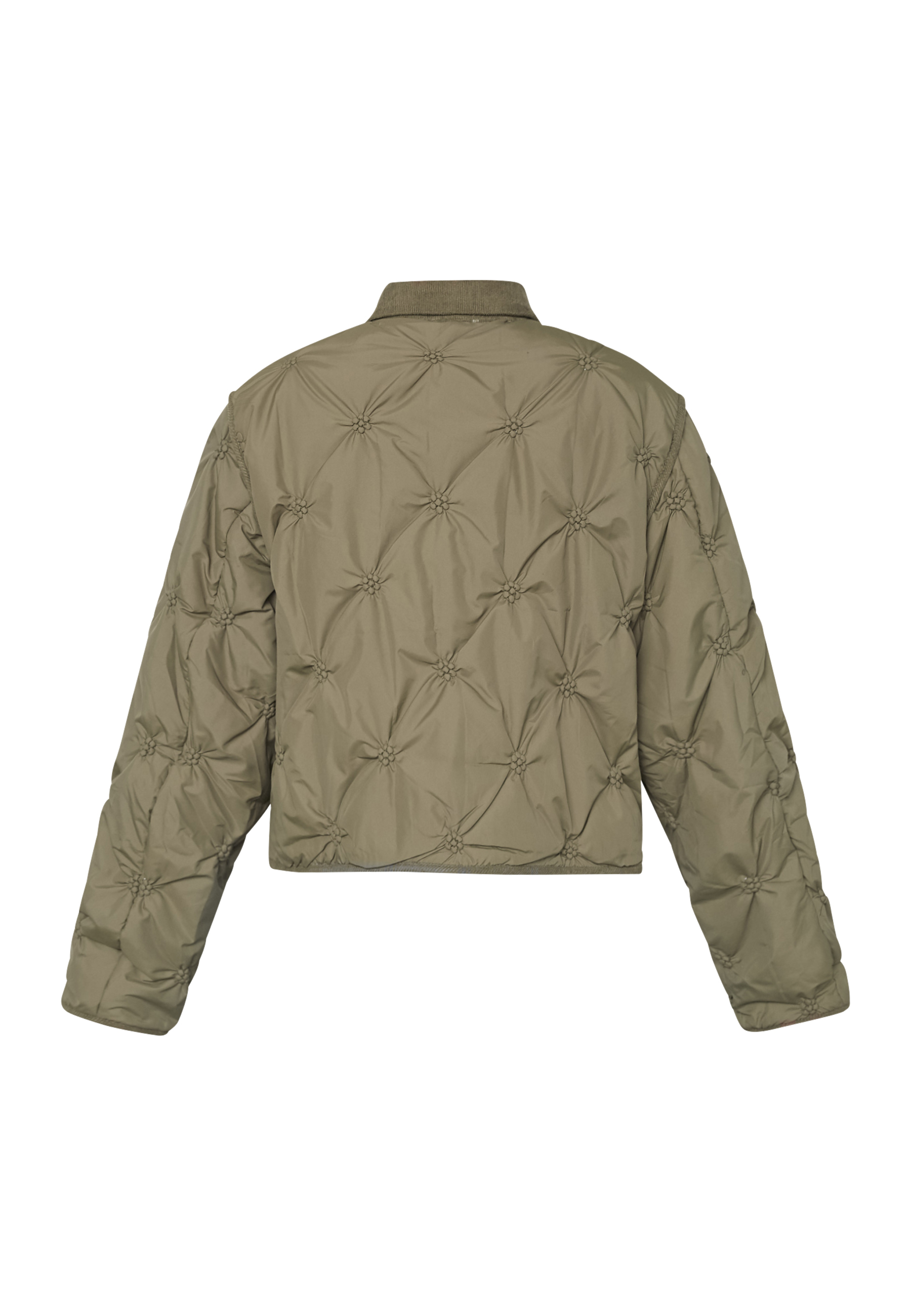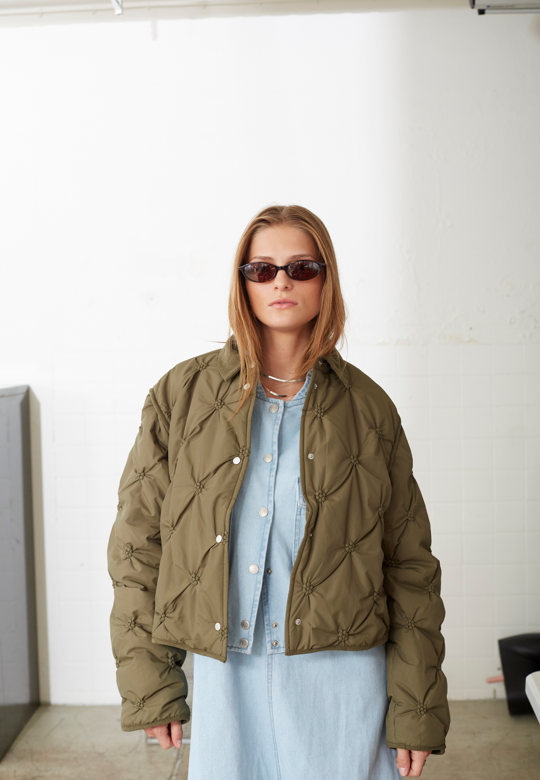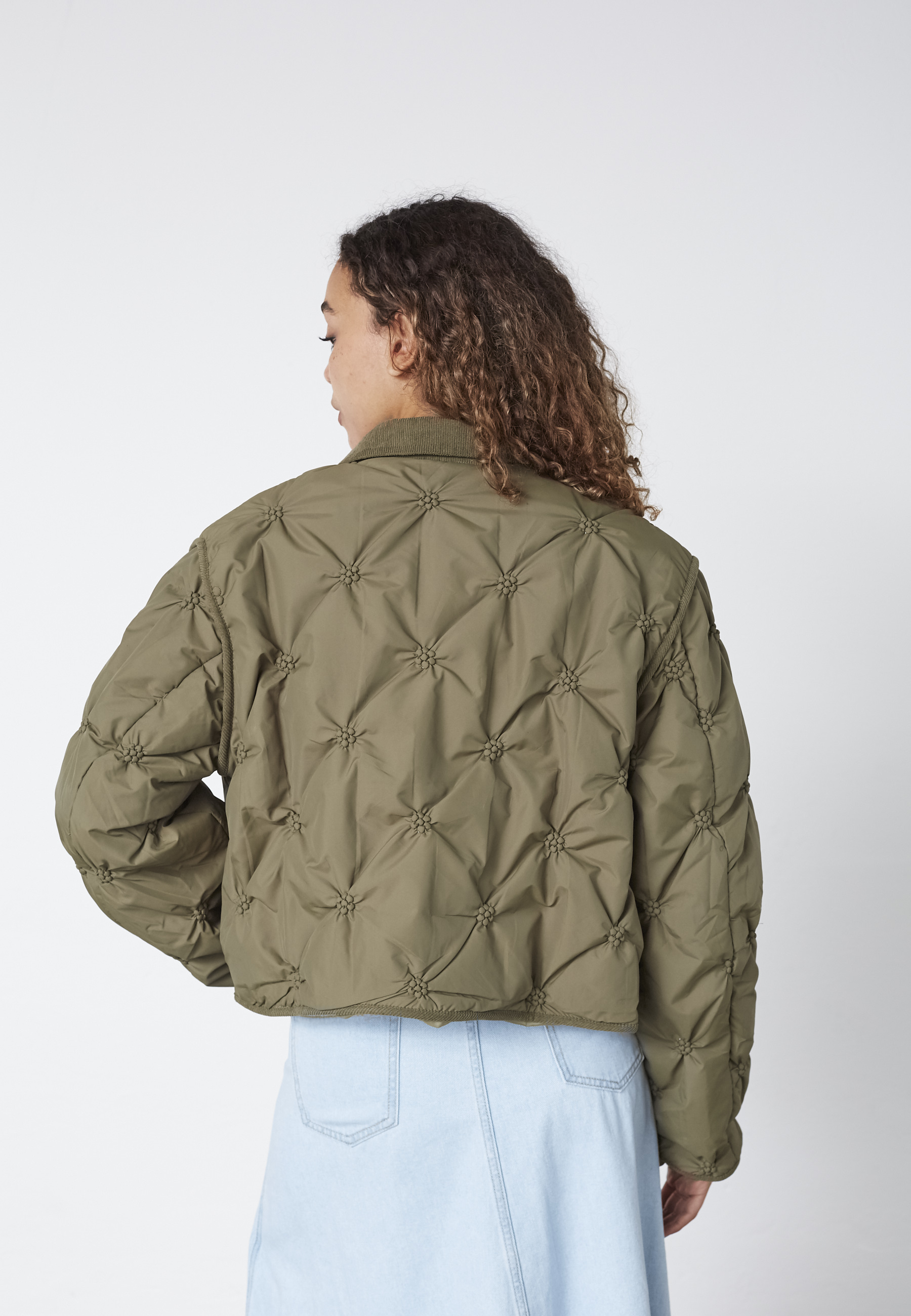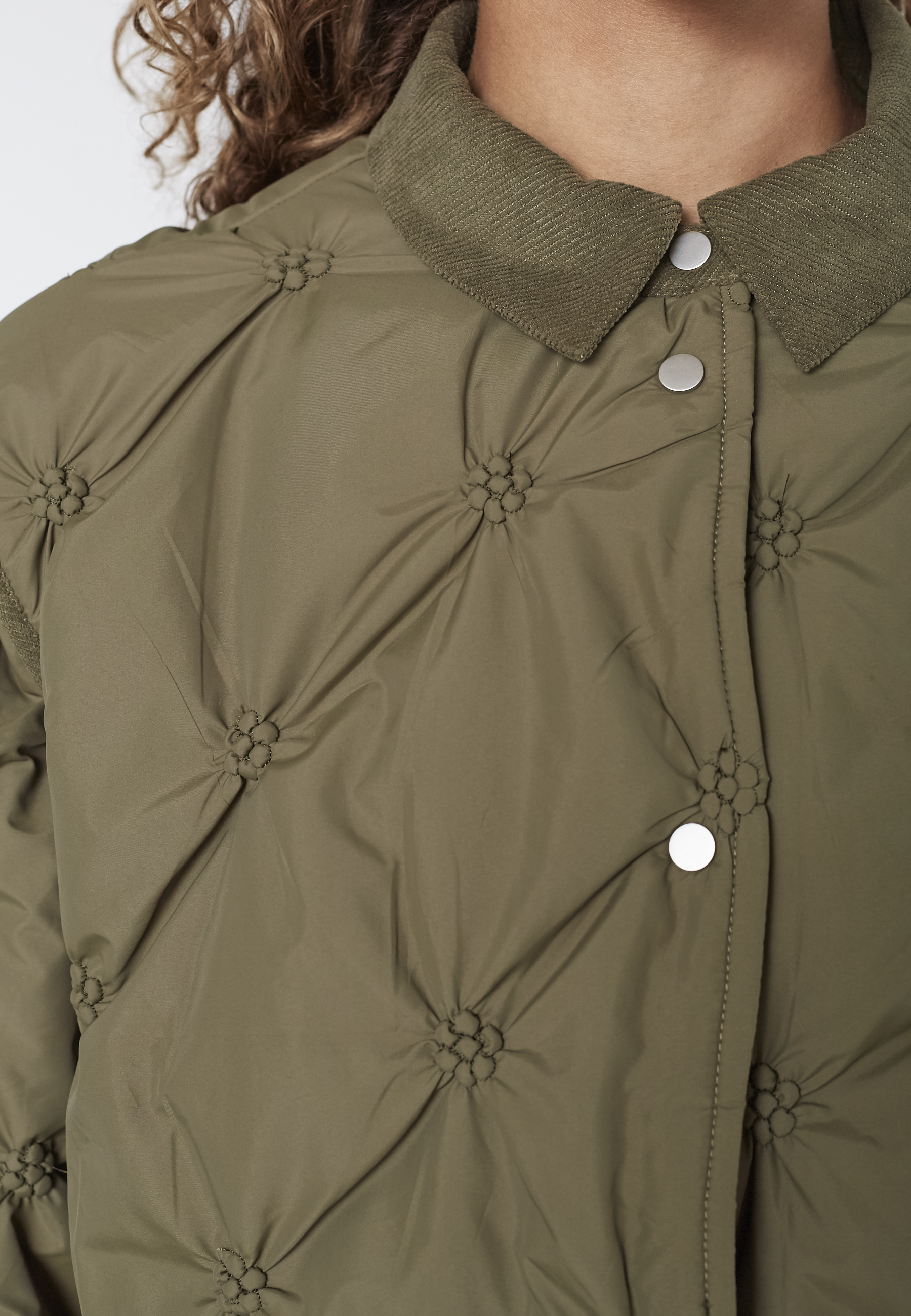 EQA-JA is a quilted jacket with a unique pattern, a classic collar, and is buttoned at the front. The sleeves are wide and have matching quilting. The model is wearing a size S.