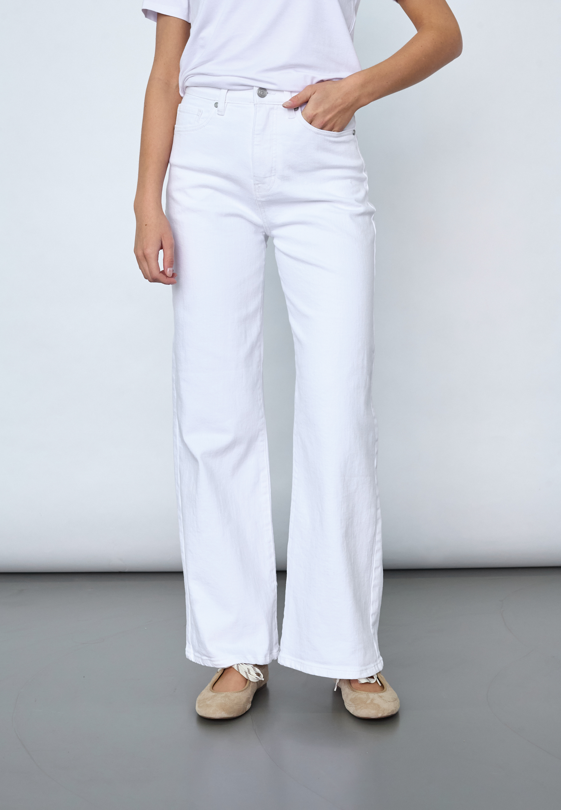 OWI-W.JE17 are a pair of classic jeans. The pants have a high waist and a straight leg fit that gives a timeless look. They have traditional five pockets and button closure. The model is wearing a size S and is 175 cm tall.