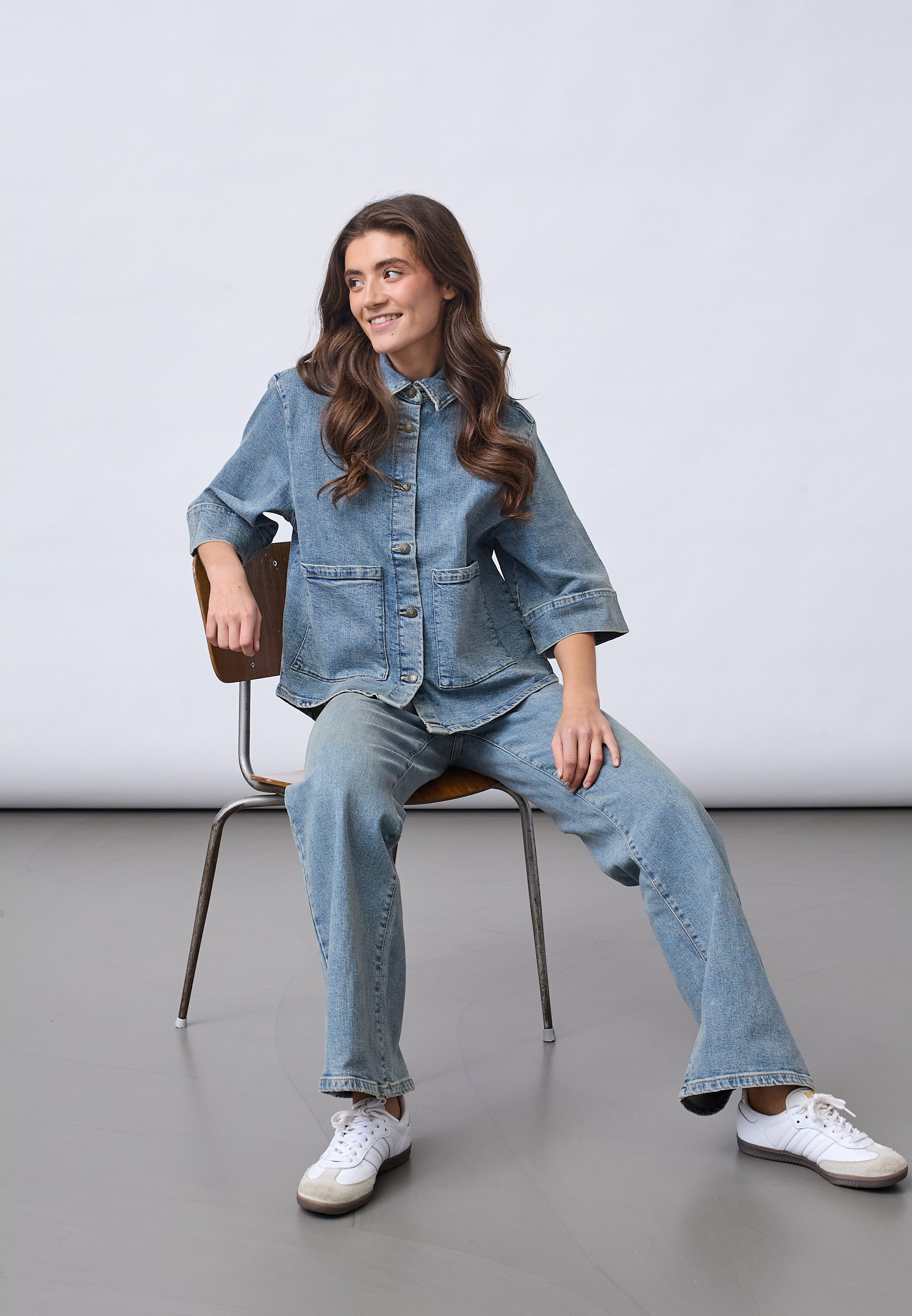 OLEA-JA12 is a denim jacket with a boxy fit and a functional utility look. The jacket has a classic collar, distinctive patch pockets on the front and metal buttons. The model is wearing a size S.