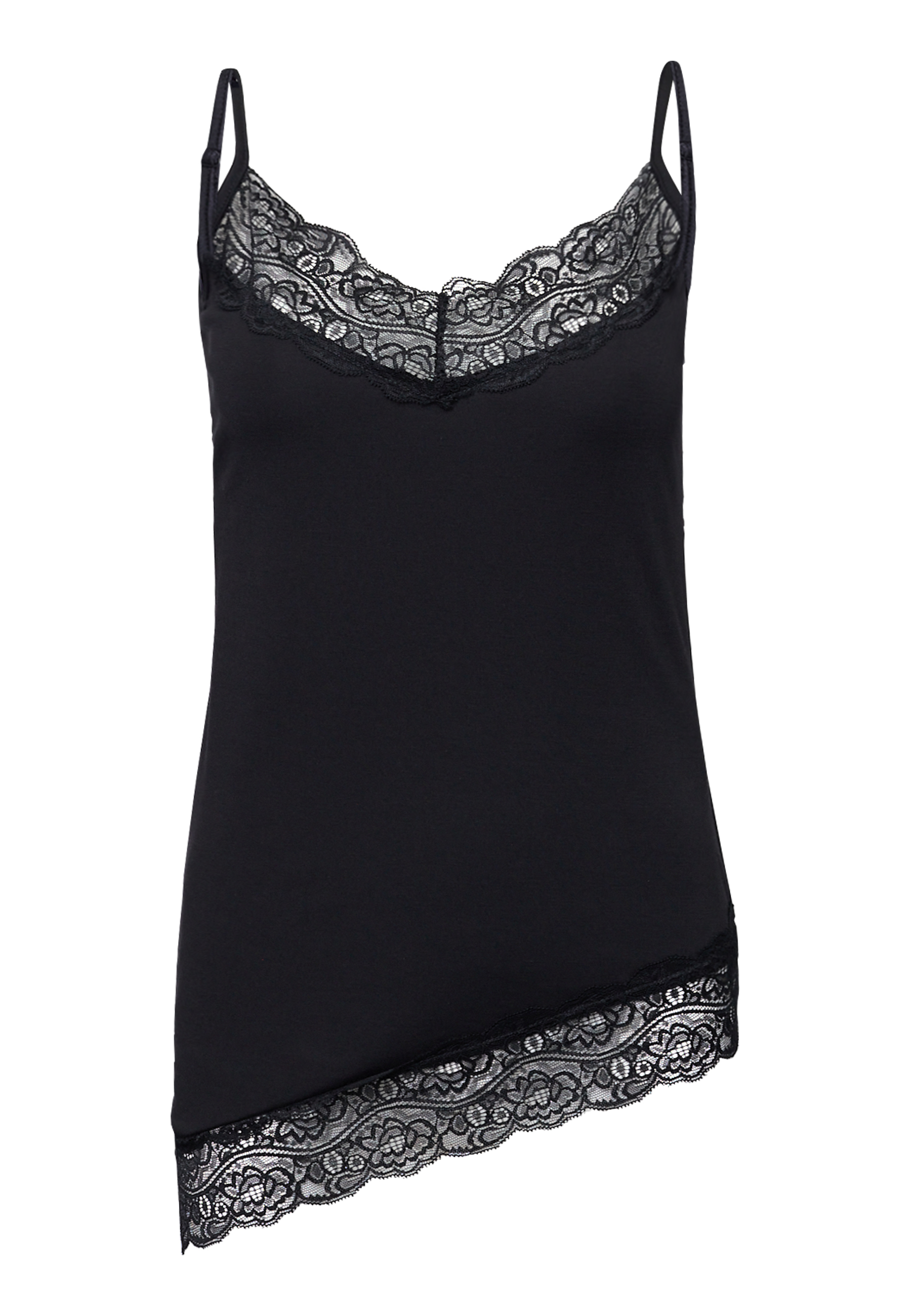 VUMI-LONG is an elegant top in soft material with exclusive lace details. The top has adjustable straps and a beautiful lace panel on the back. It has a slanted cut at the bottom with a lace edge. The model is wearing a size S.