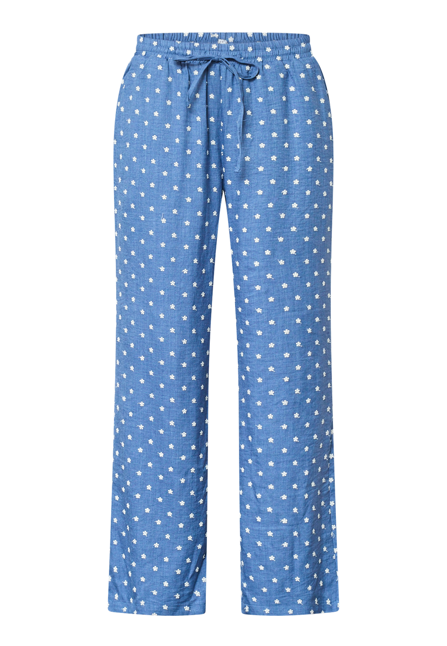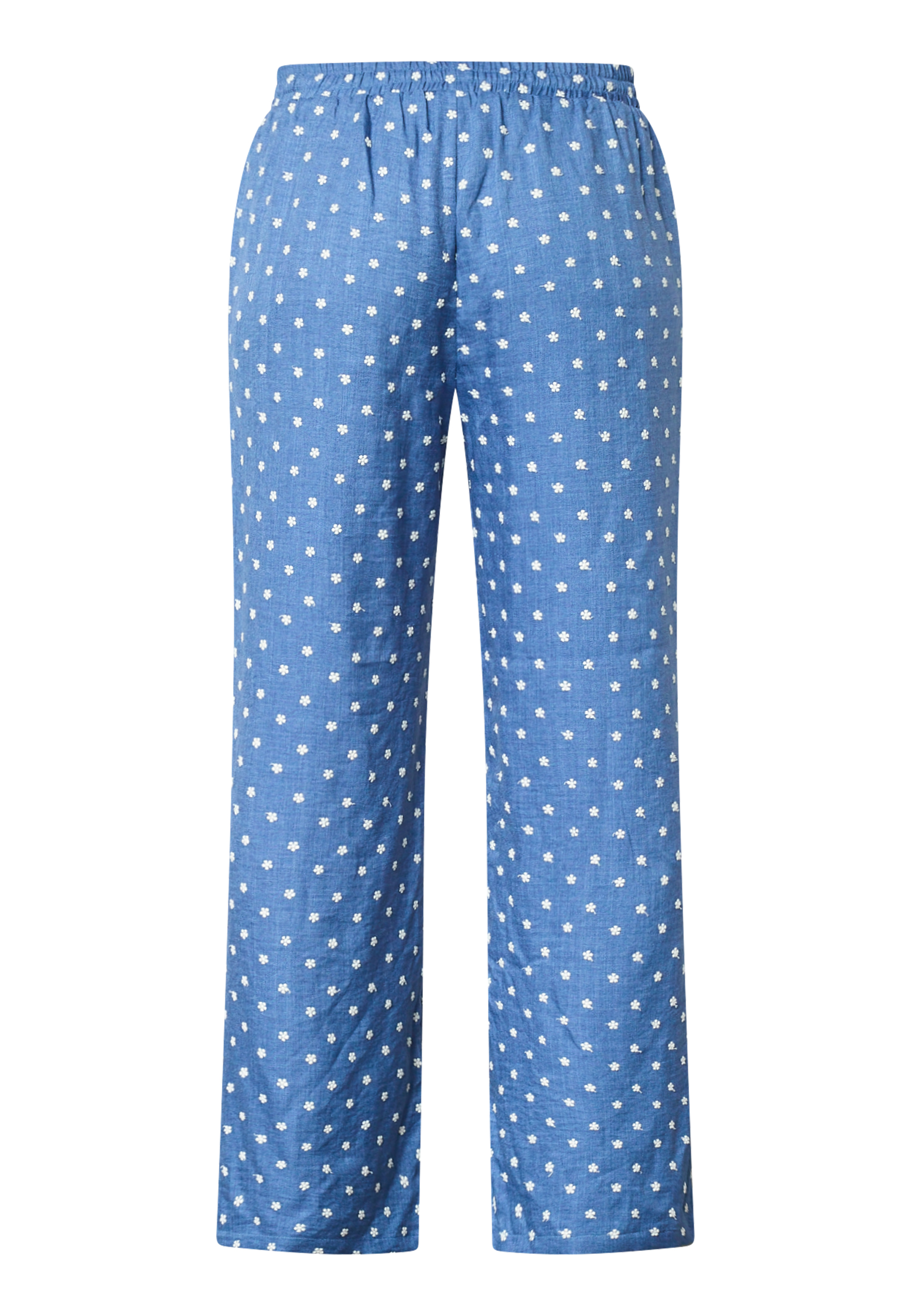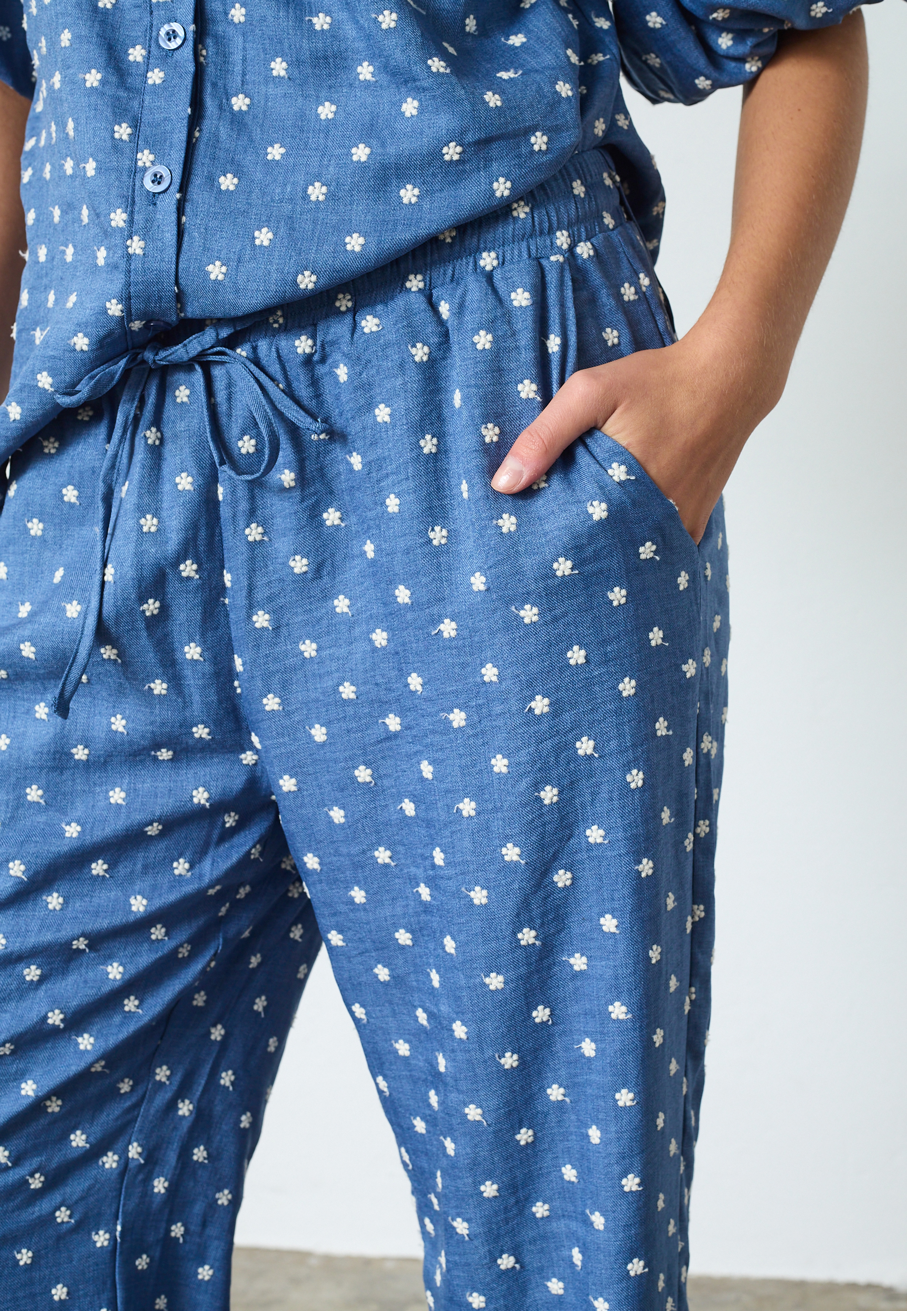 ELLA-PA50 are a pair of loose pants with embroidered flowers, elastic at the waist, and a drawstring. Side pockets. The model is wearing a size S and is 175 cm tall.