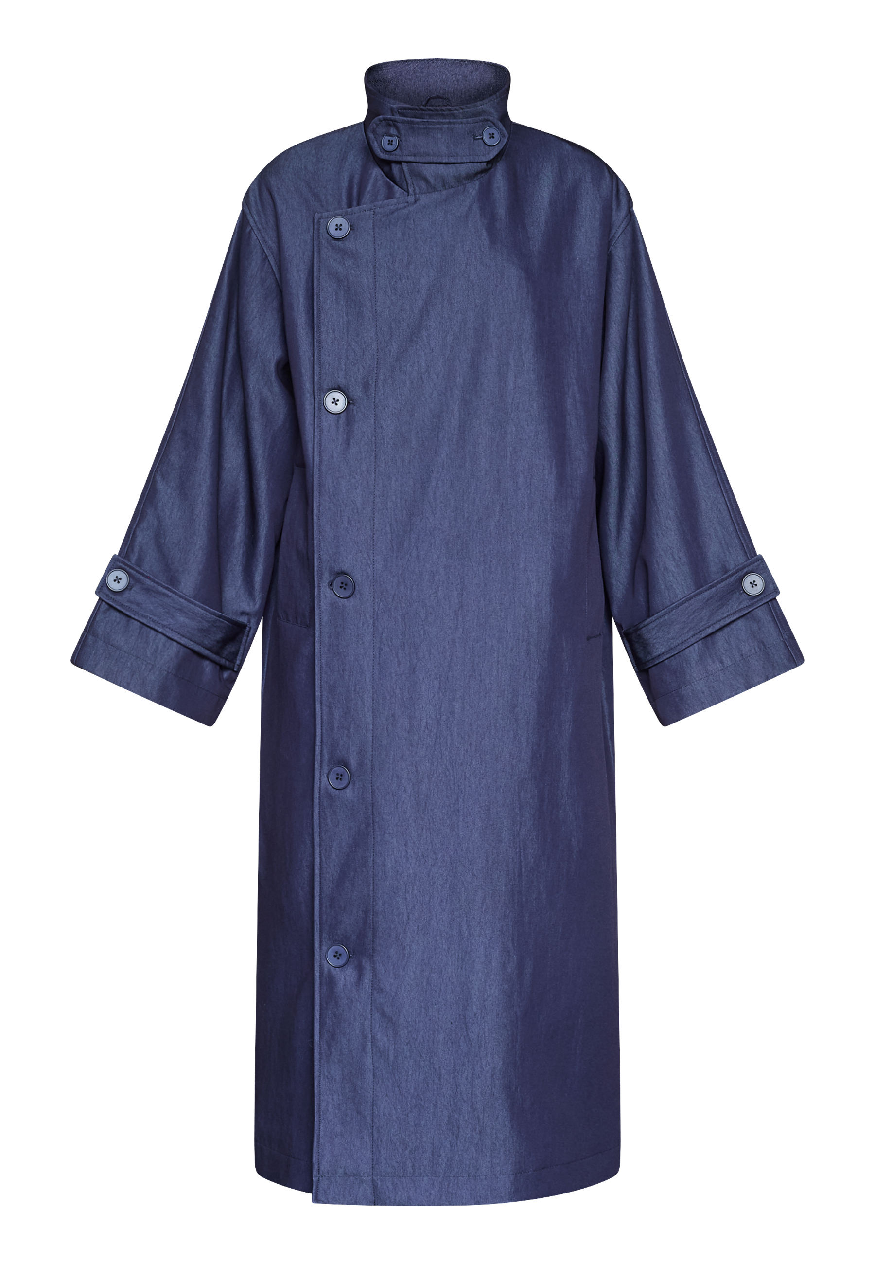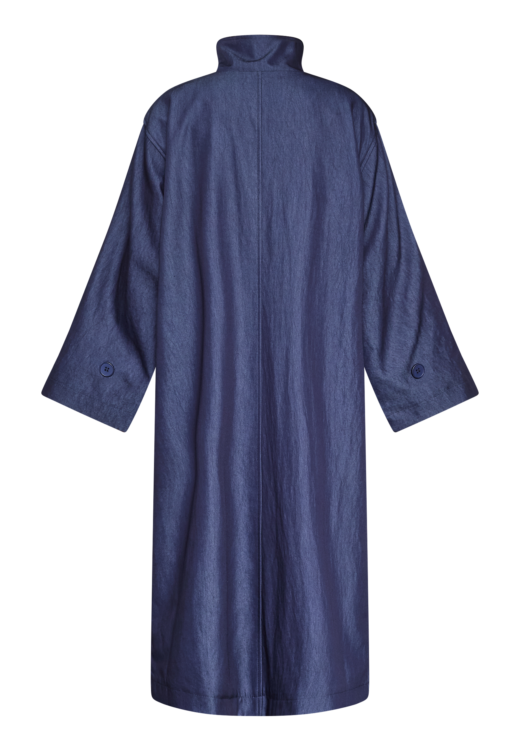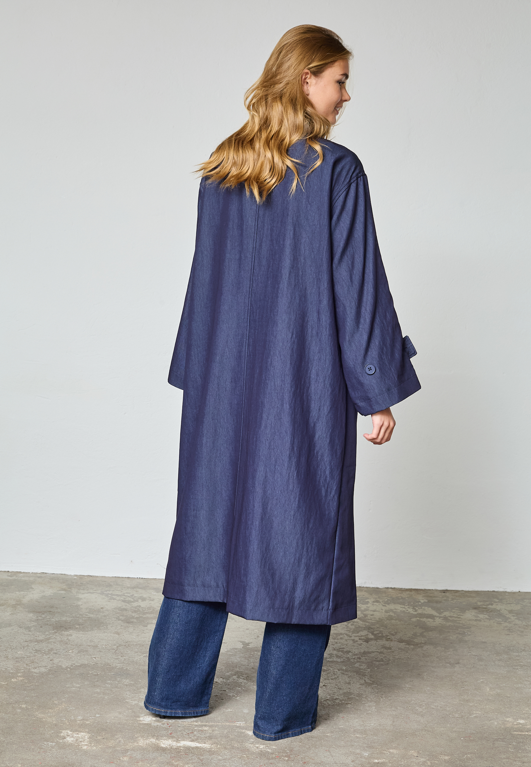 DAR-N.TRENCH2 is a trendy long and oversized trenchcoat. The trenchcoat has two pockets, a button closure and a high neck, with a removable button closure. The model is wearing a size S