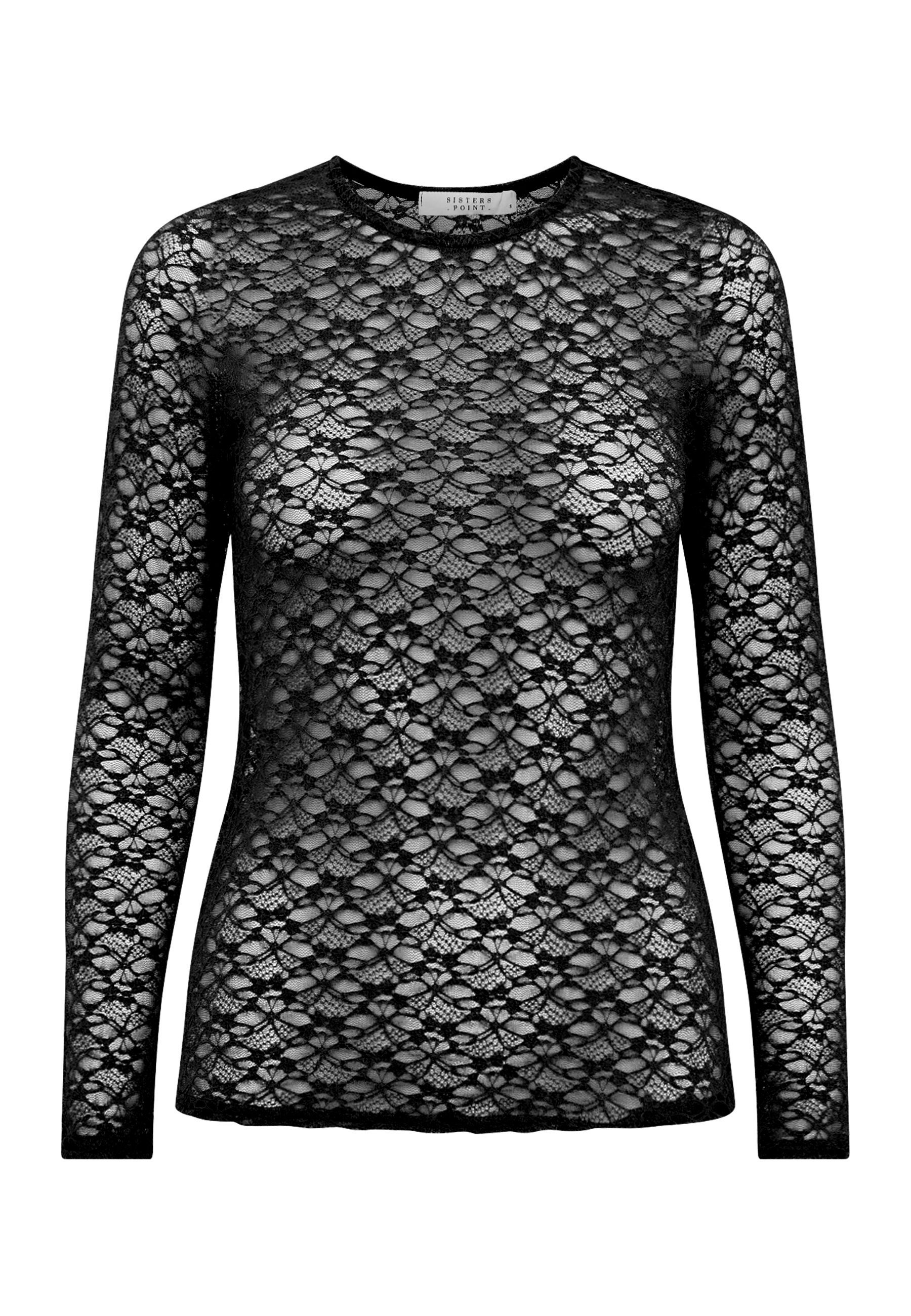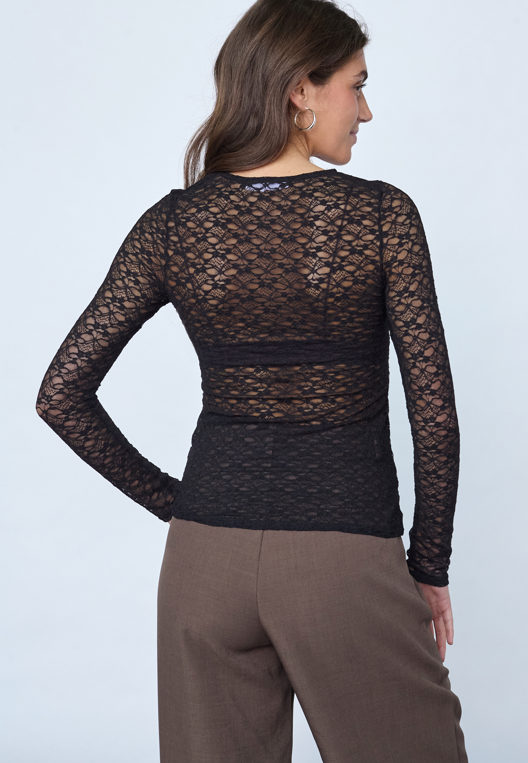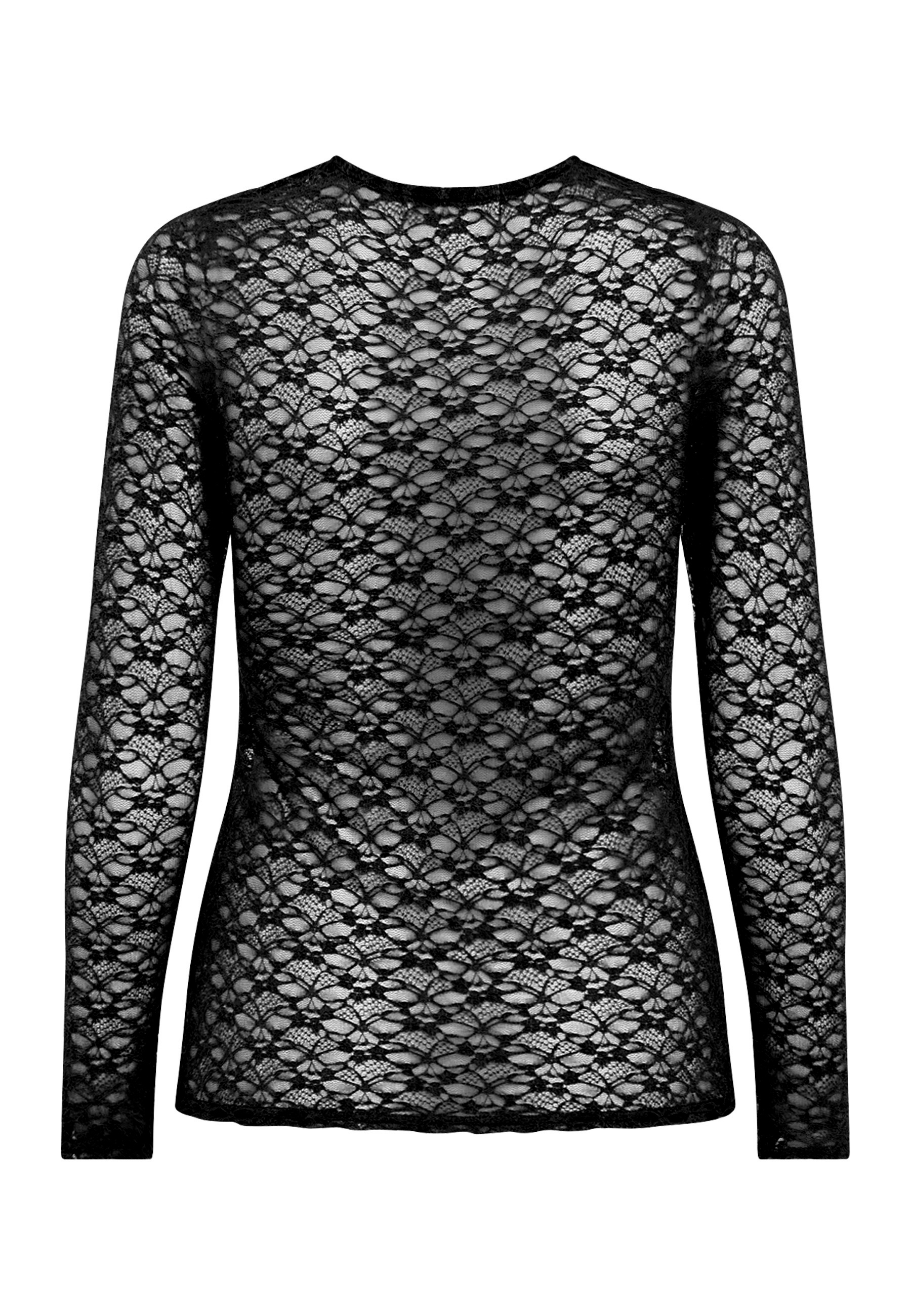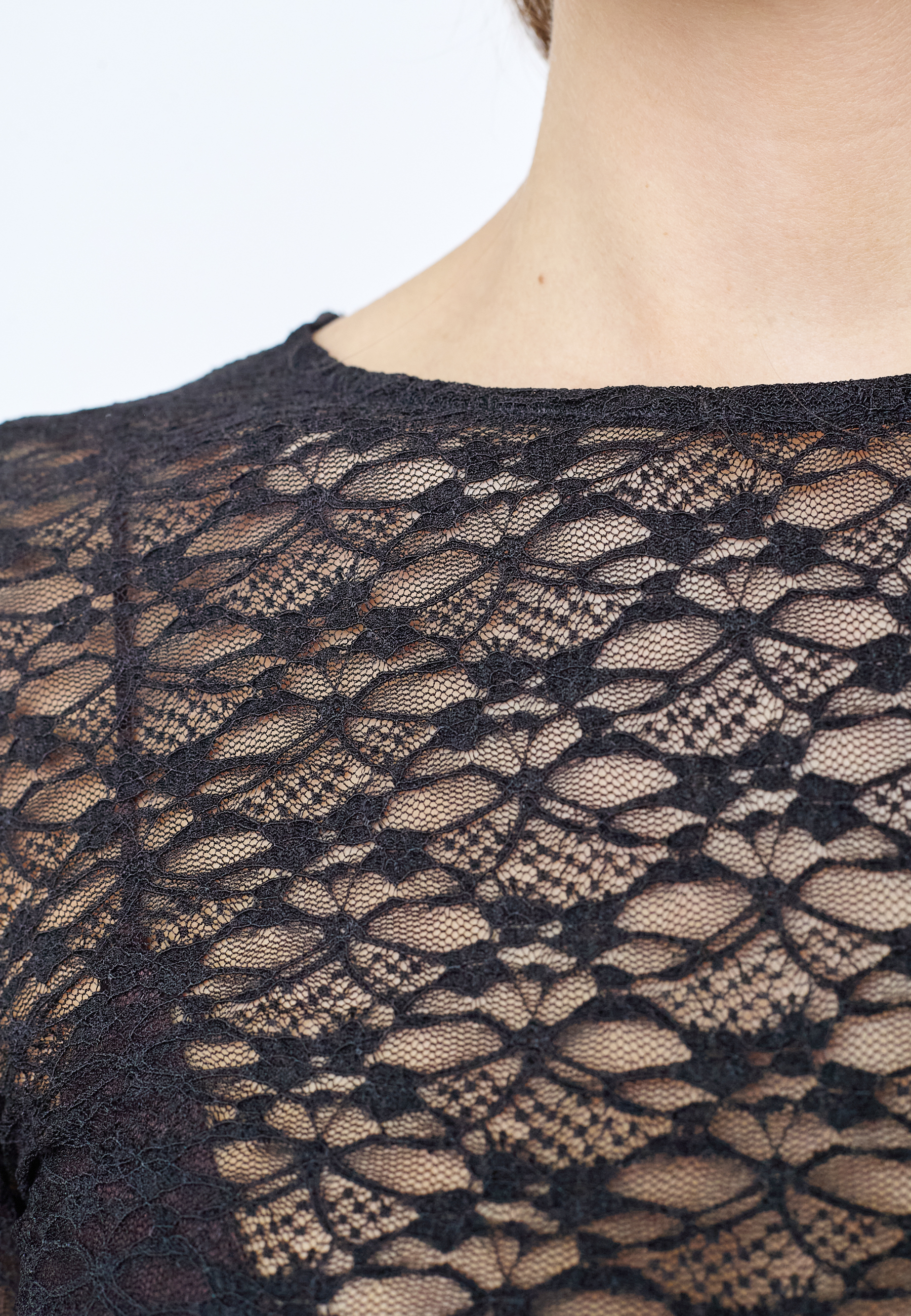 GIMAS-LS is a feminine top in transparent lace with an elegant pattern. Round neck and long sleeves. The model is wearing size S