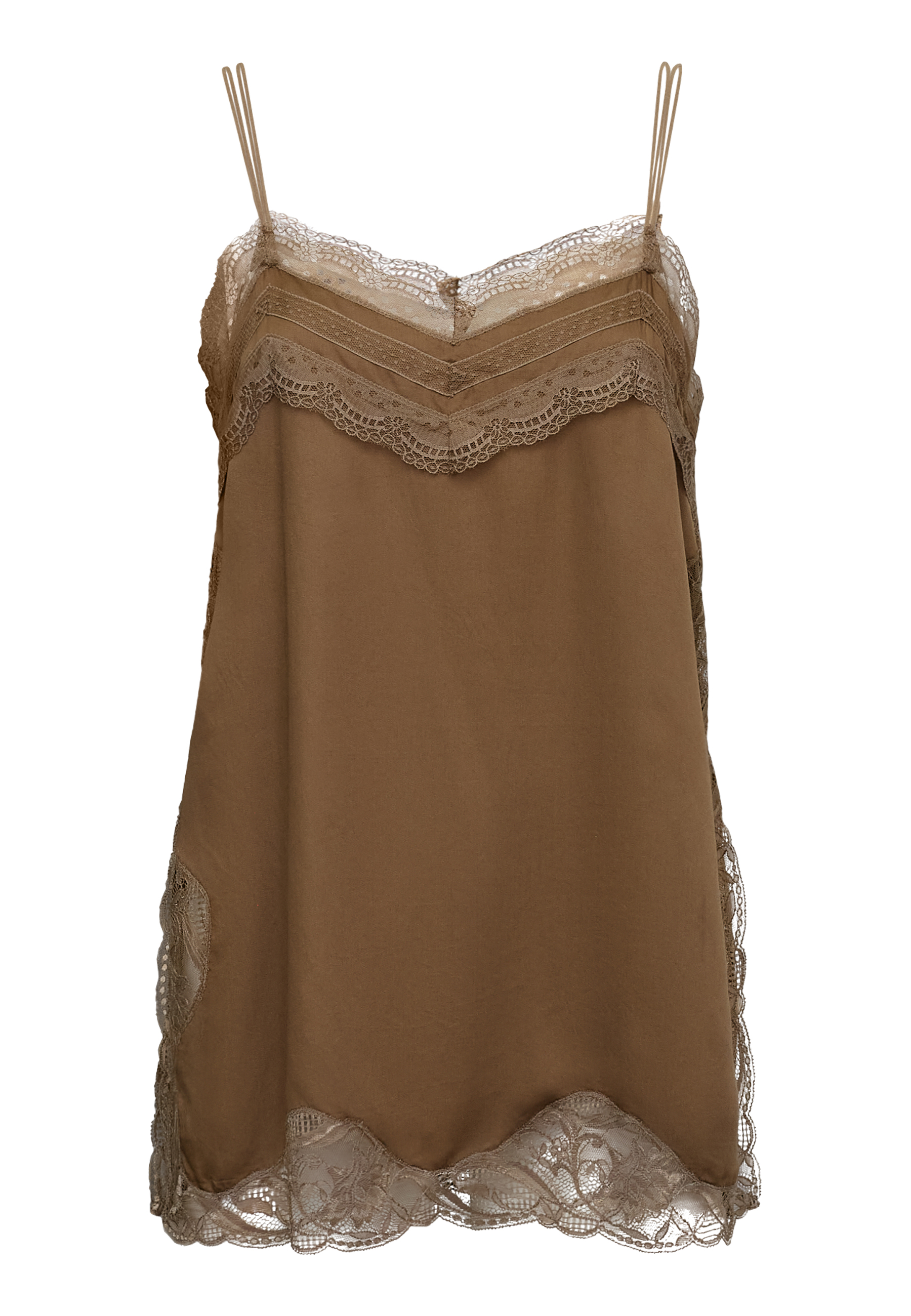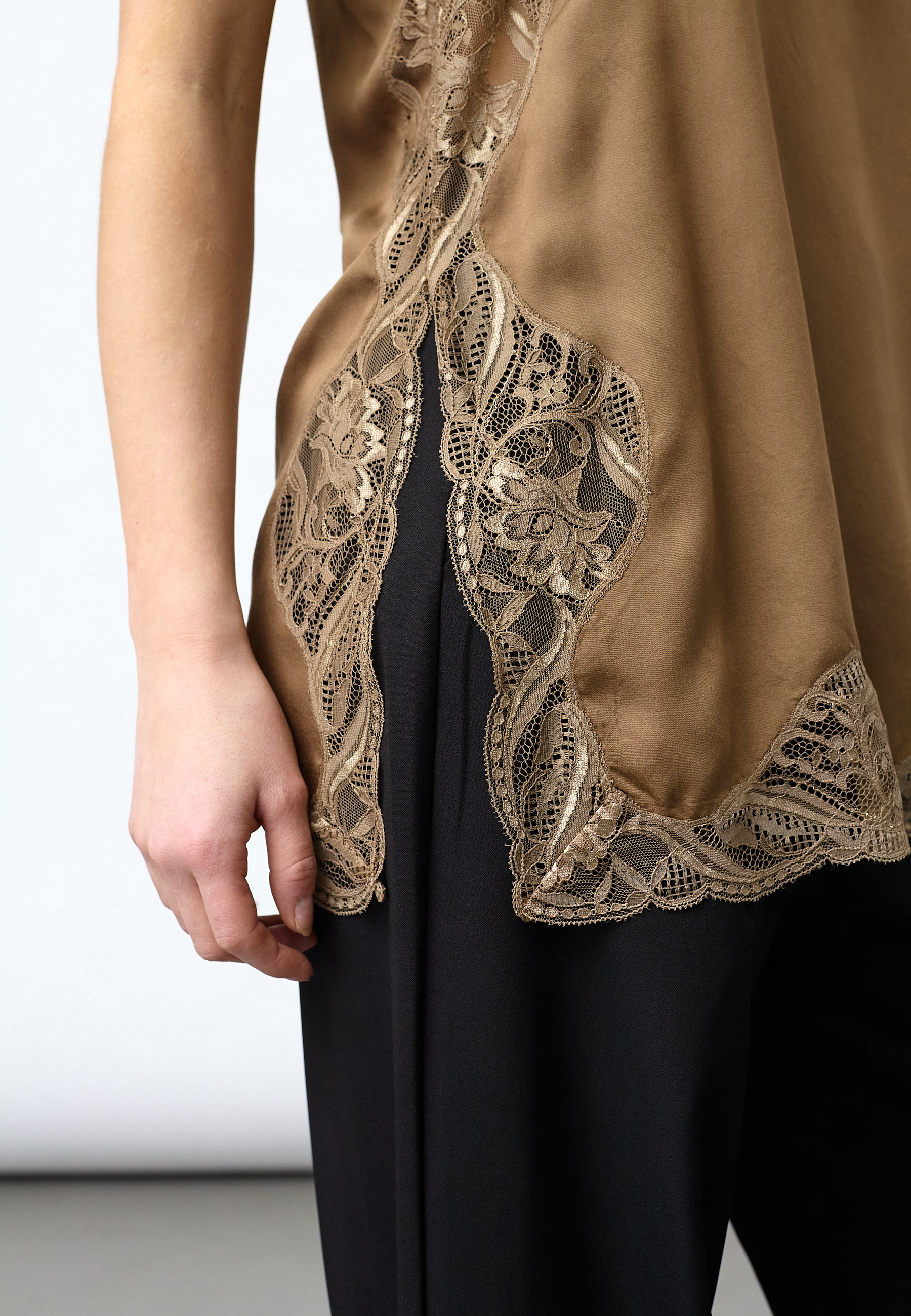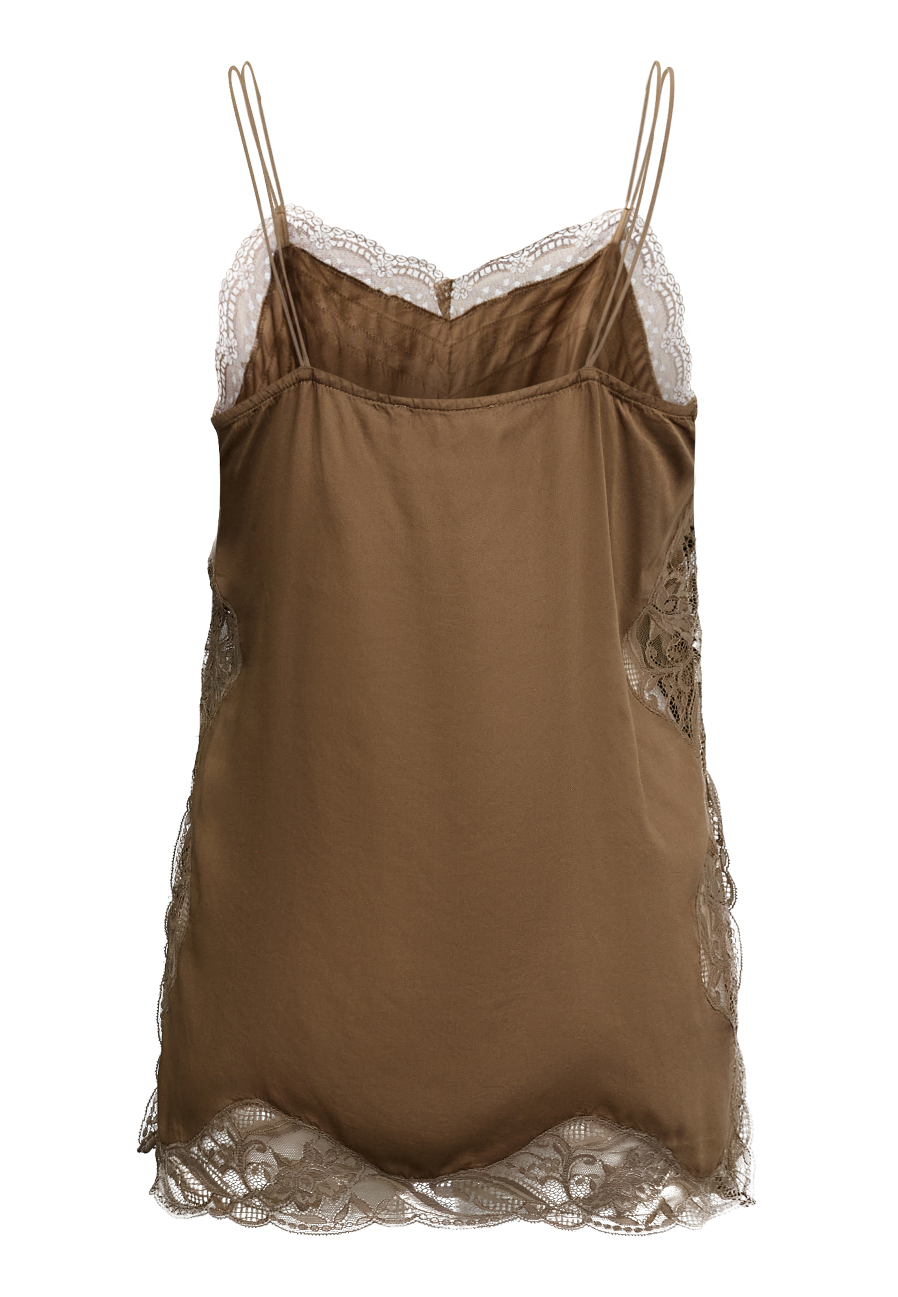 ISOLDE-ST is an exclusive satin top that is detailed with a beautiful lace edge along the v-neck and bottom. The top has thin adjustable straps. The model is wearing a size S.