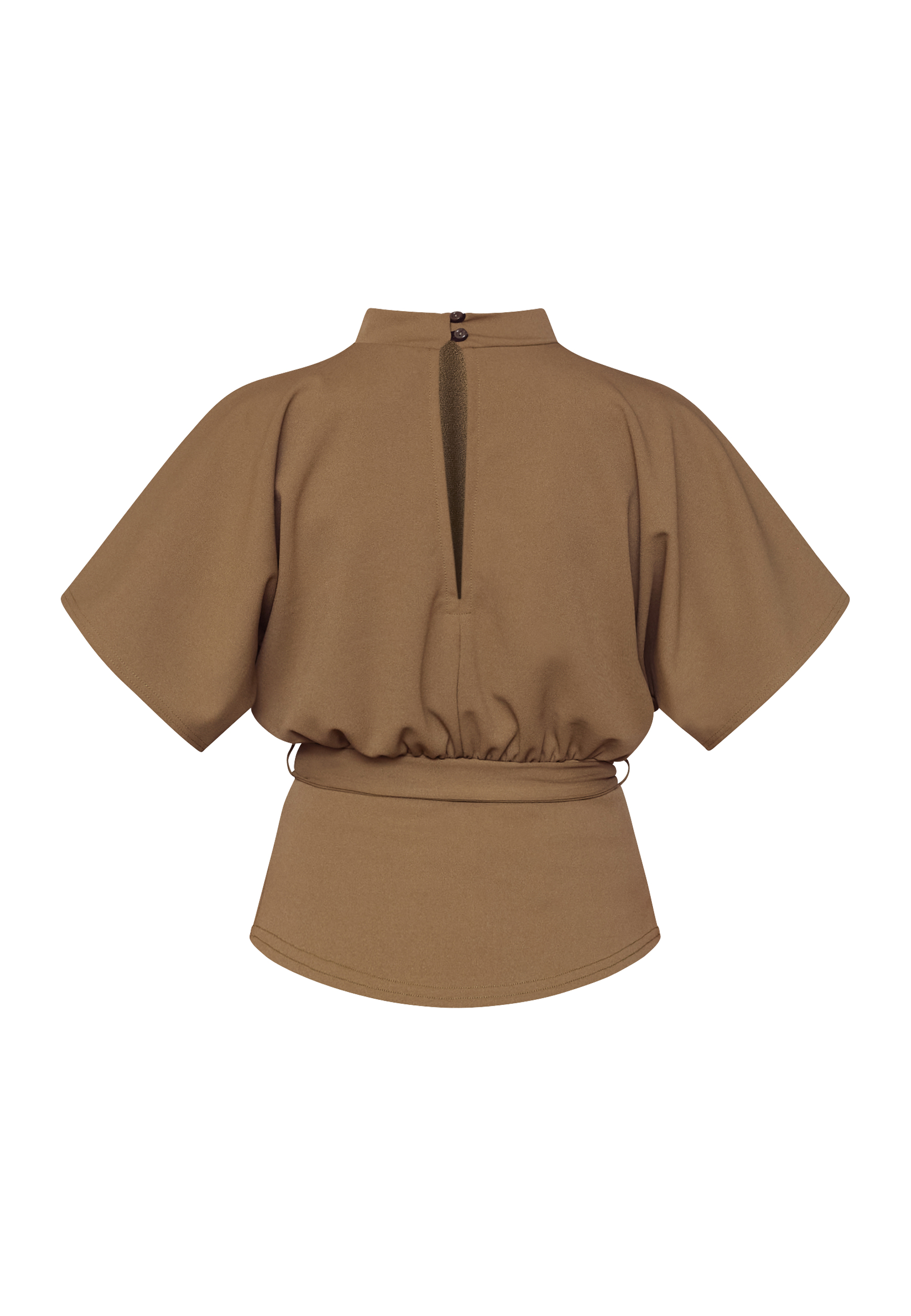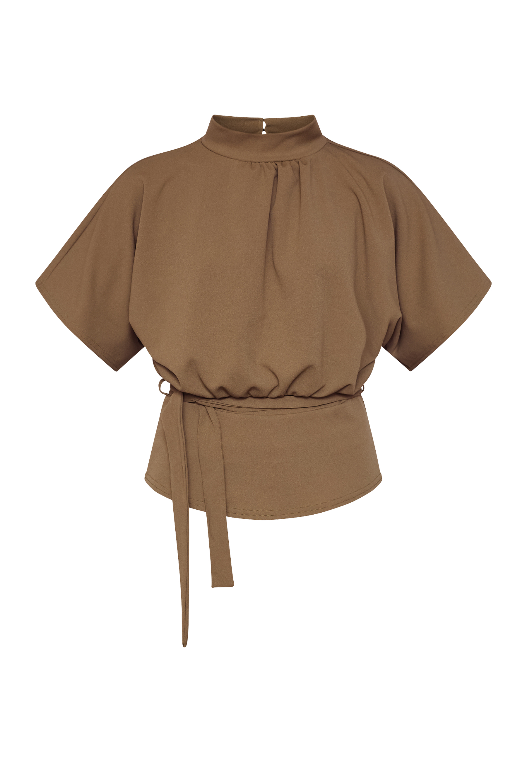 GIRL-TOP6 is a blouse with a lightly high neck and short, bat-like sleeves. The blouse has a loose fit at the top and comes with a tie belt at the waist that accentuates the figure. The model is wearing size S.