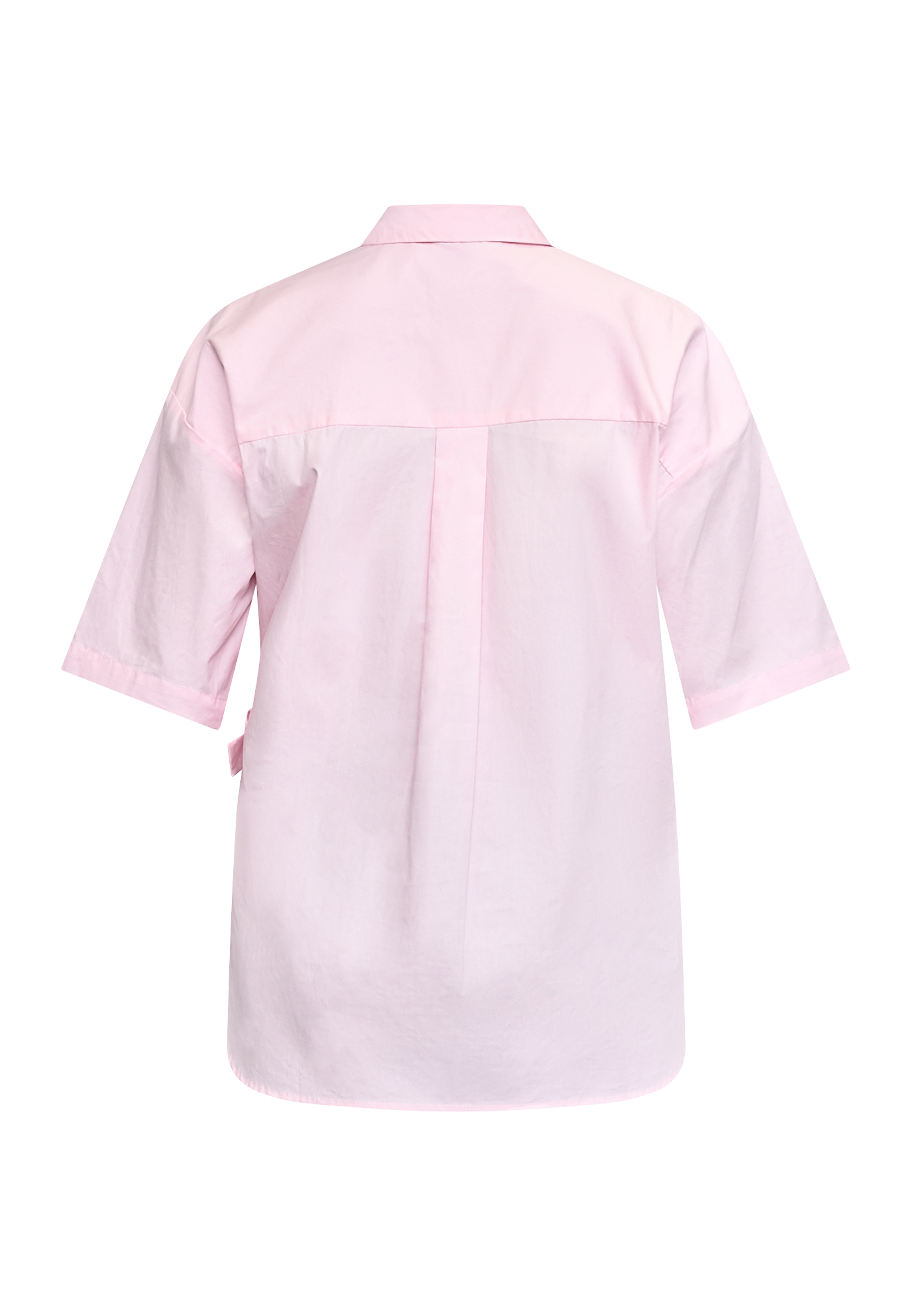 ETAPA-SS is an oversized shirt with short sleeves. It has a regular shirt collar and a button closure at the front for an asymmetrical look. The model is wearing a size S.