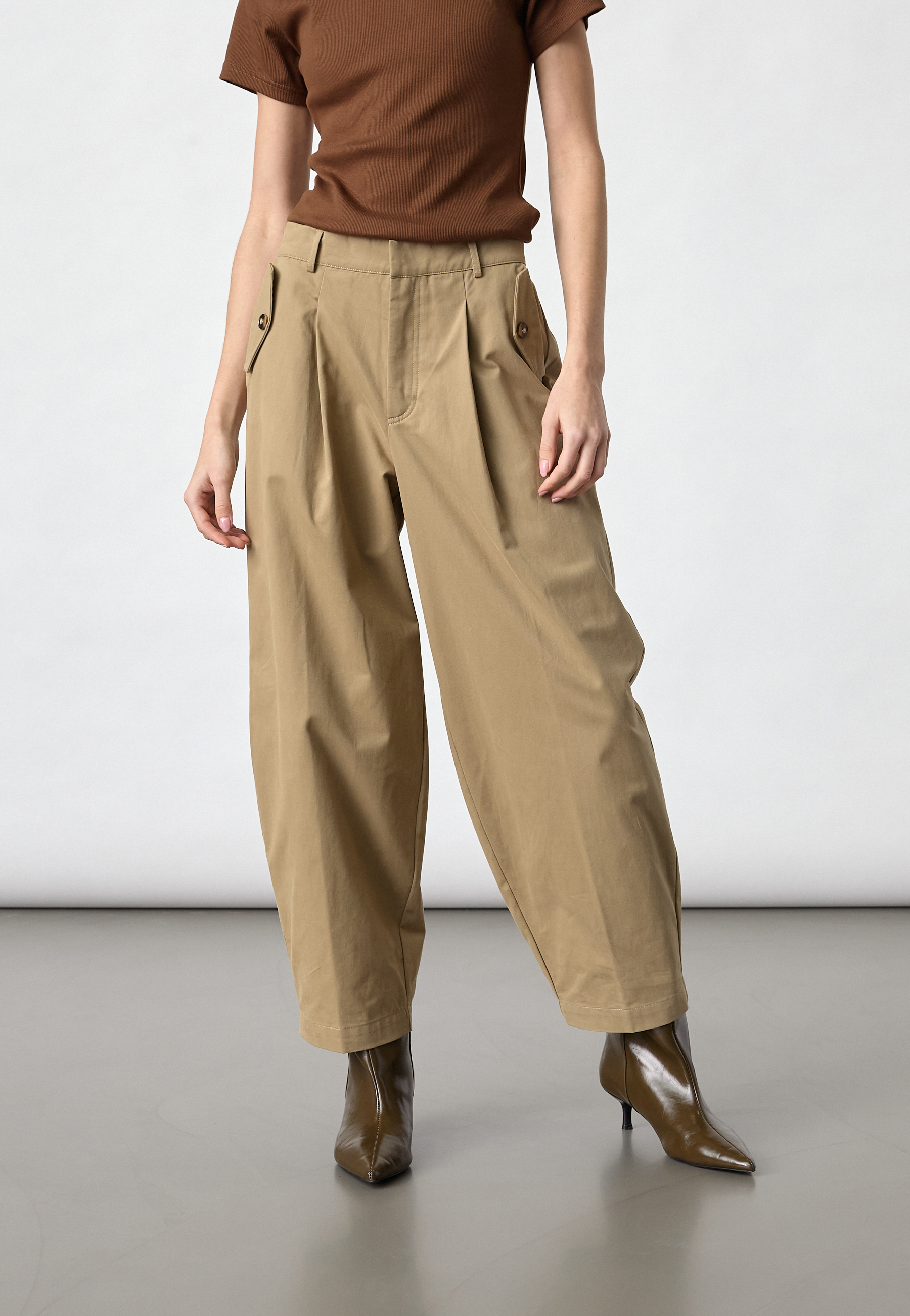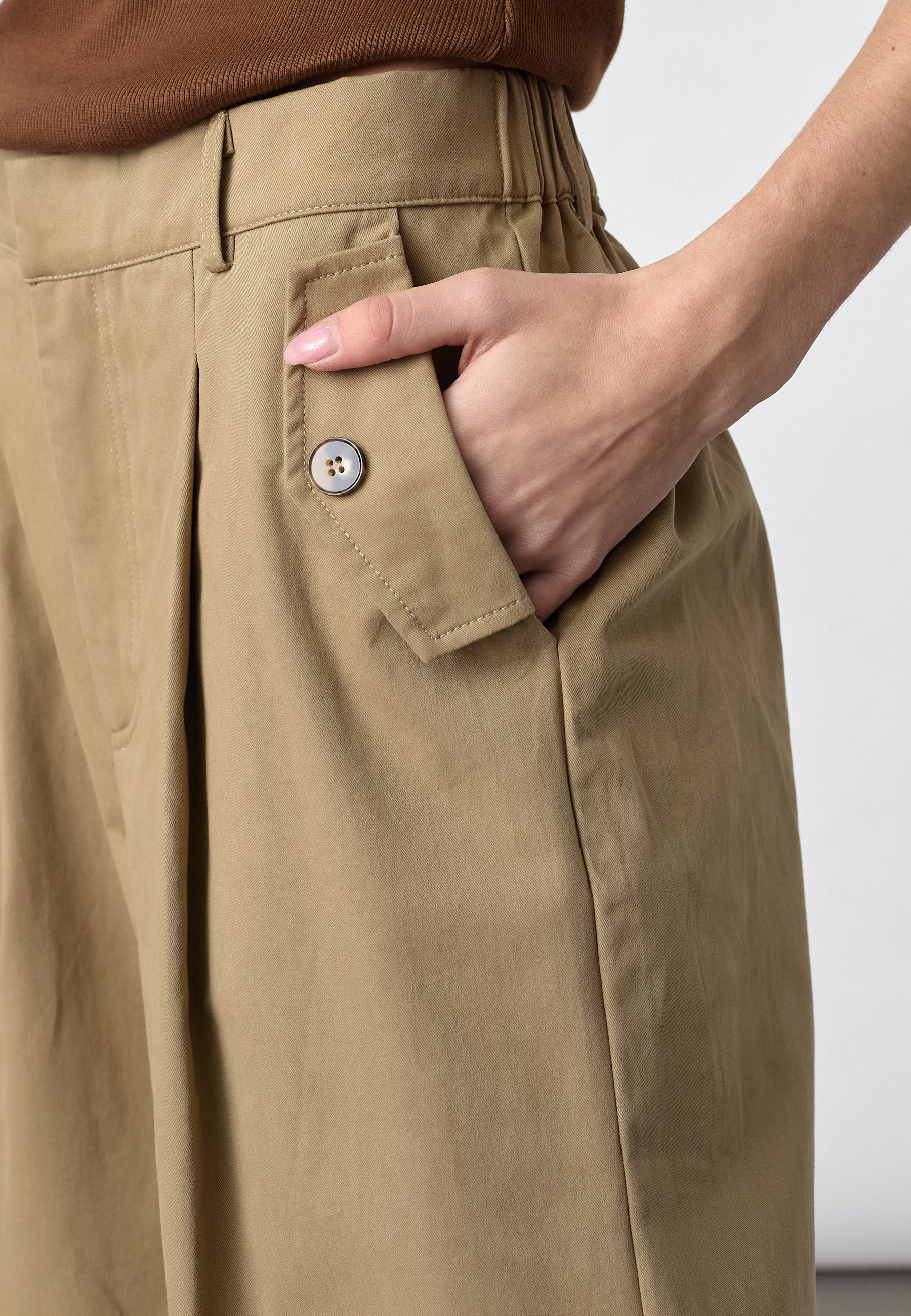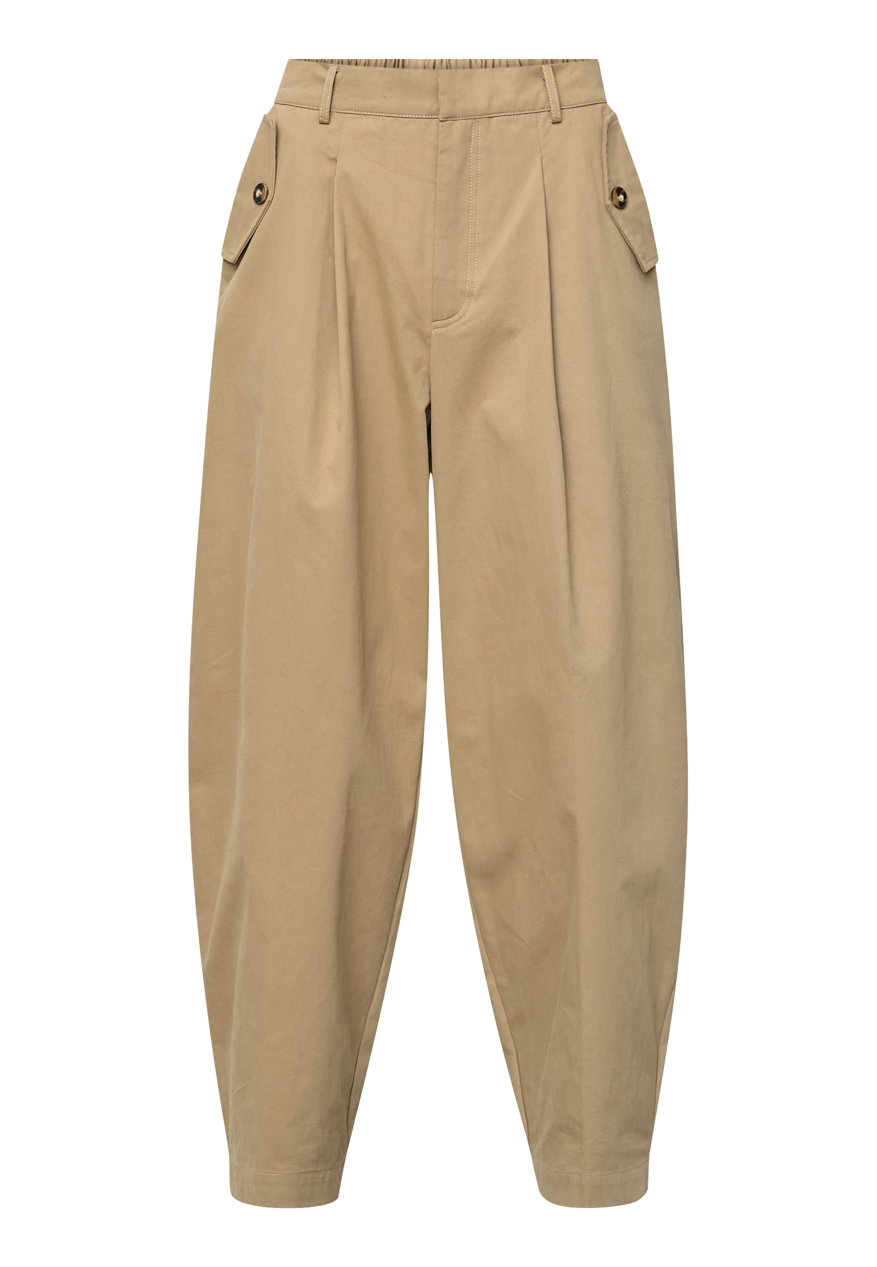 EDITH-PA is a stylish wide-leg trouser featuring a high-waist elastic band, tailored pleats, and unique buttoned pockets. Modellen har en str. S på