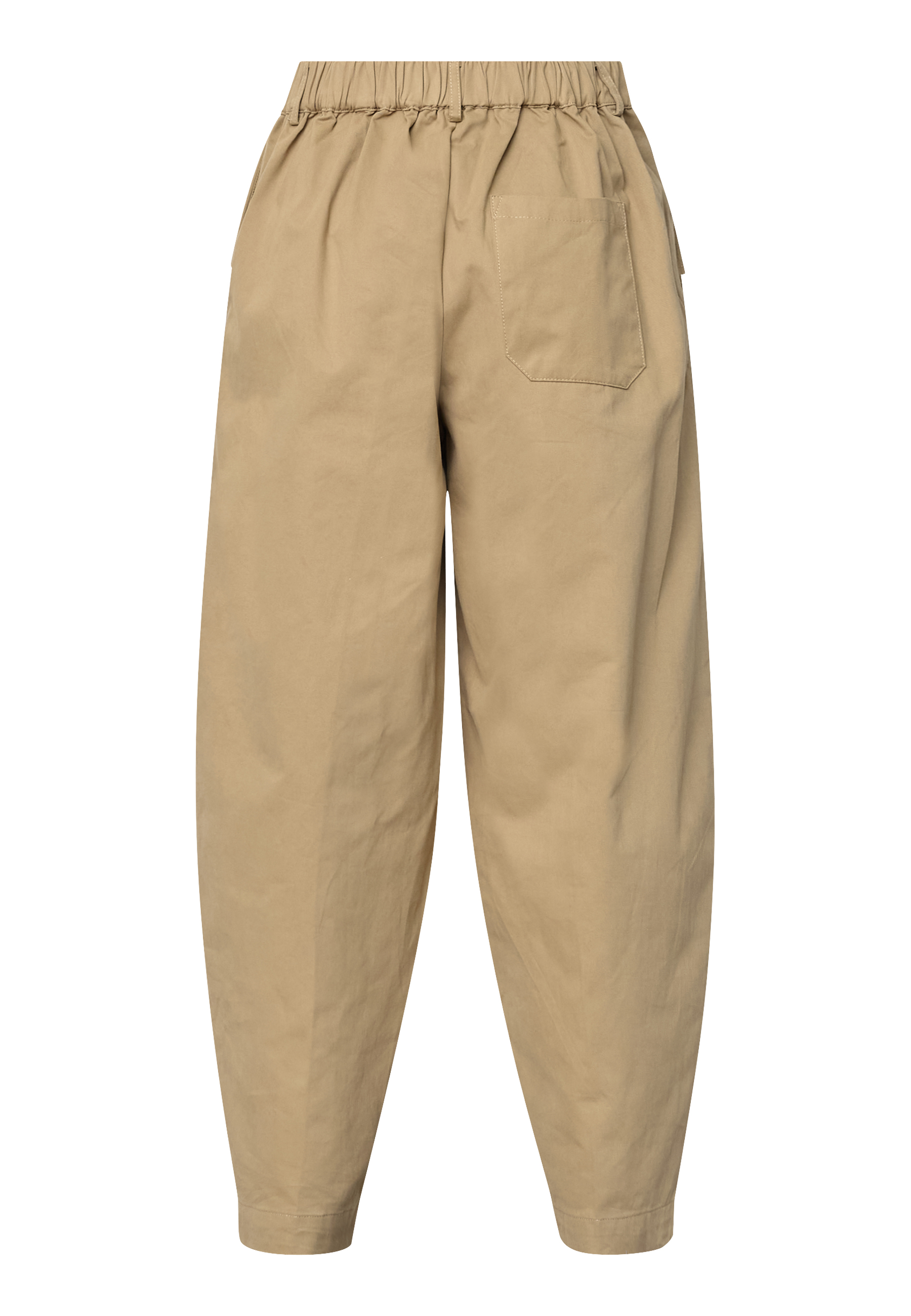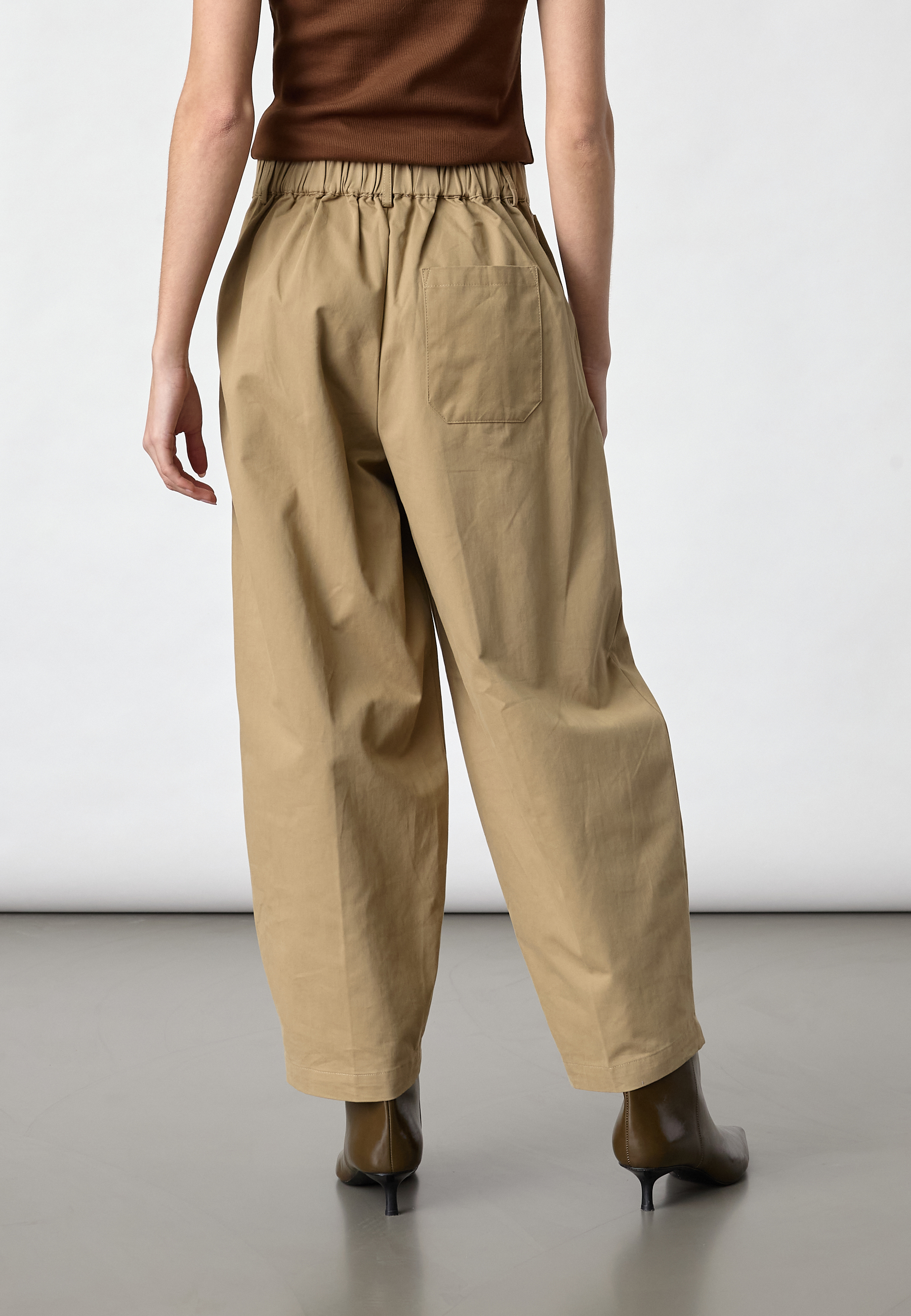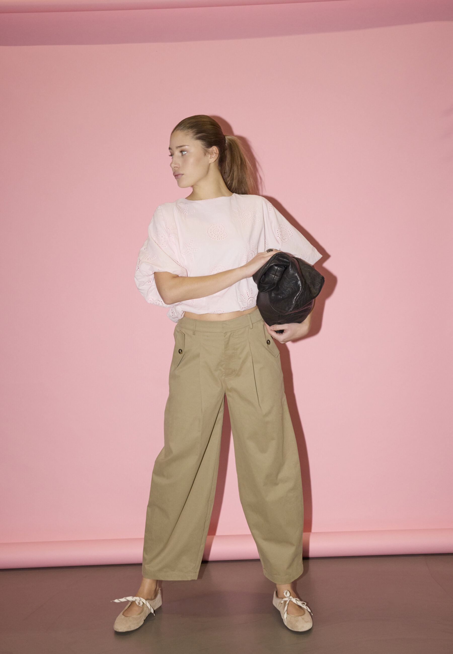 EDITH-PA is a stylish wide-leg trouser featuring a high-waist elastic band, tailored pleats, and unique buttoned pockets. Modellen har en str. S på