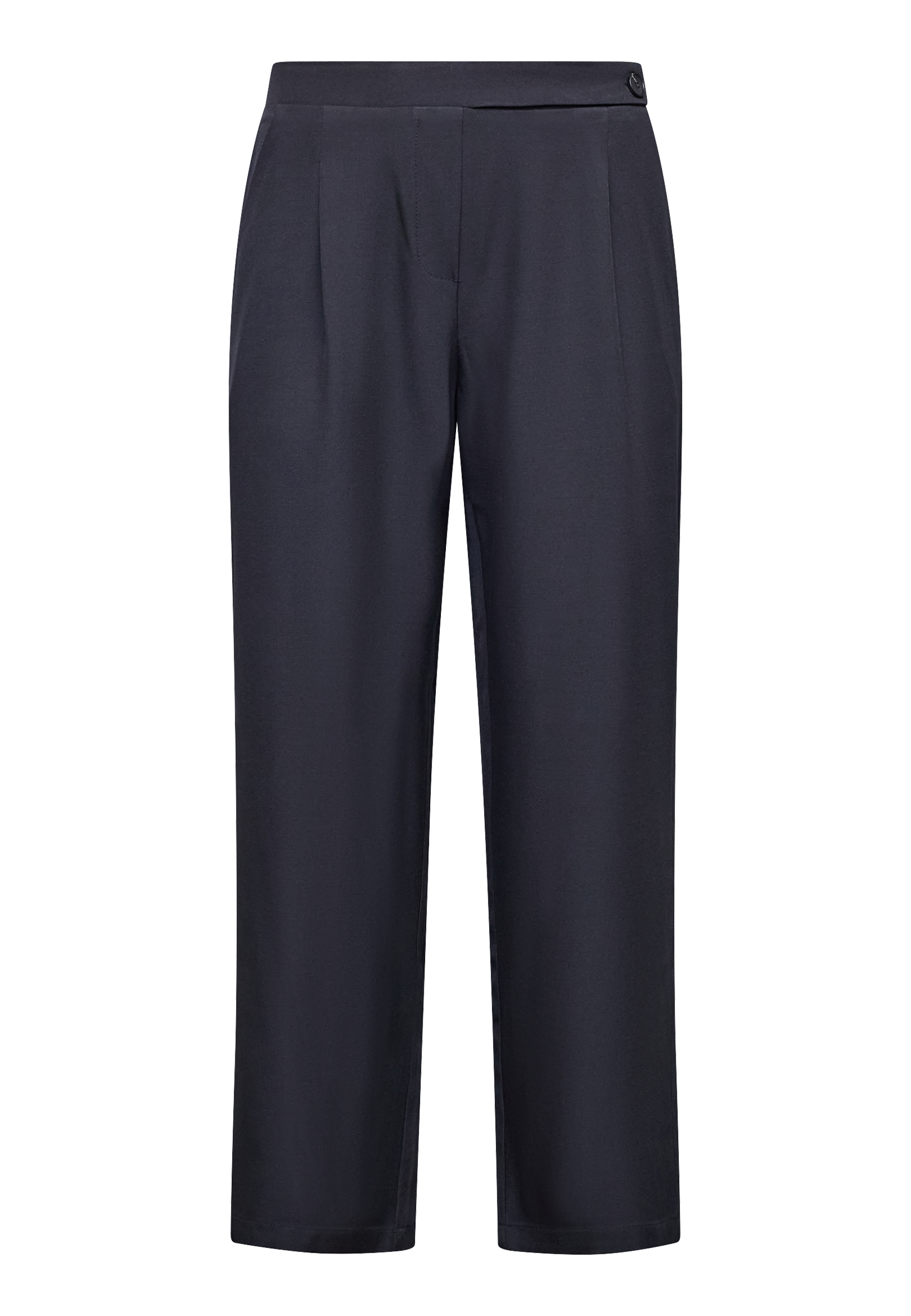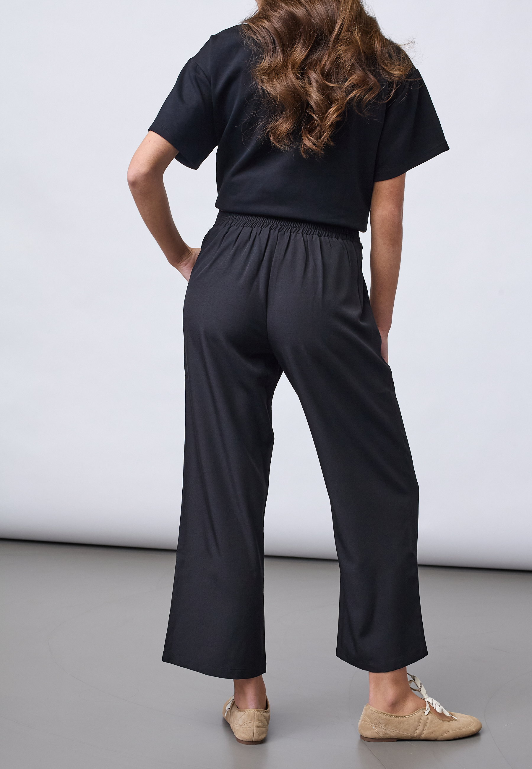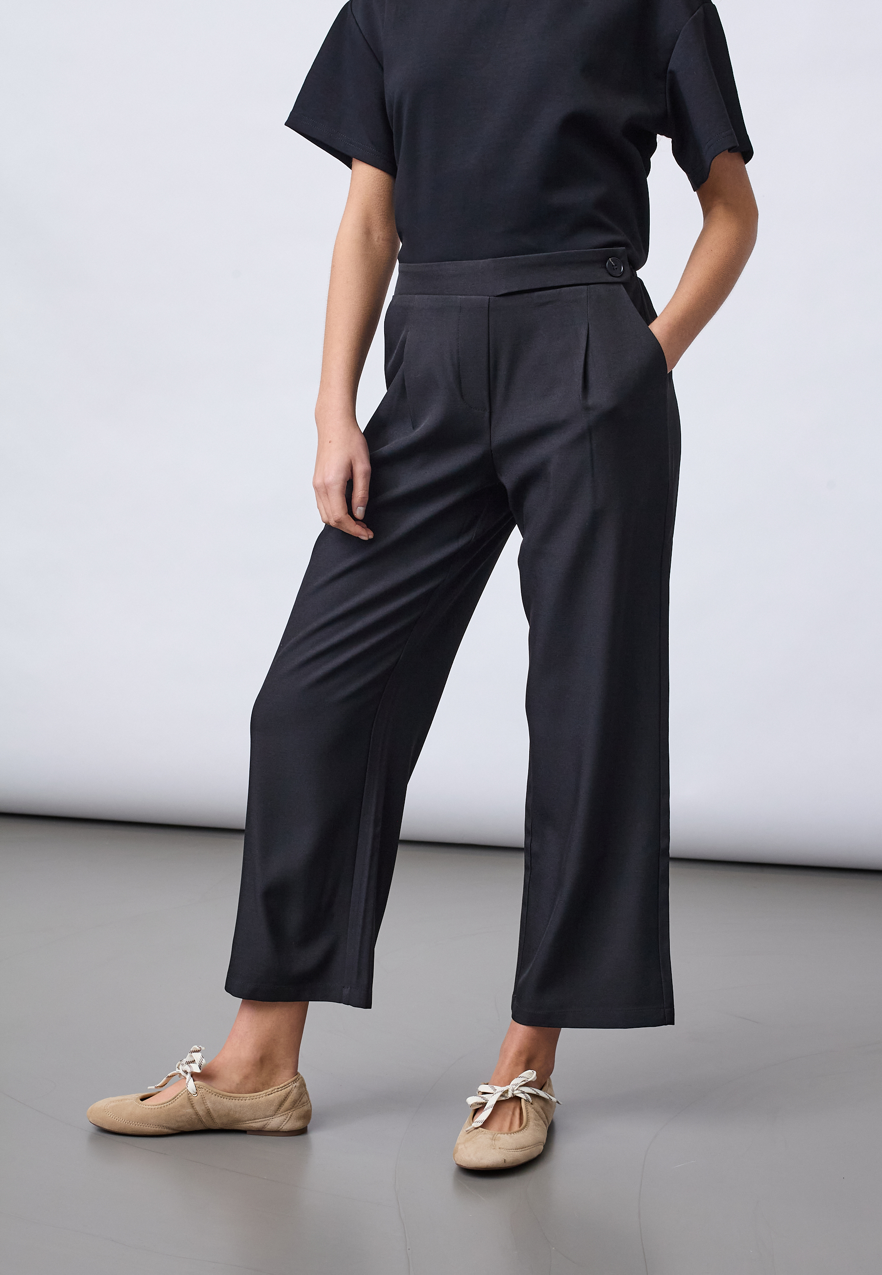 VIKSA-PA.CROP is a culotte pant, with a tailored look and modern comfort. The design includes pleats at the front, practical side pockets and a decorative button detail at the waist. The model is wearing a size S and is 175 cm tall.