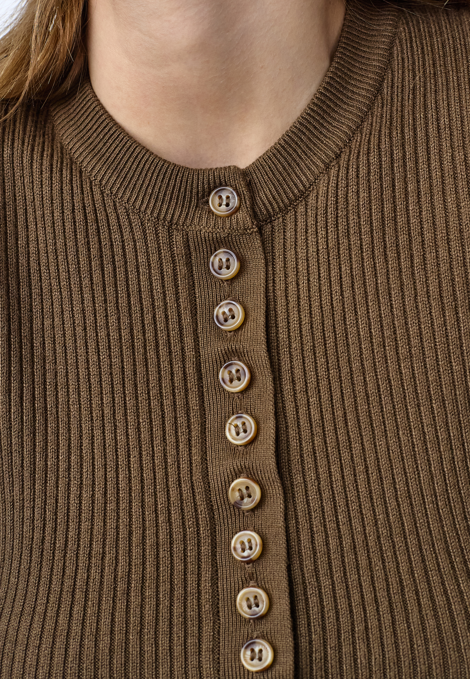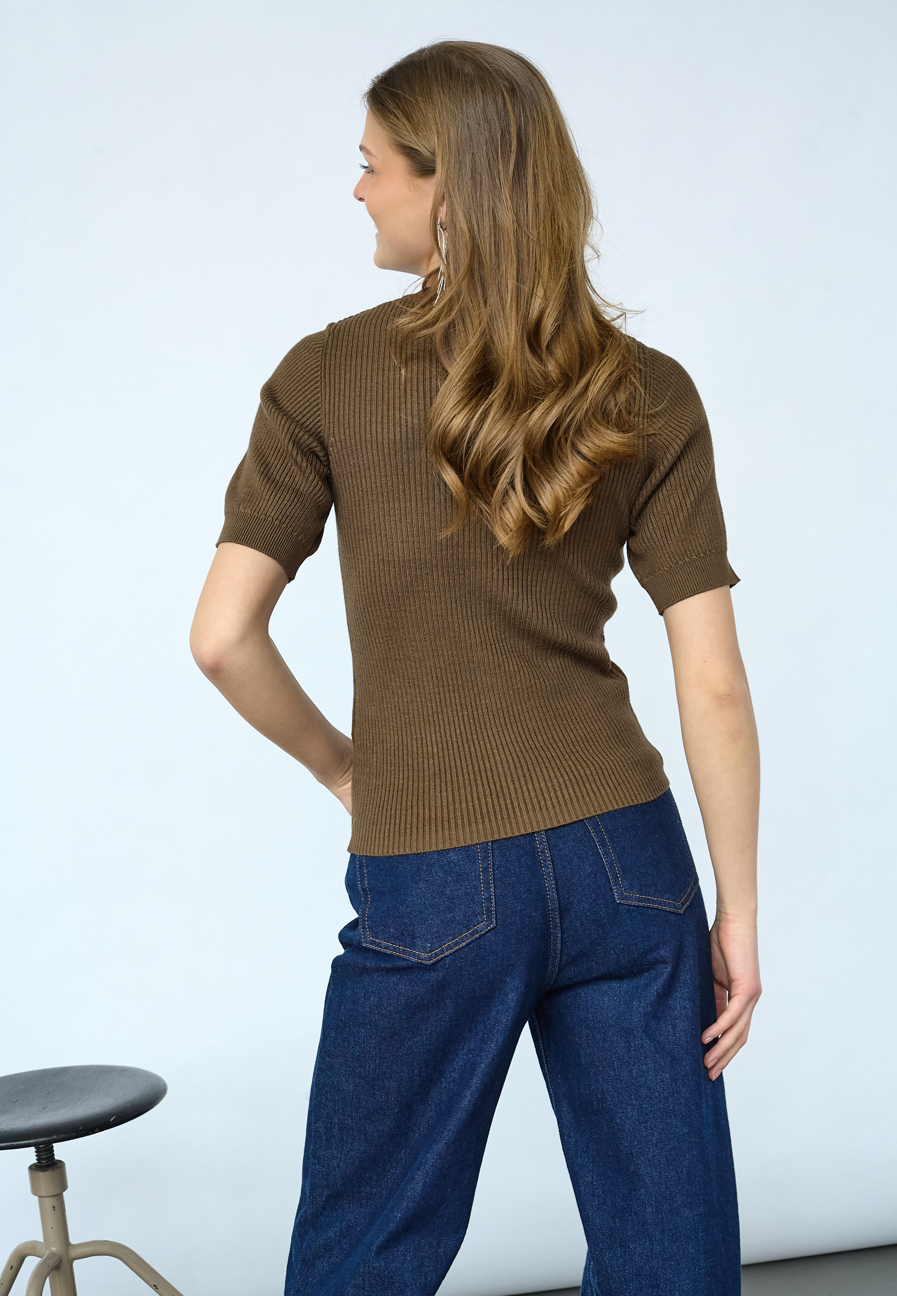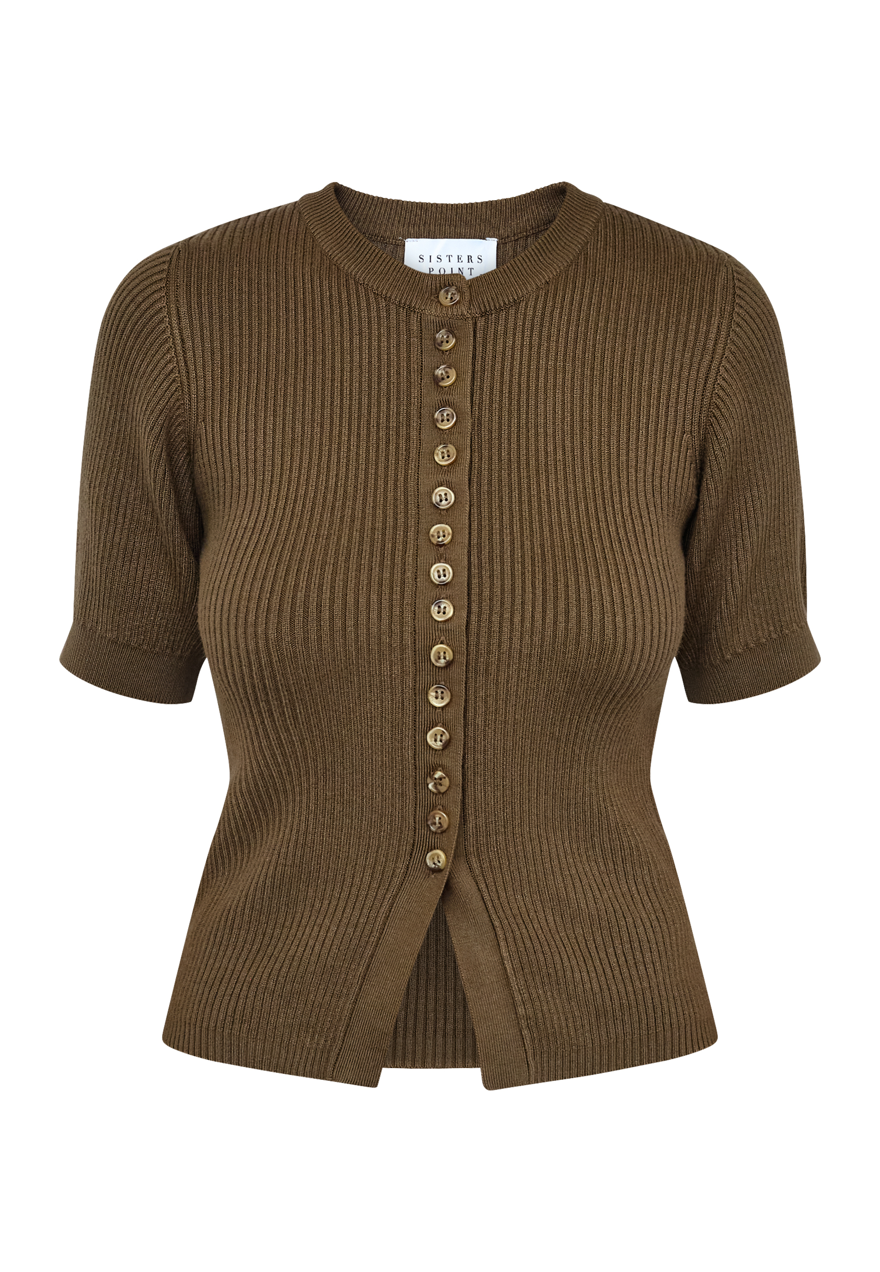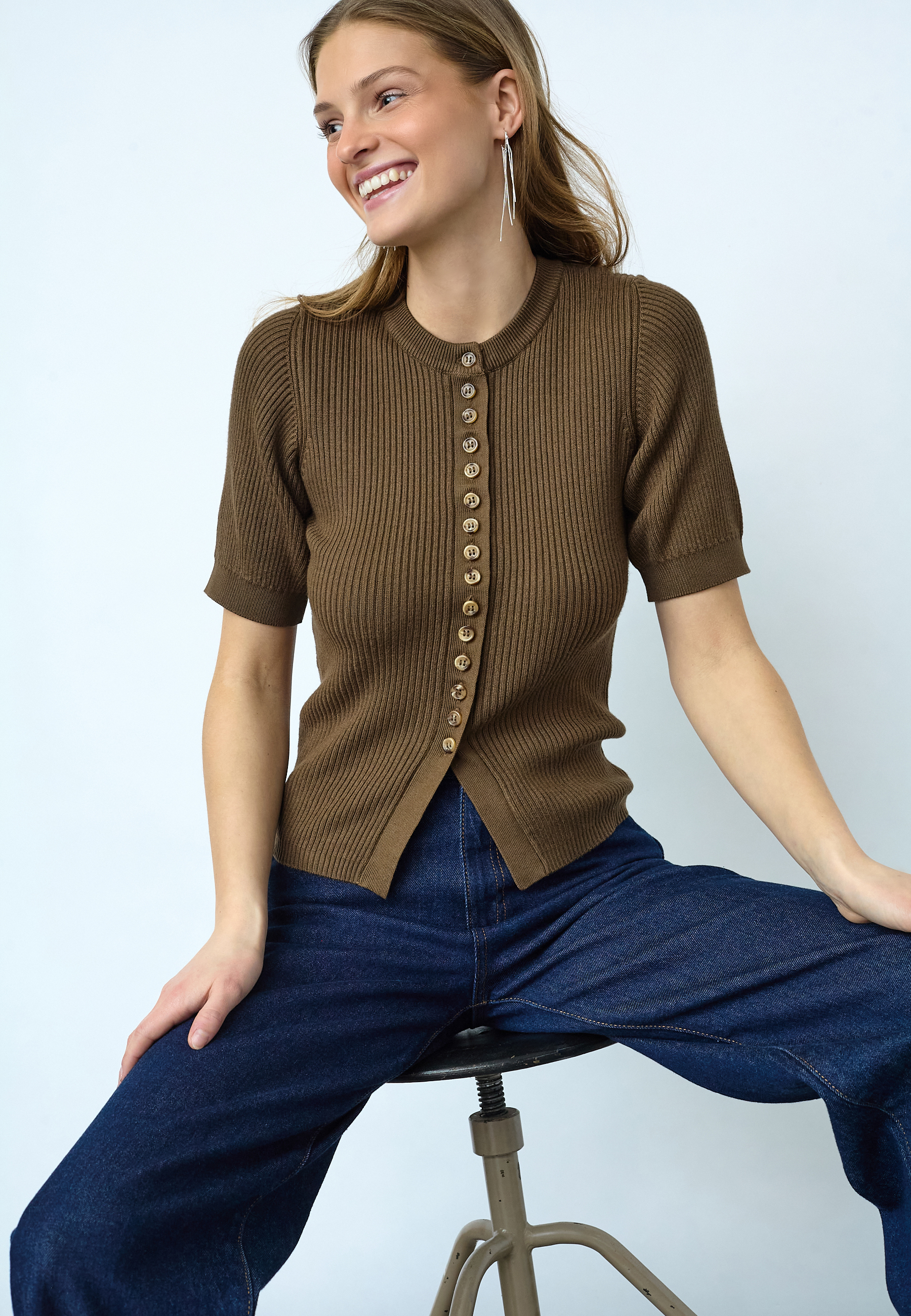 HALIA-NEW.SS is a tight-fitting rib-knit top with short sleeves and a full button-down front. Featuring a classic crew neck and a flattering slim-fit silhouette in a soft, premium finish. Modellen har en str. S på.