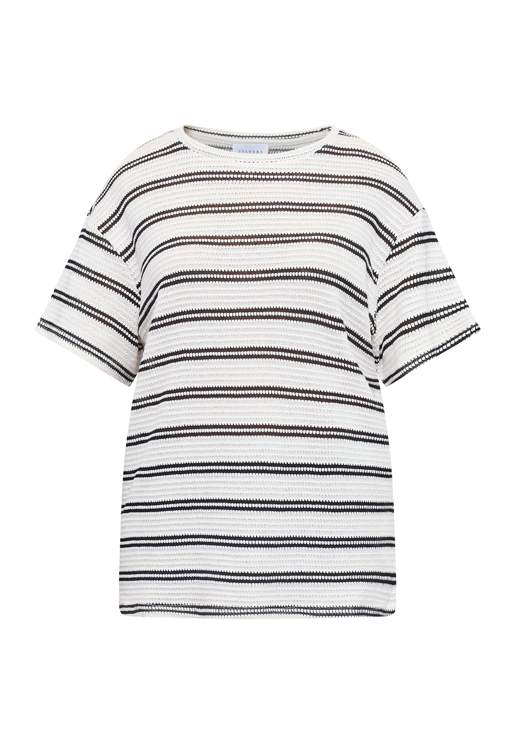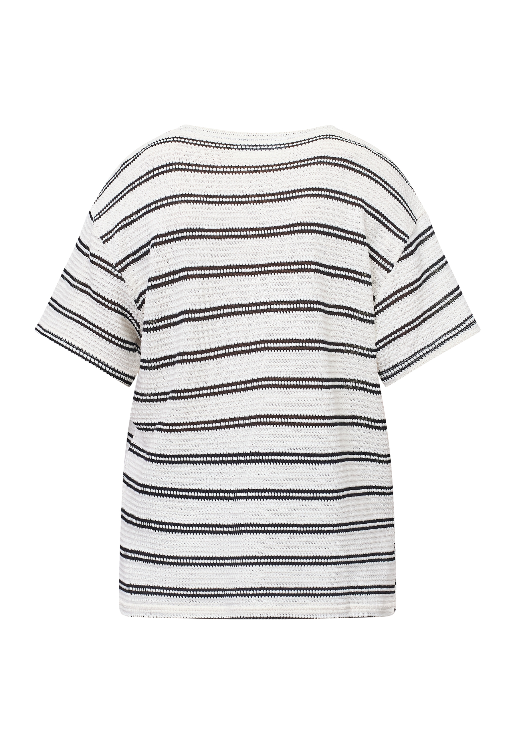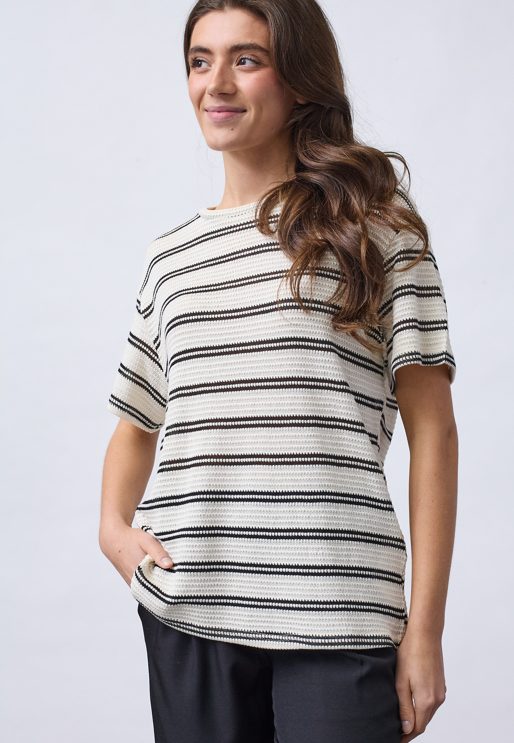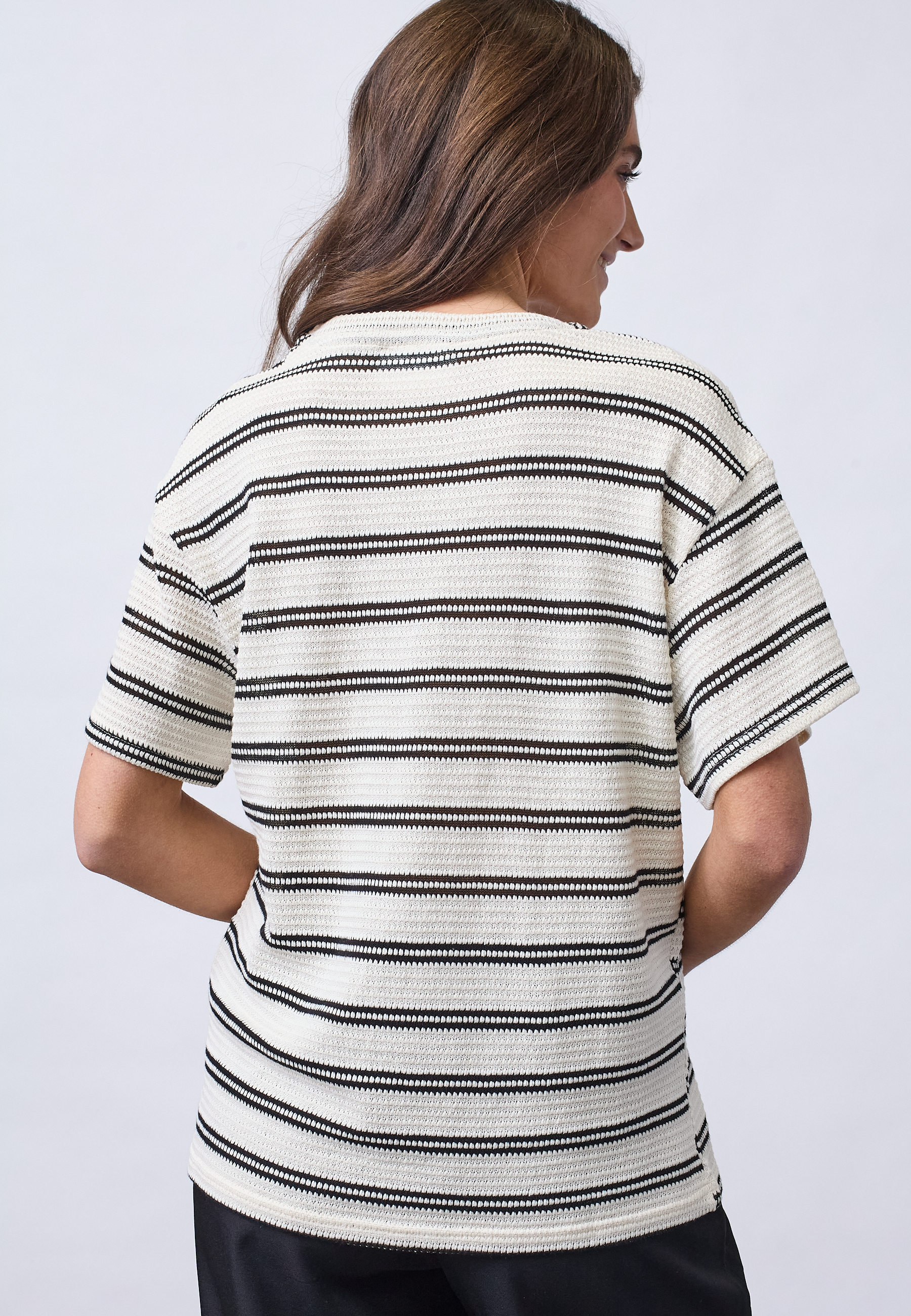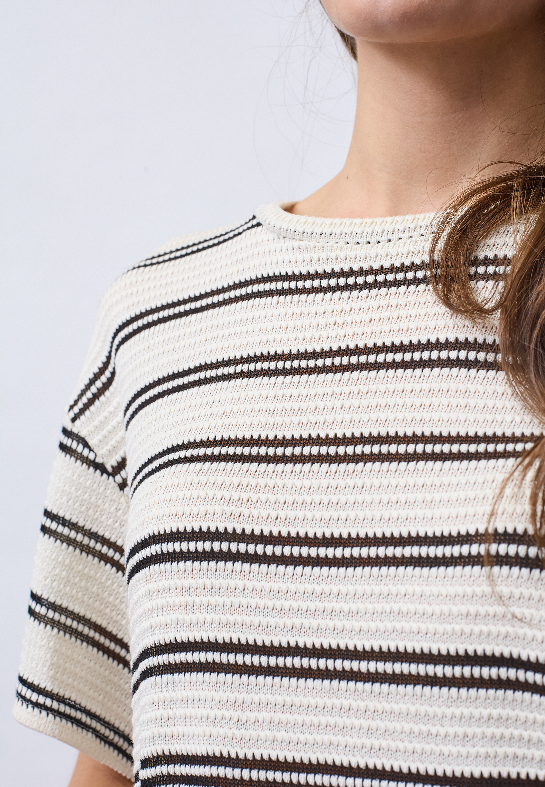 VEDA-SS1 is a knitted blouse with a unique textured structure and a timeless striped pattern. The design is characterized by an elegant neckline and a comfortable fit. The model is wearing a size S.