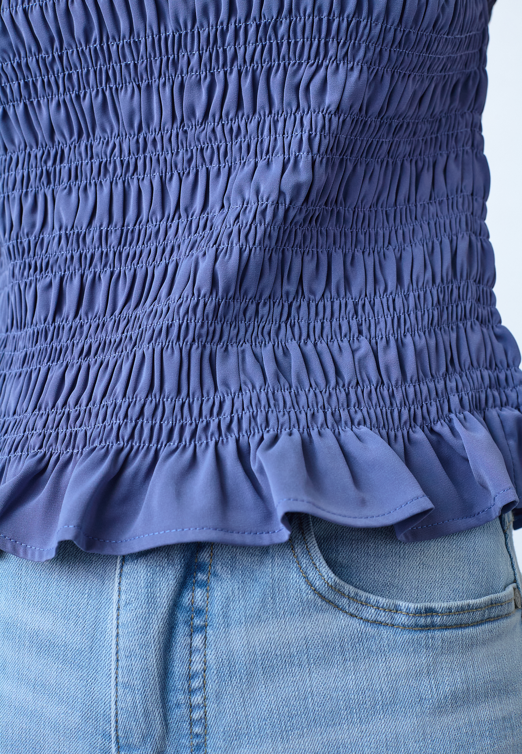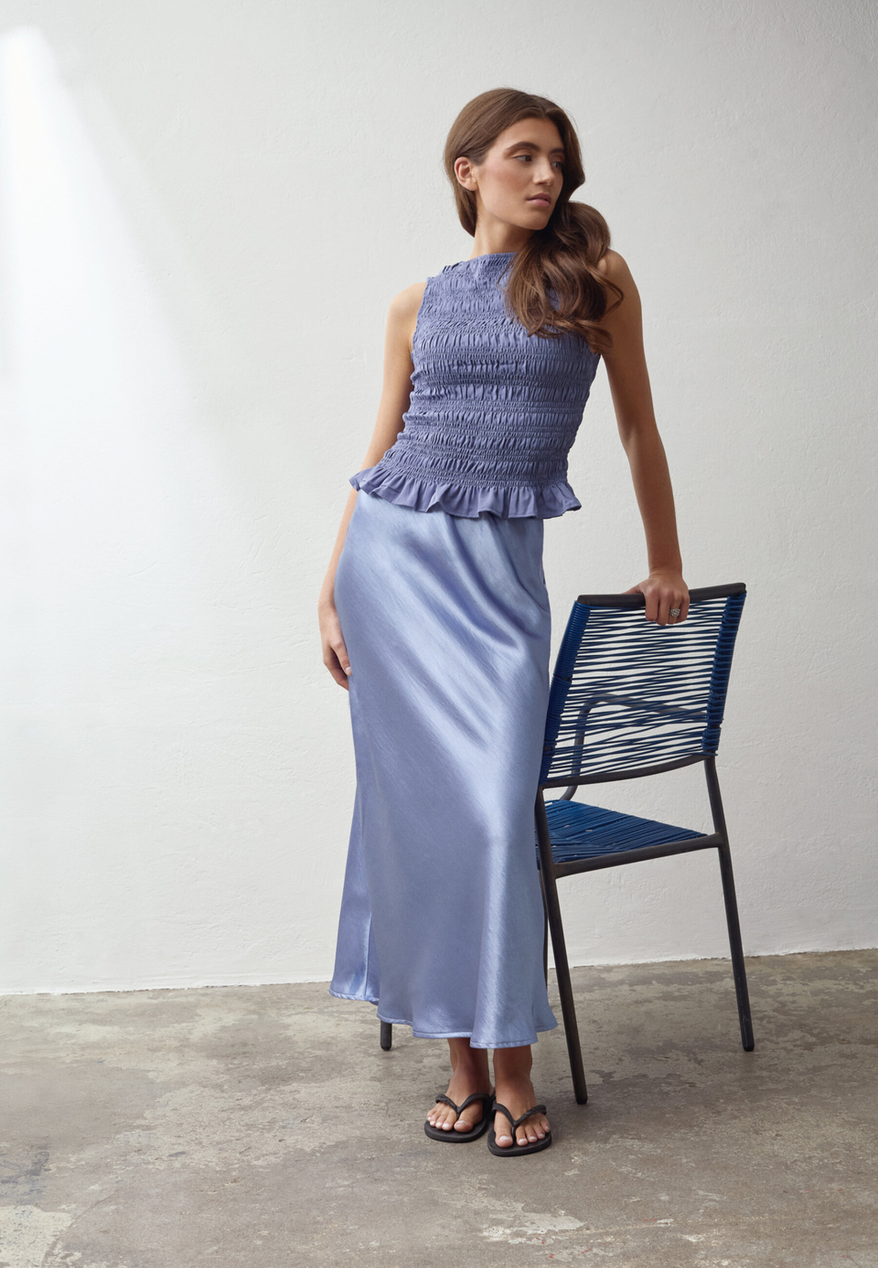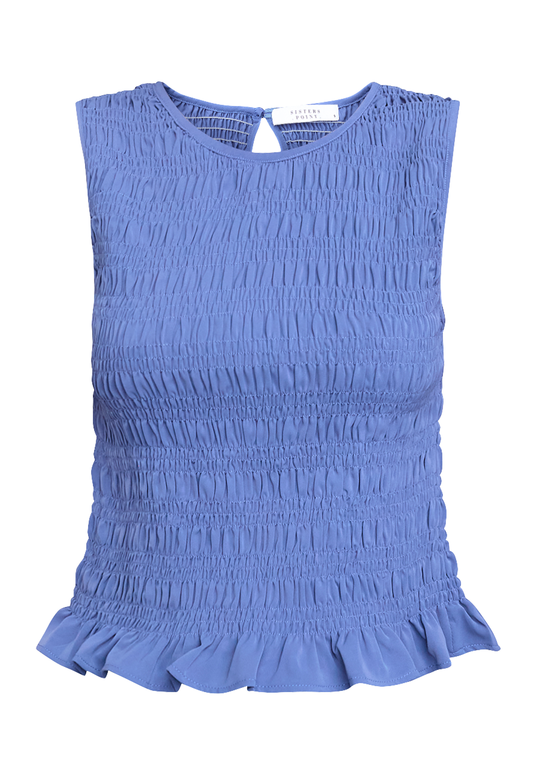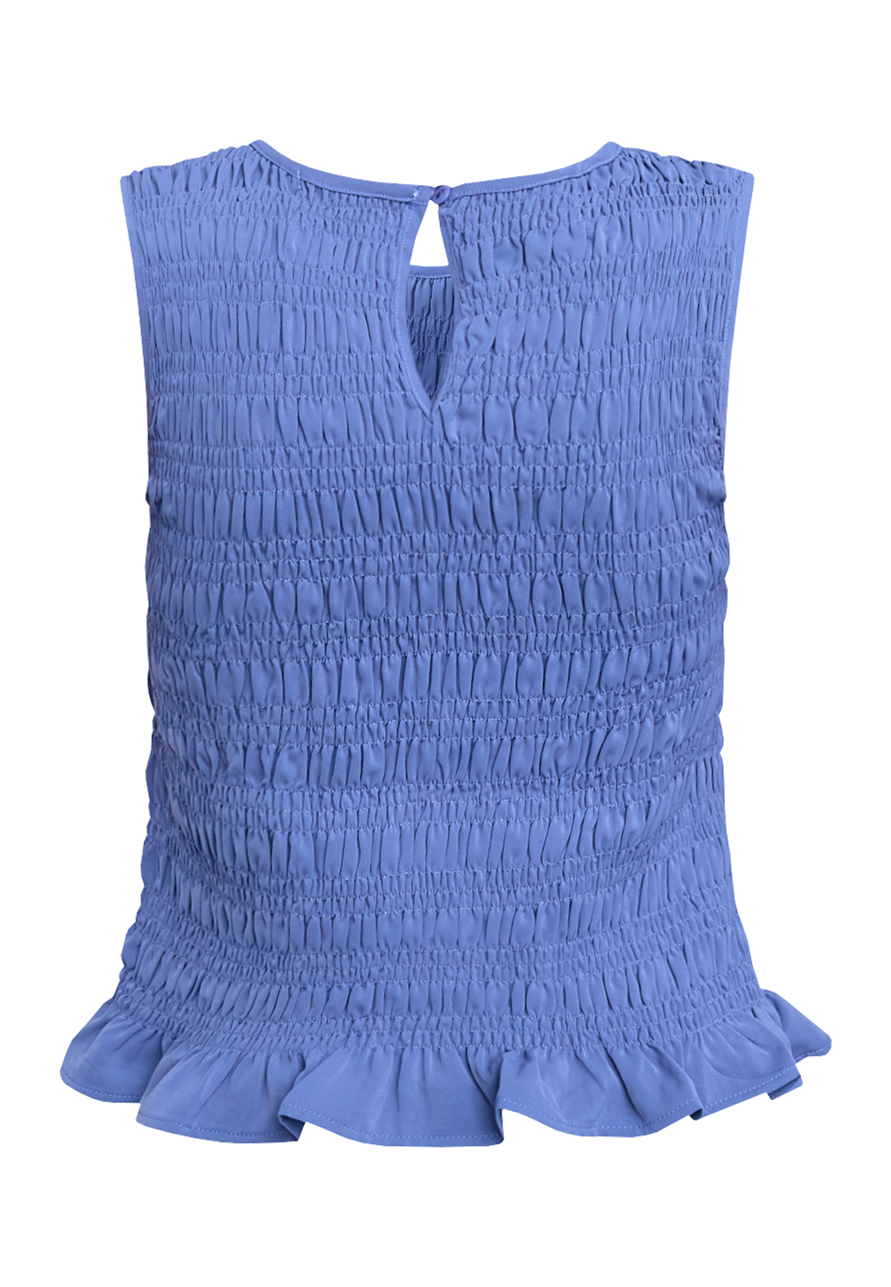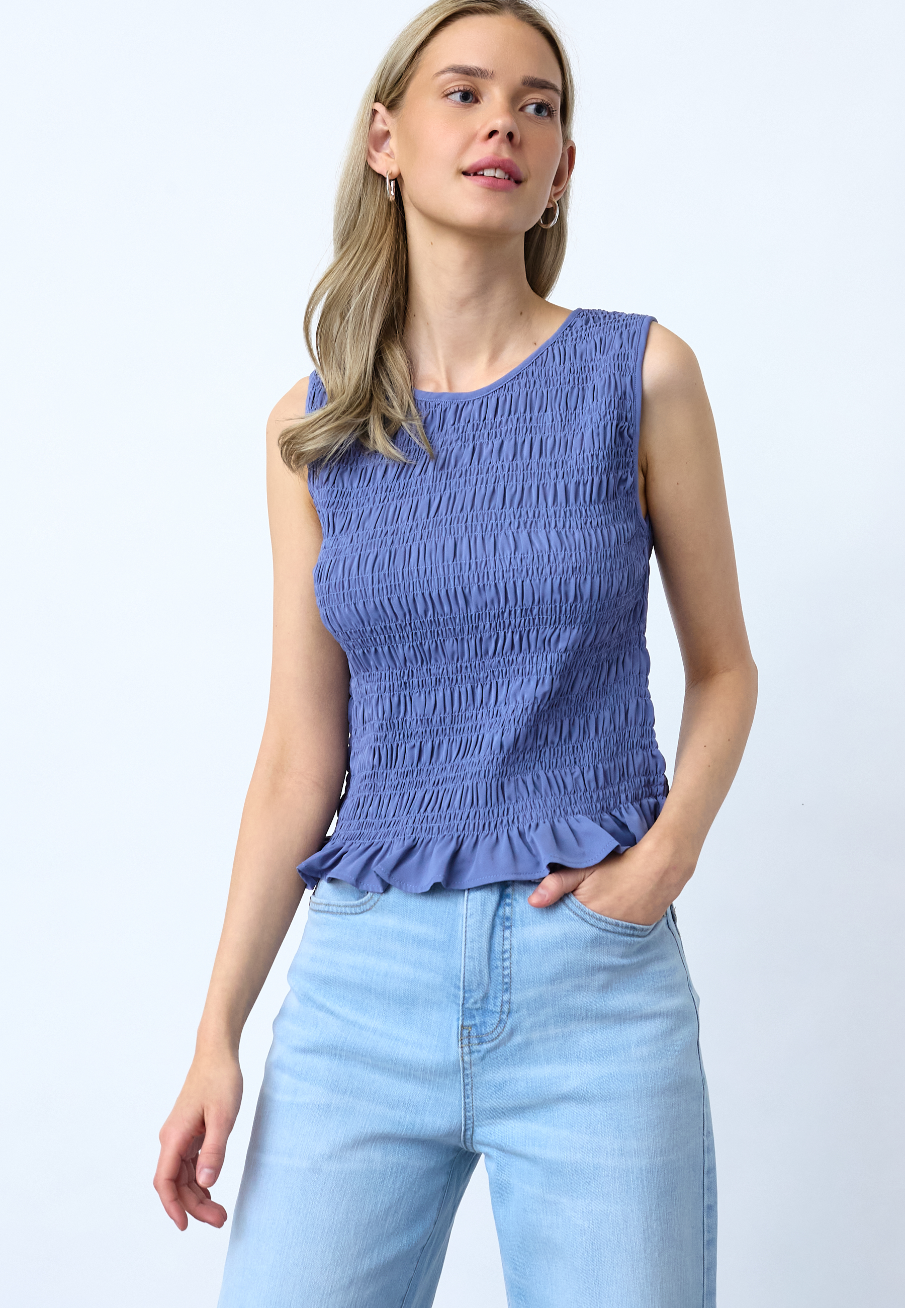 NIX-TOP is a sleeveless top with a continuous smock structure over the entire body, ensuring a tight fit. The top has a round neck. The model is wearing a size S.