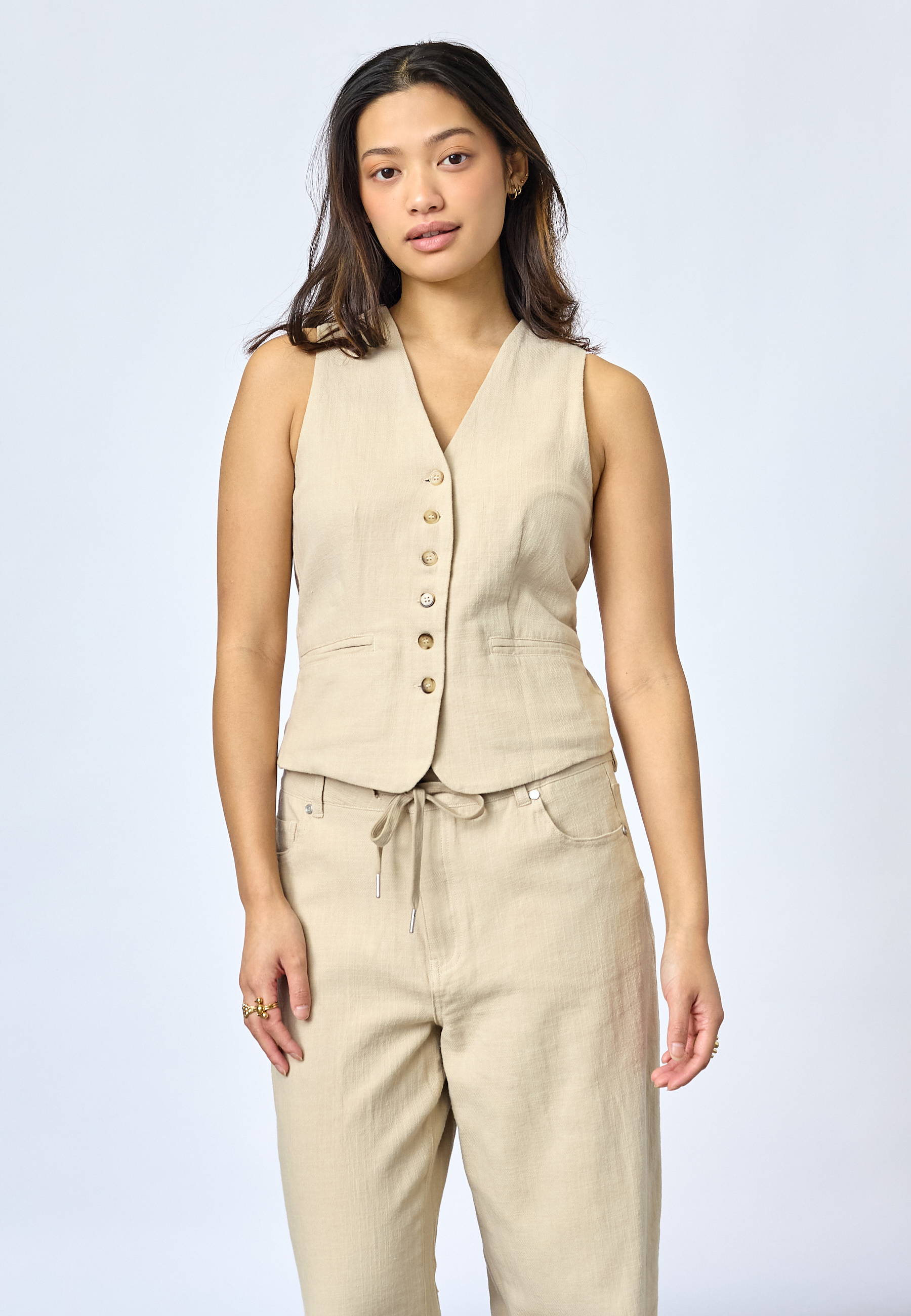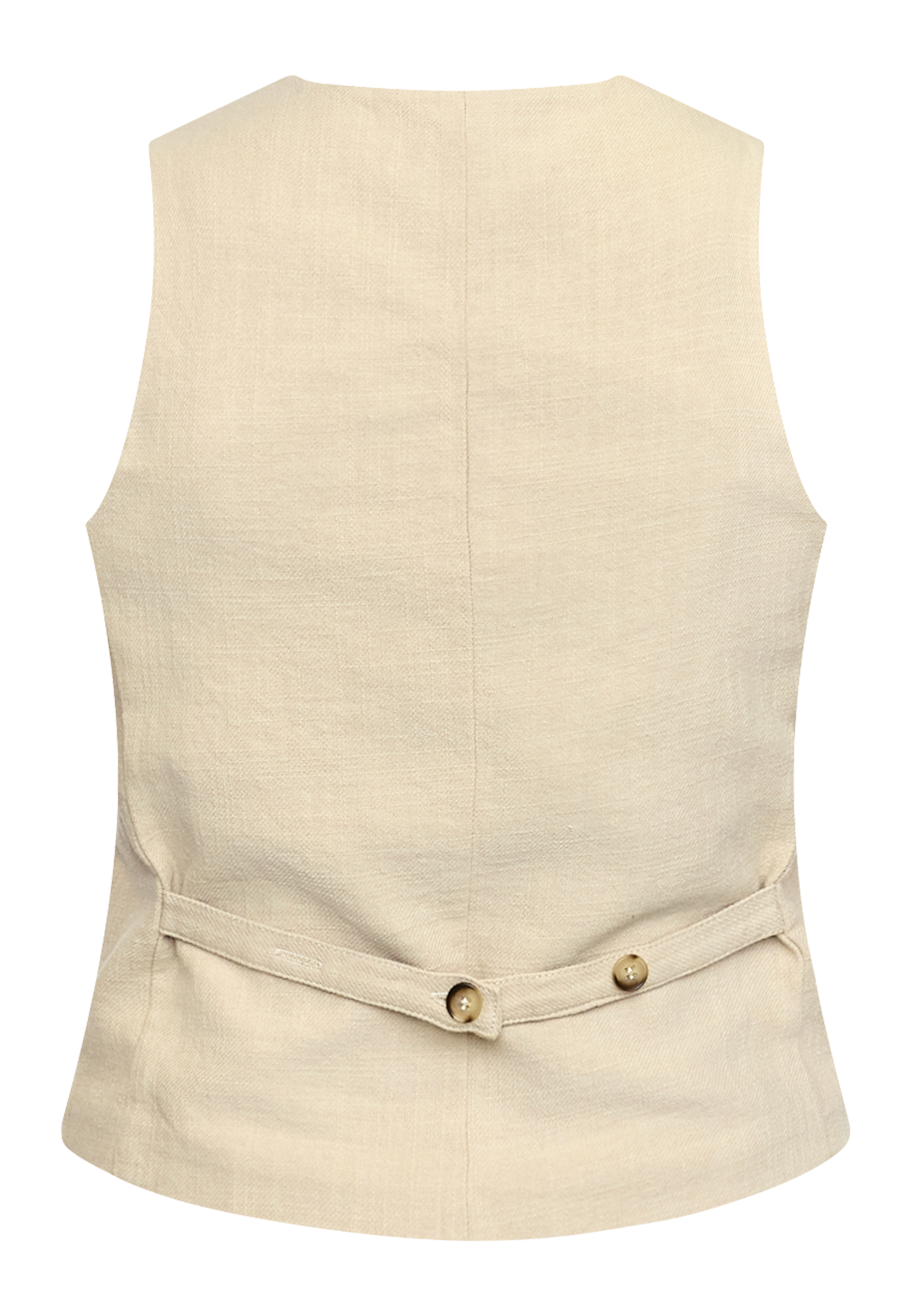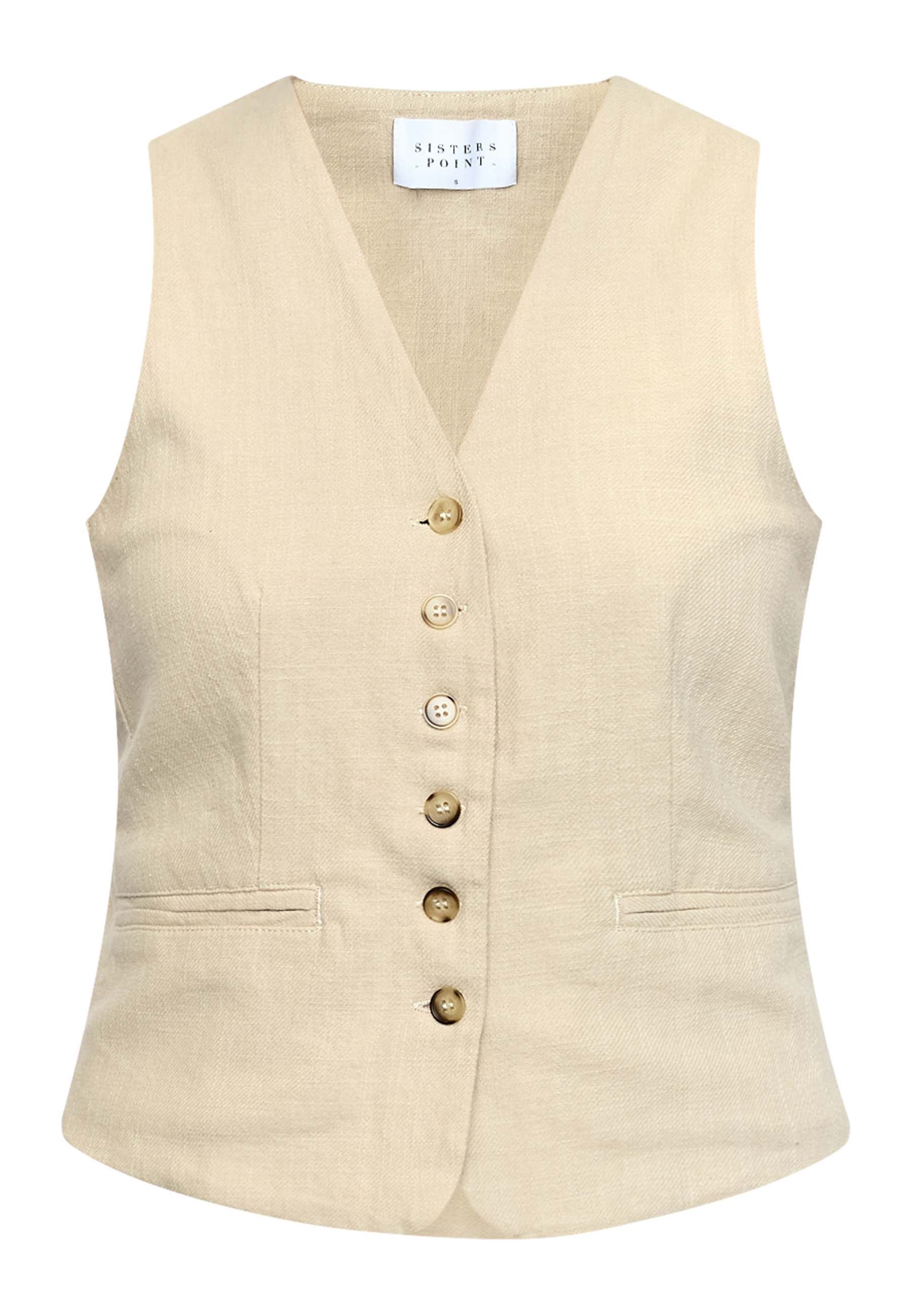 FILLO-VE is a classic vest featuring a V-neck, button-down front, and decorative faux pockets. The model is wearing a size S.