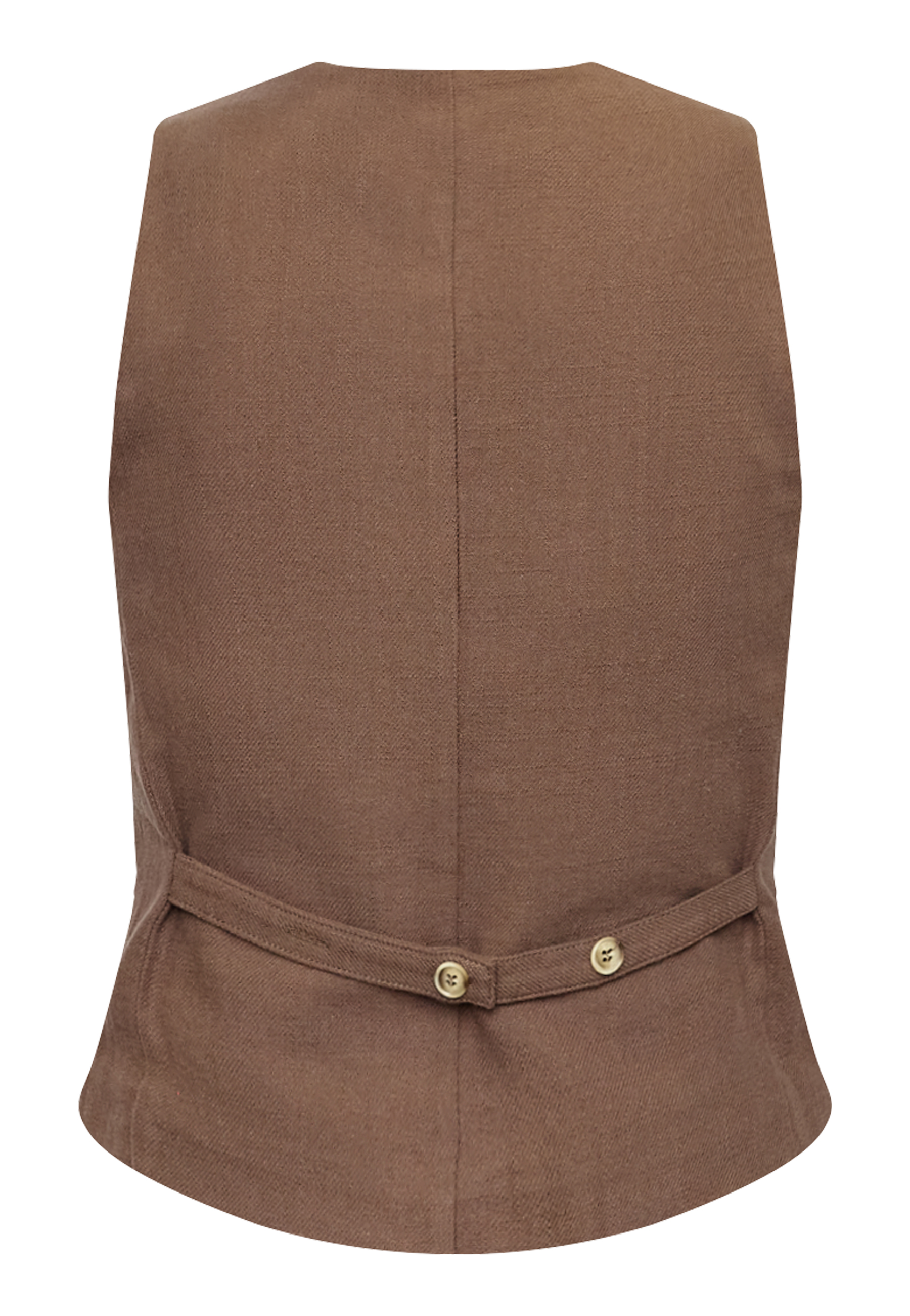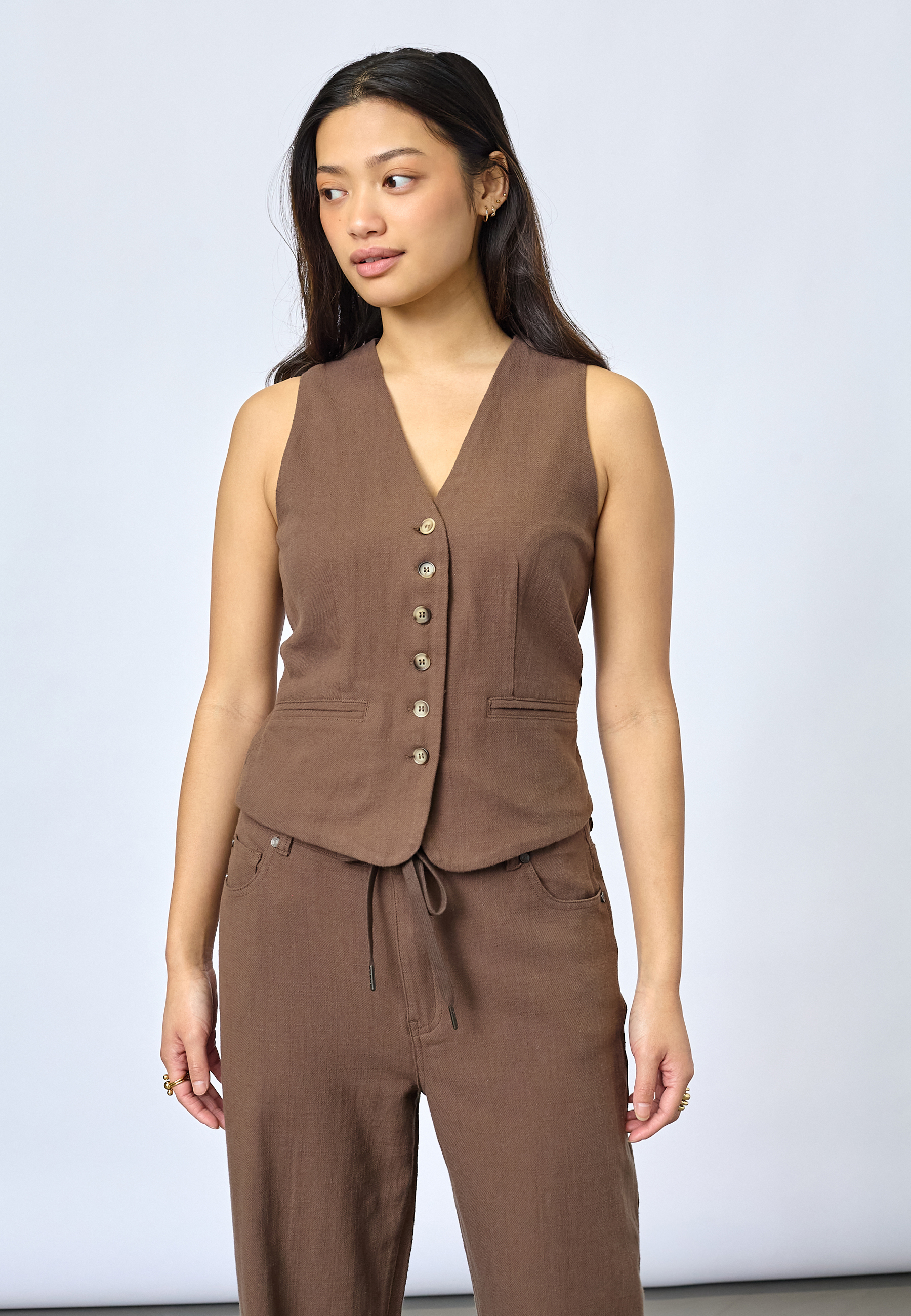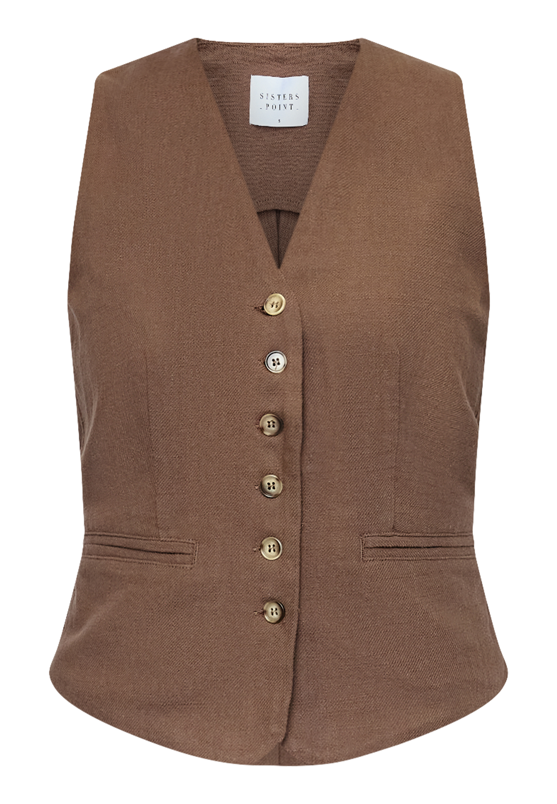 FILLO-VE is a classic vest featuring a V-neck, button-down front, and decorative faux pockets. The model is wearing a size S.