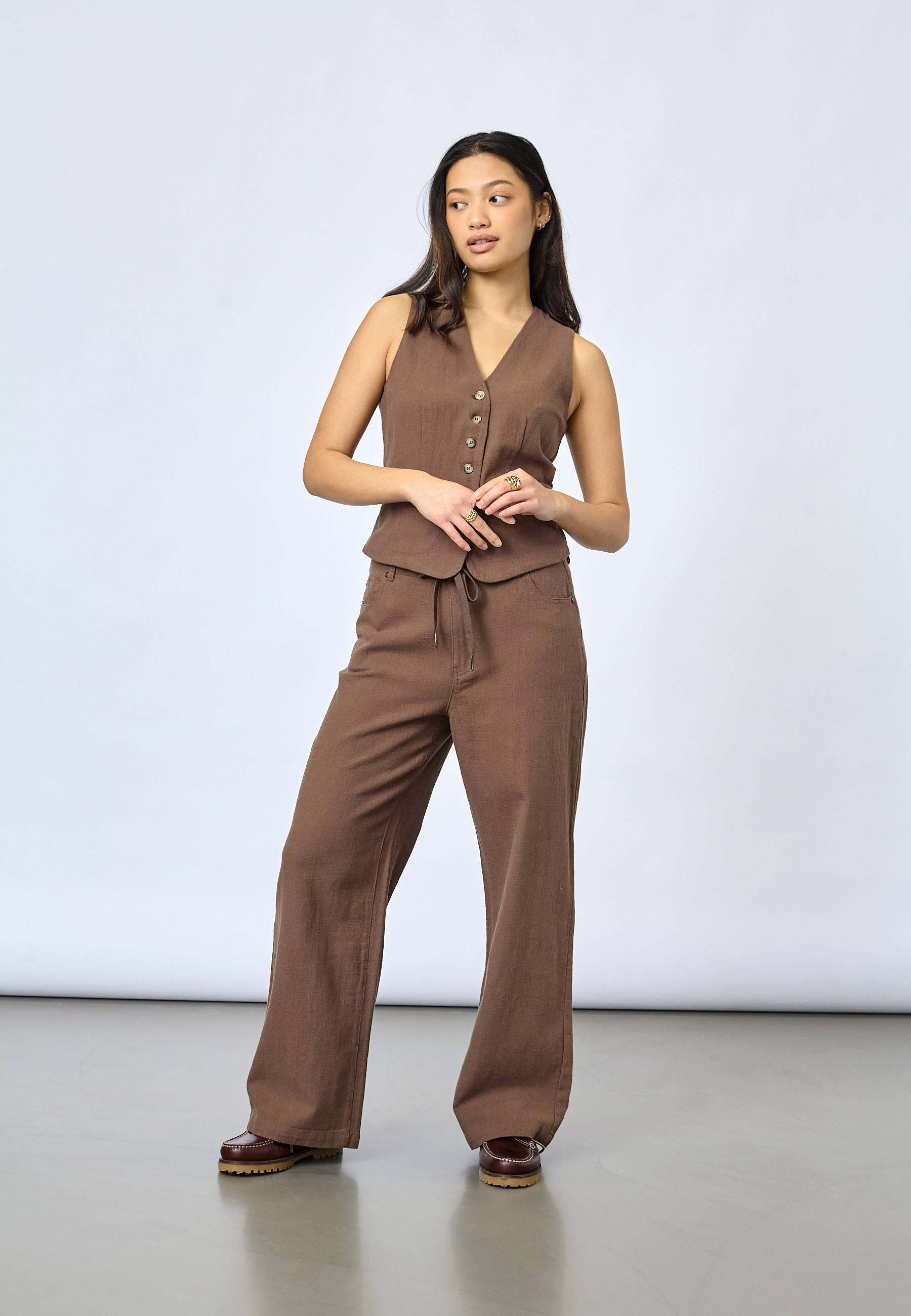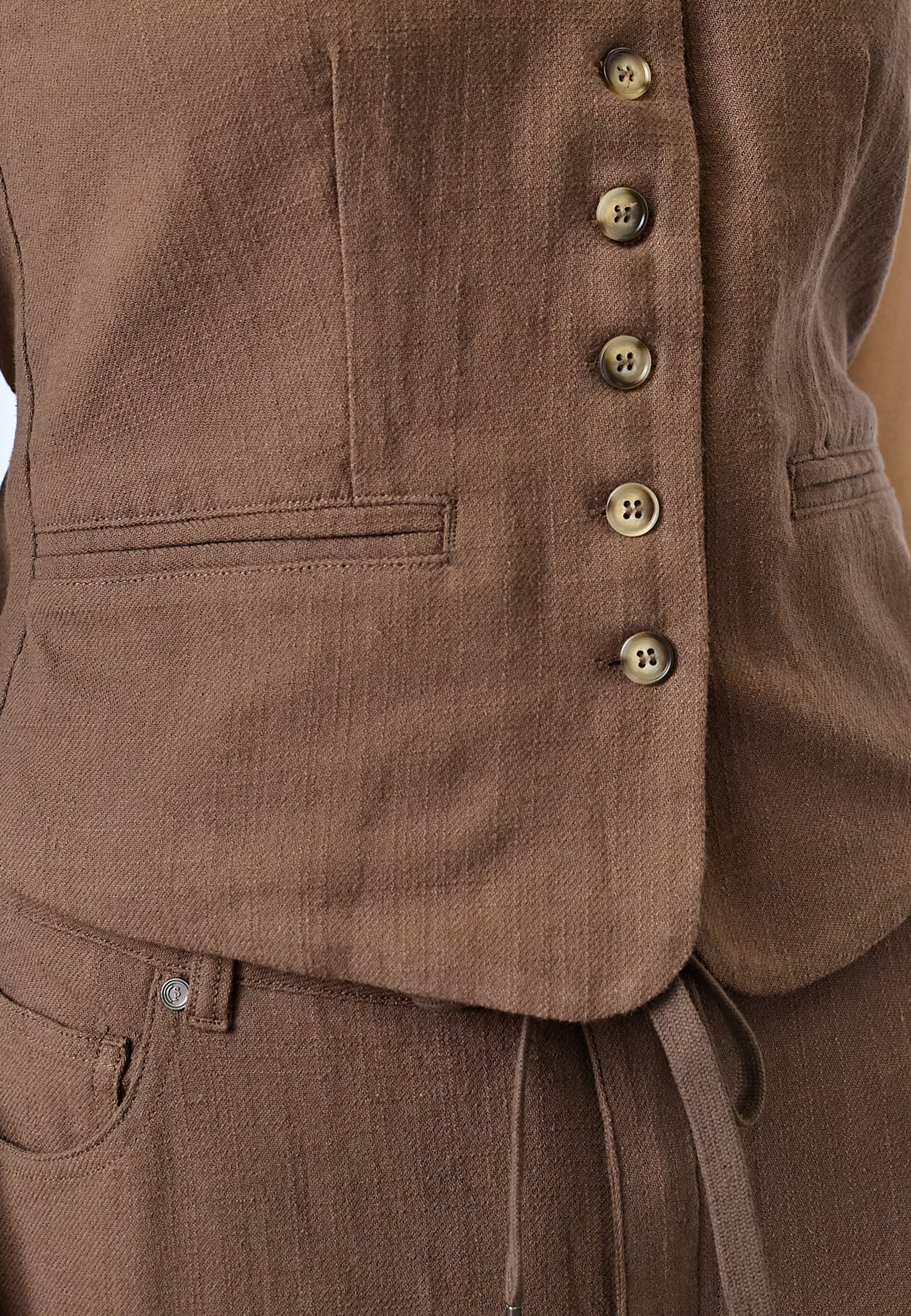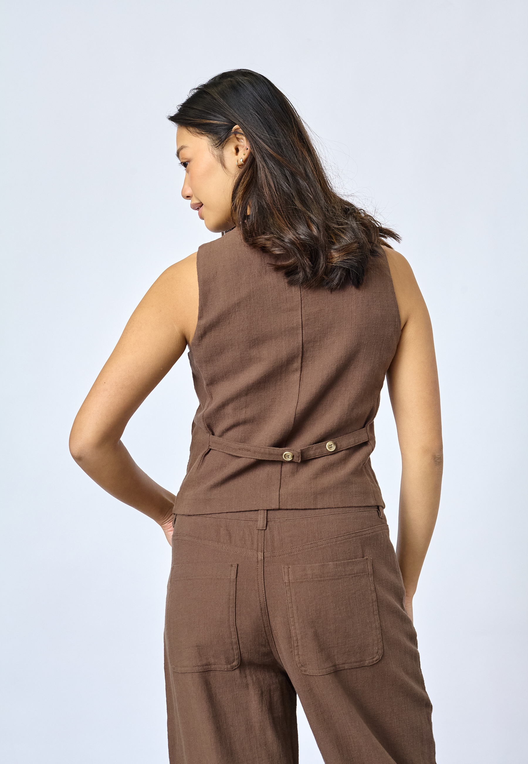FILLO-VE is a classic vest featuring a V-neck, button-down front, and decorative faux pockets. The model is wearing a size S.