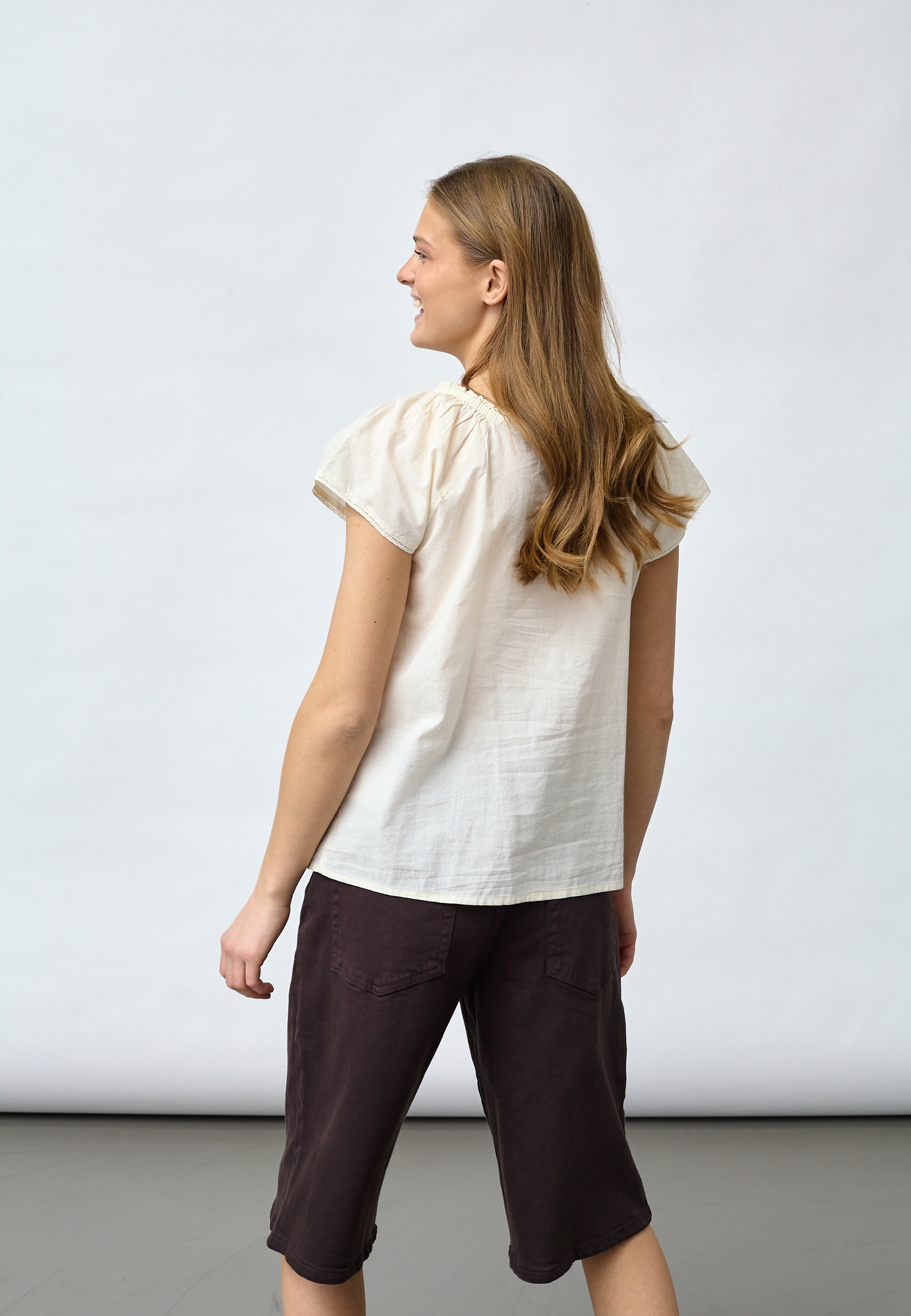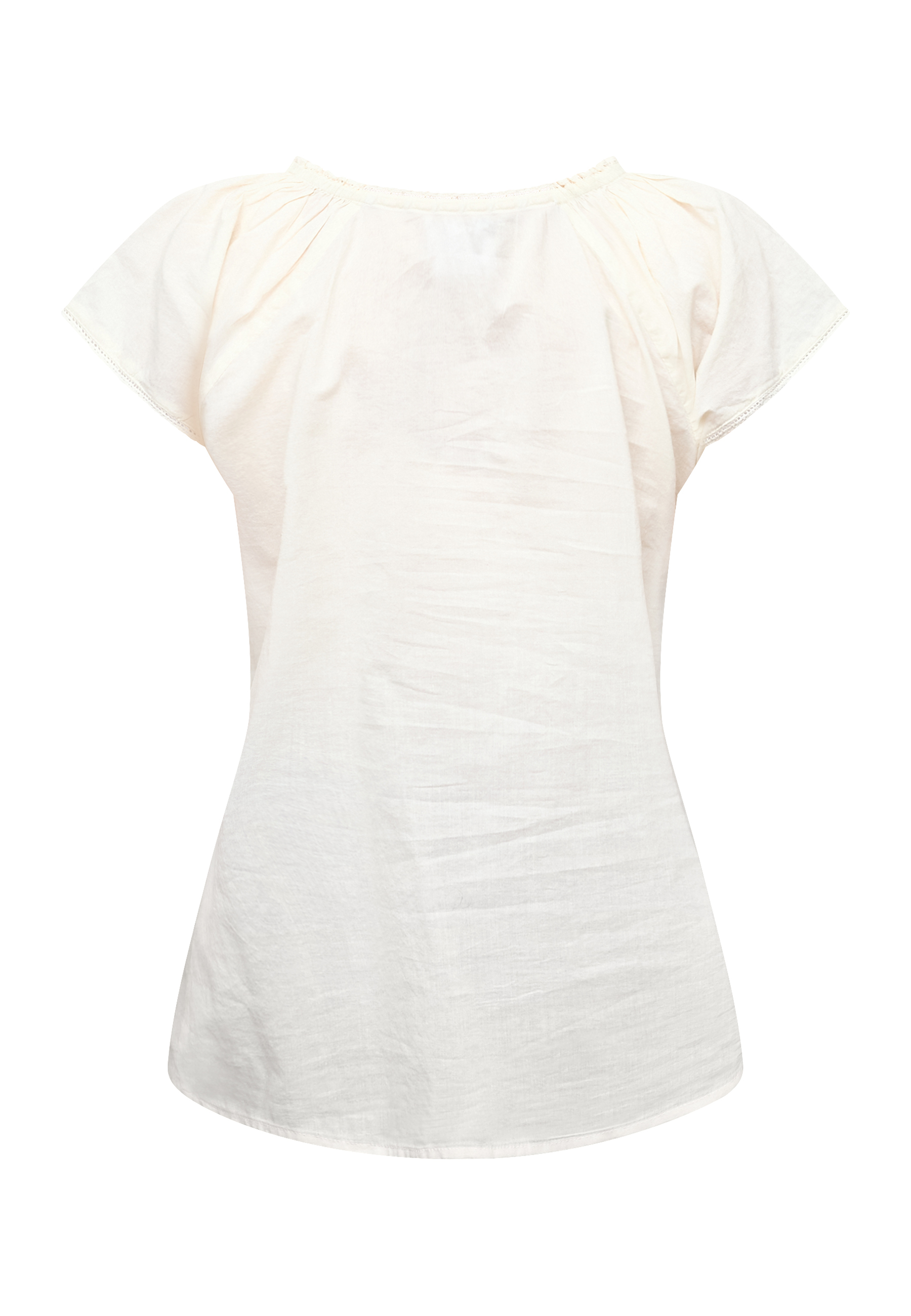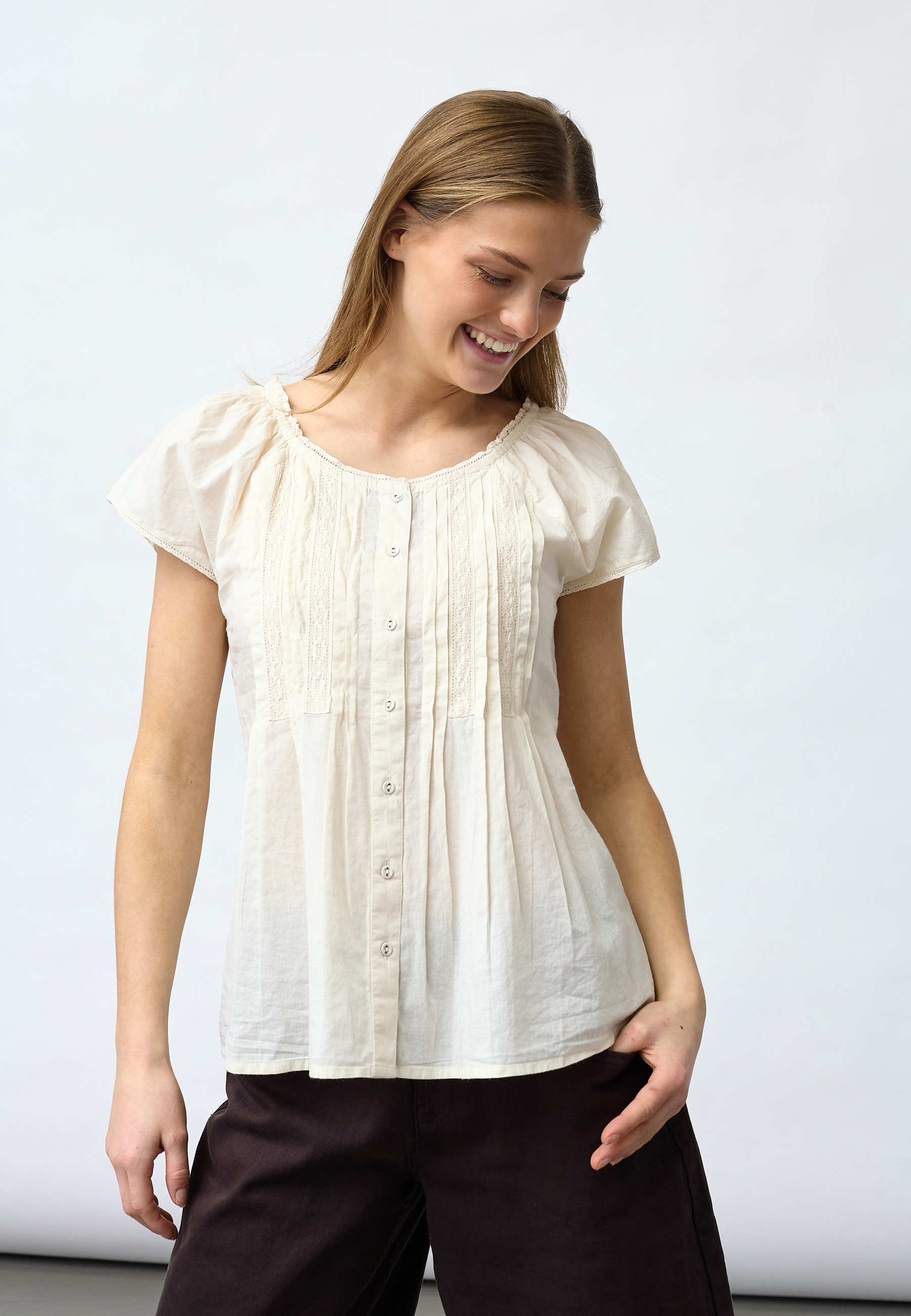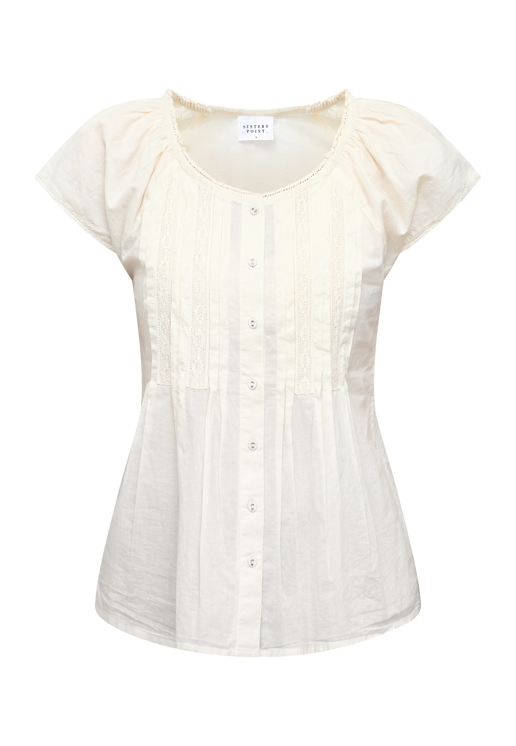 ISABA-SL is a feminine blouse in light cotton quality with fine pleats and lace inserts on the chest. The top has a classic button closure, a round neckline with ruffled edges and short puff sleeves. The model is wearing a size S.