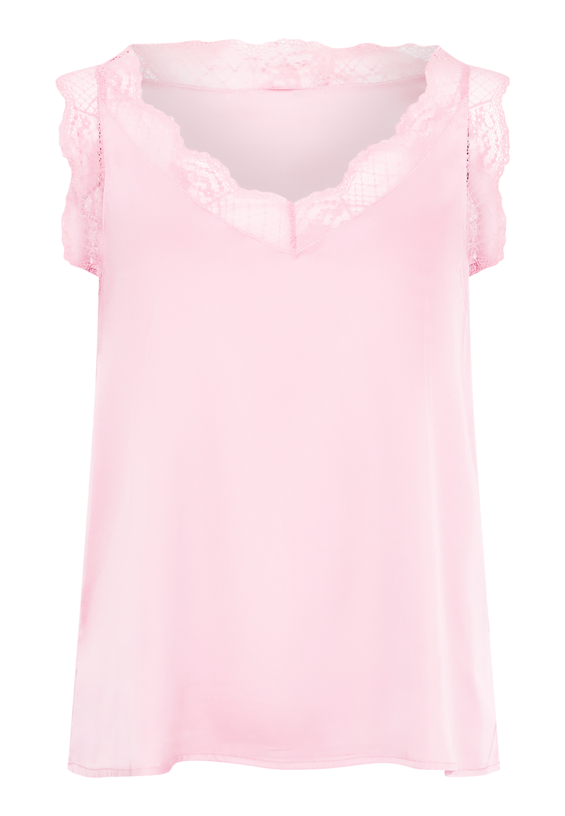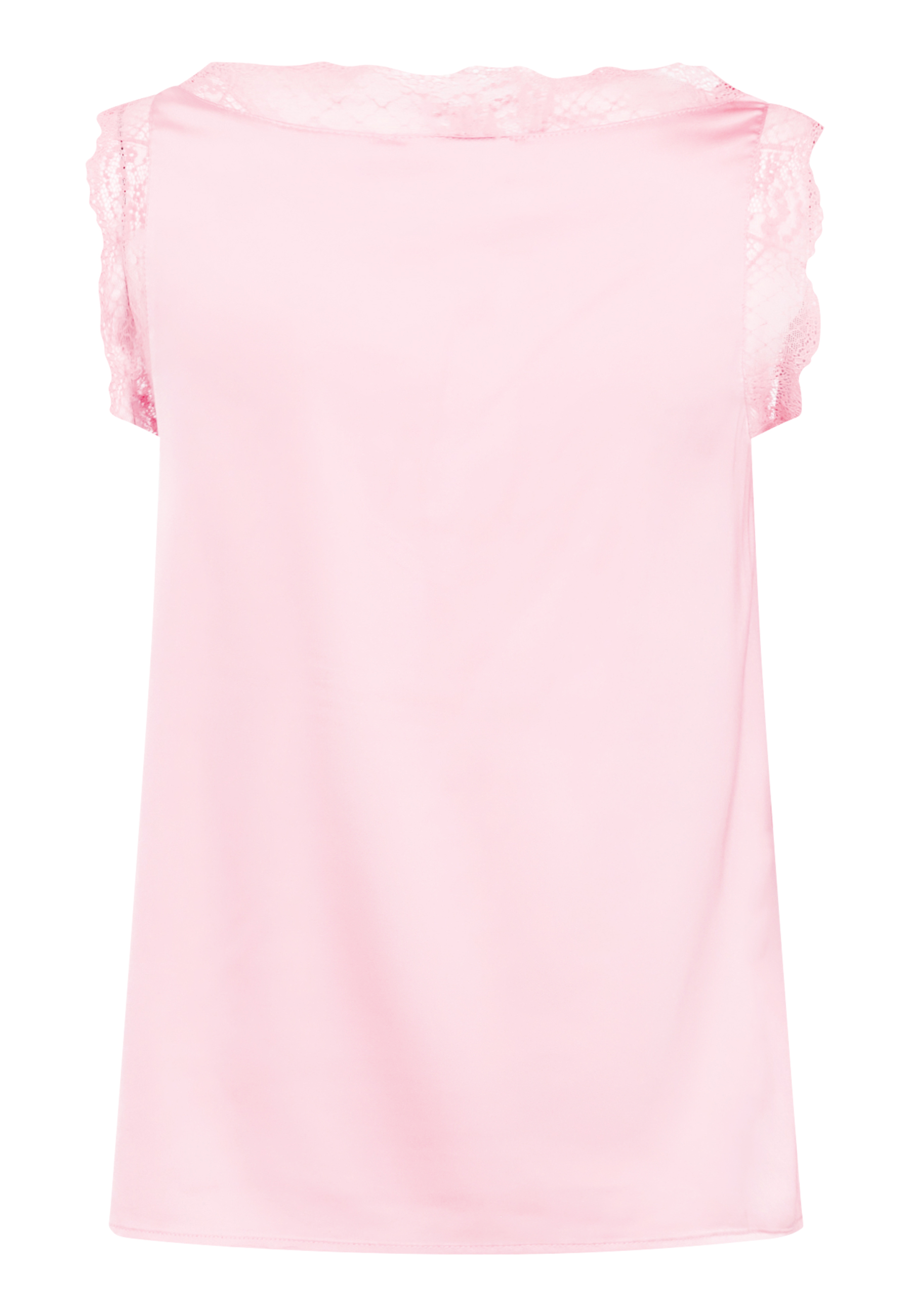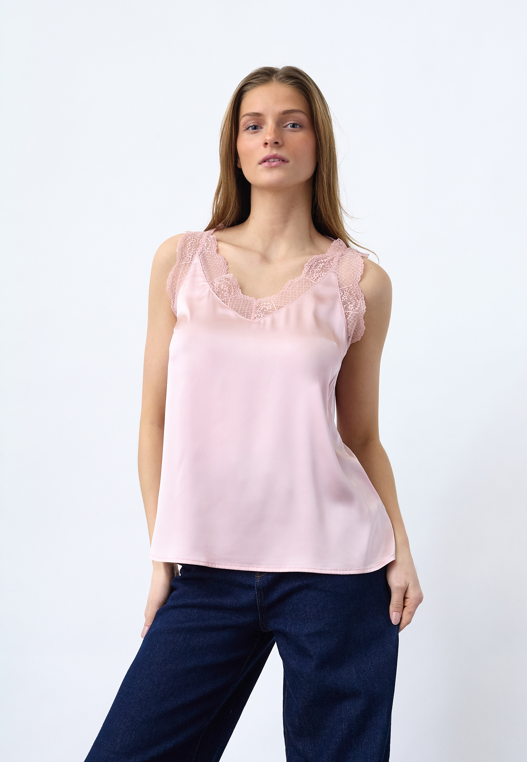 VARA-TA is a solid-colored loose-fitting satin top with a v-neck and lace details. The model is wearing a size S.