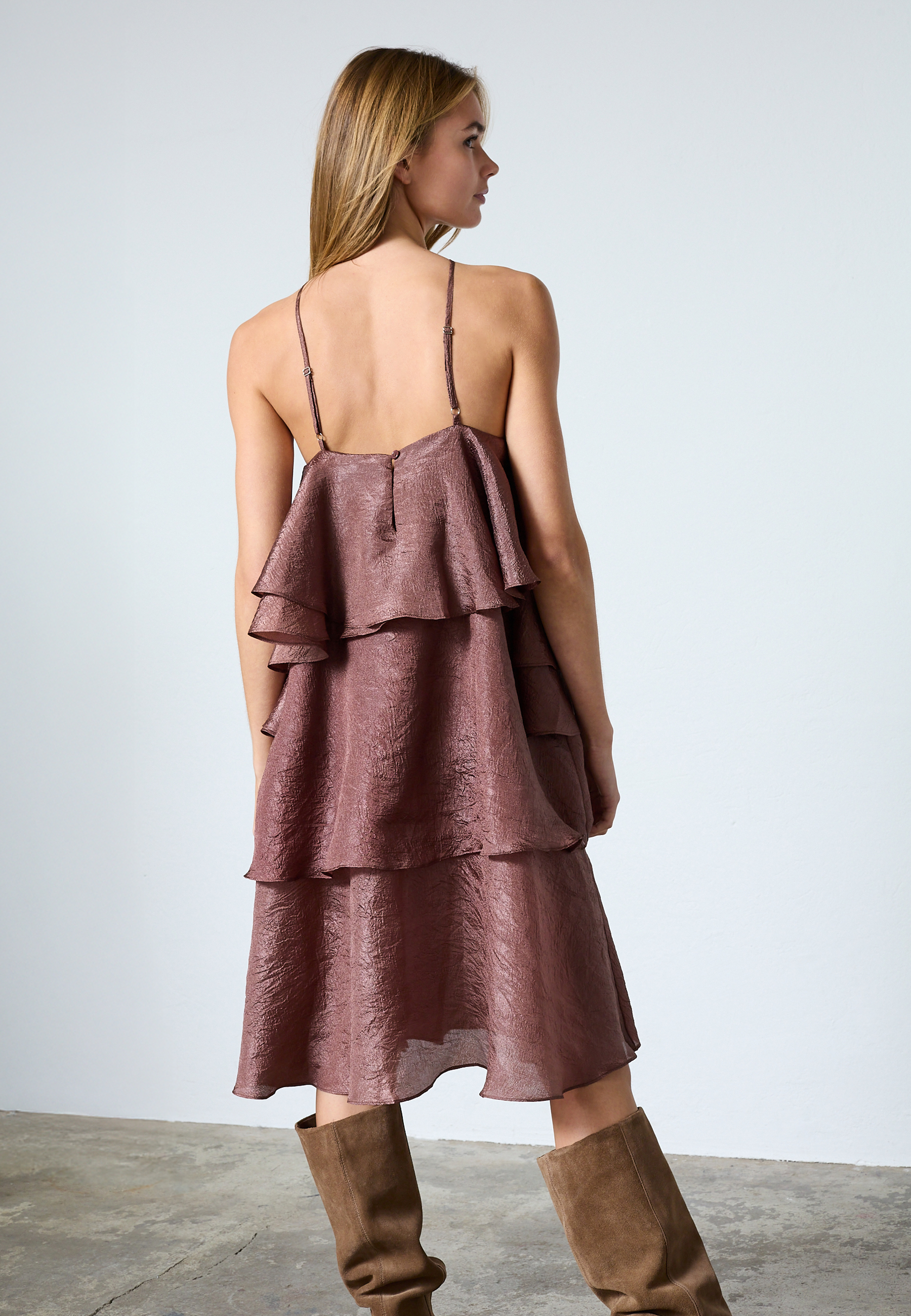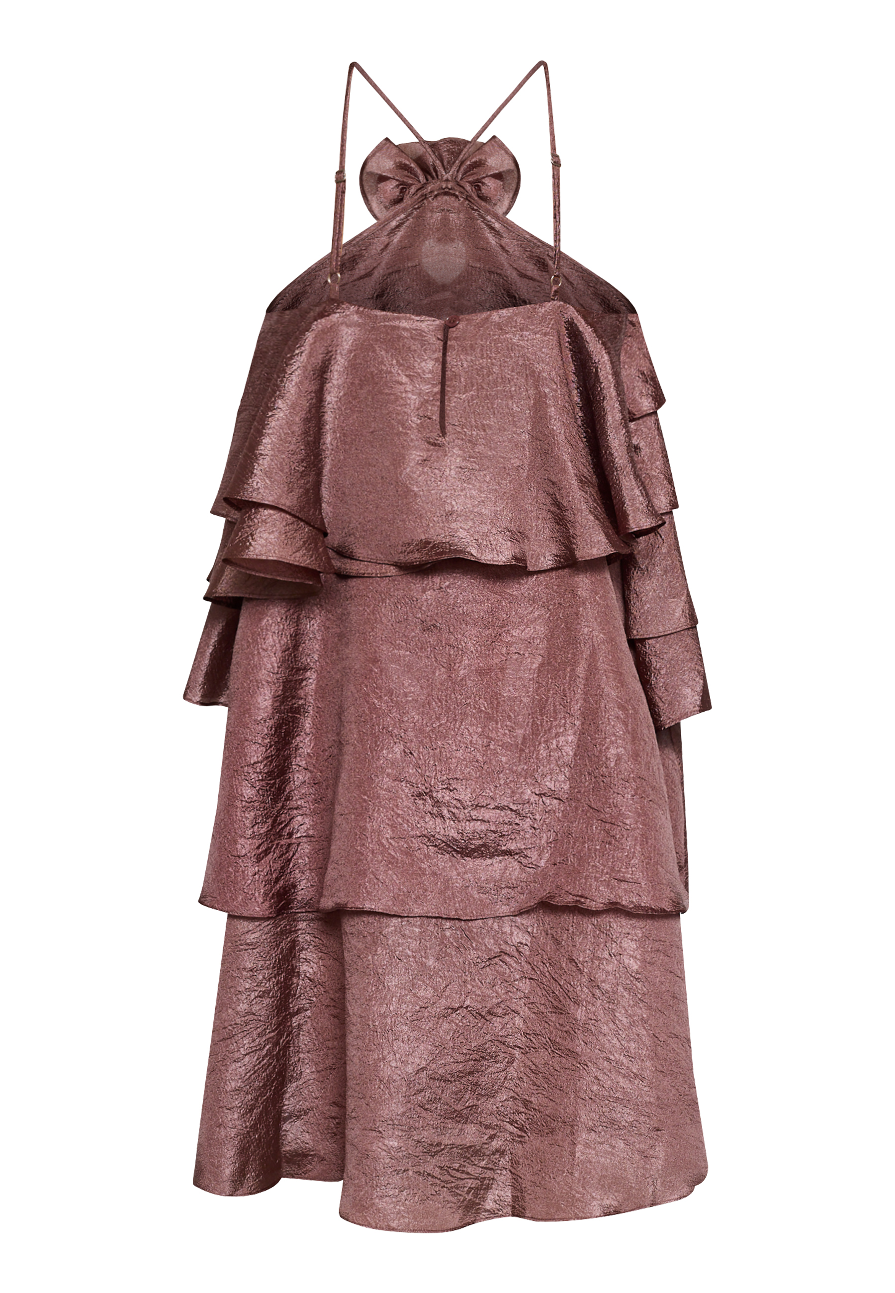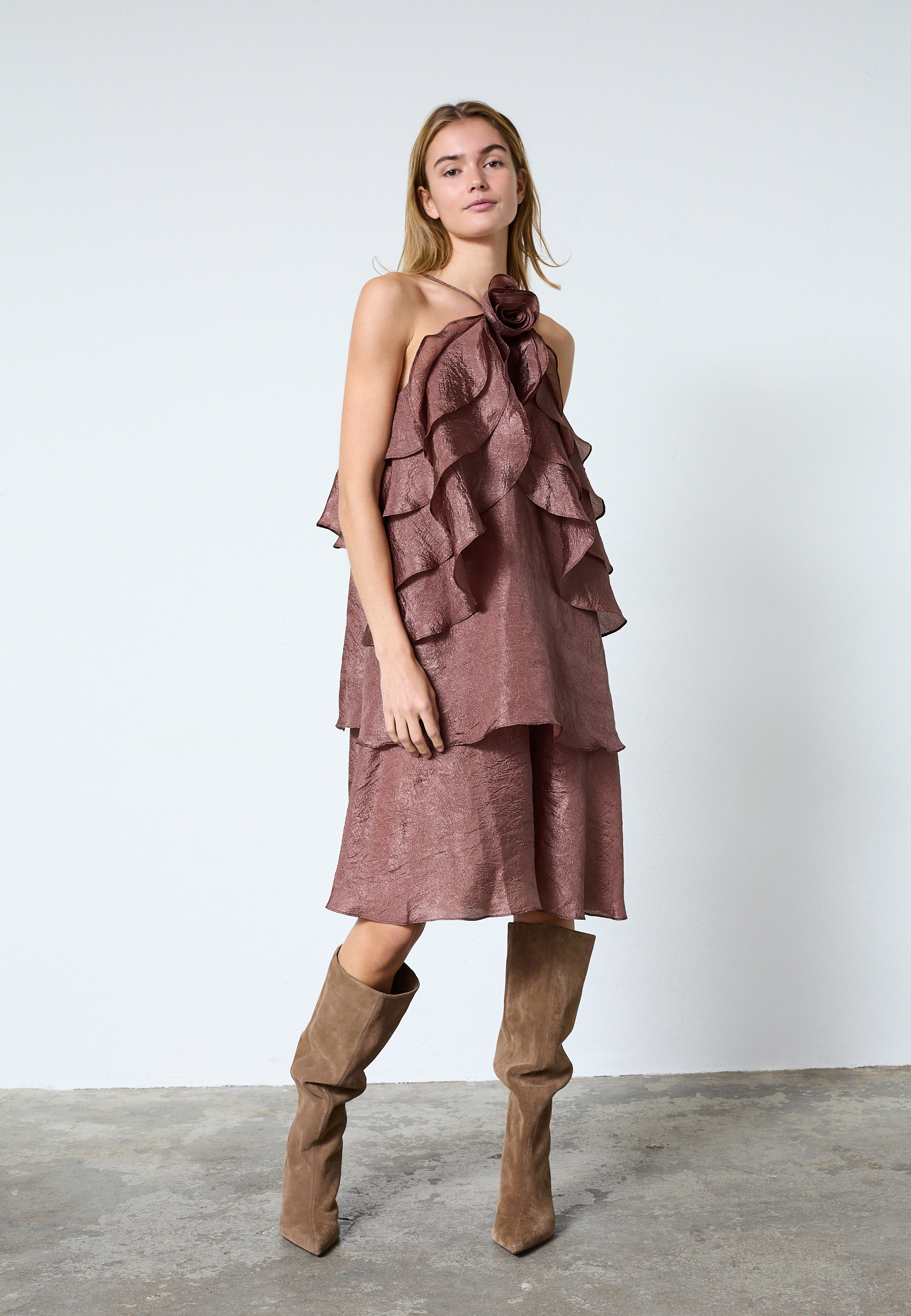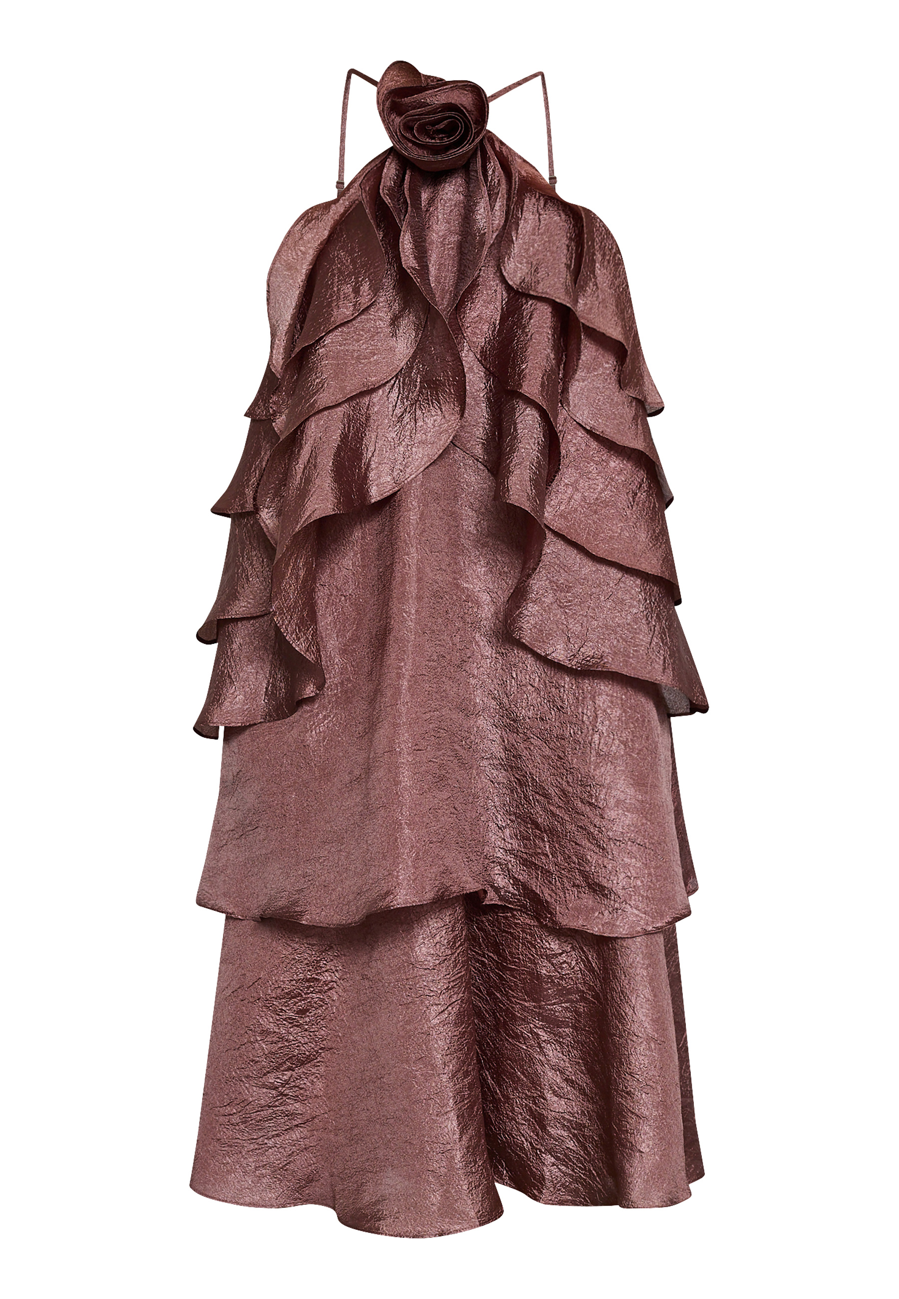 VIGGI-DR is a halterneck dress in a shiny, textured material with a multi-layered ruffle design. The dress has adjustable straps at the back and a large floral appliqué at the neckline. The model is wearing a size S.