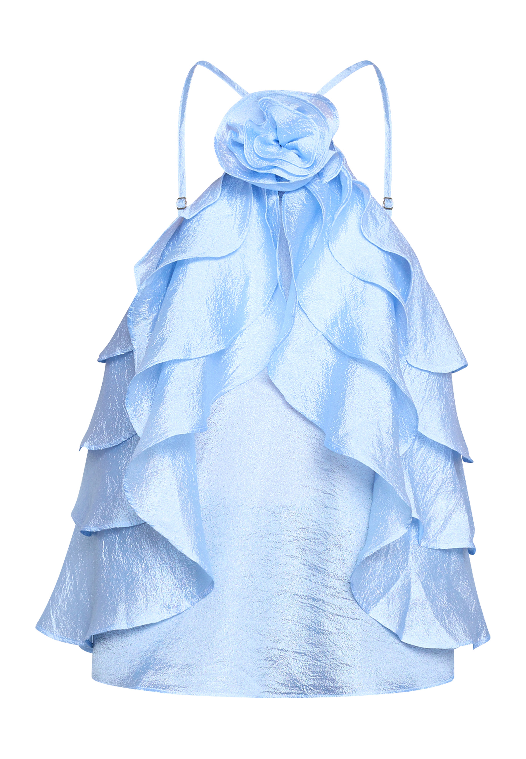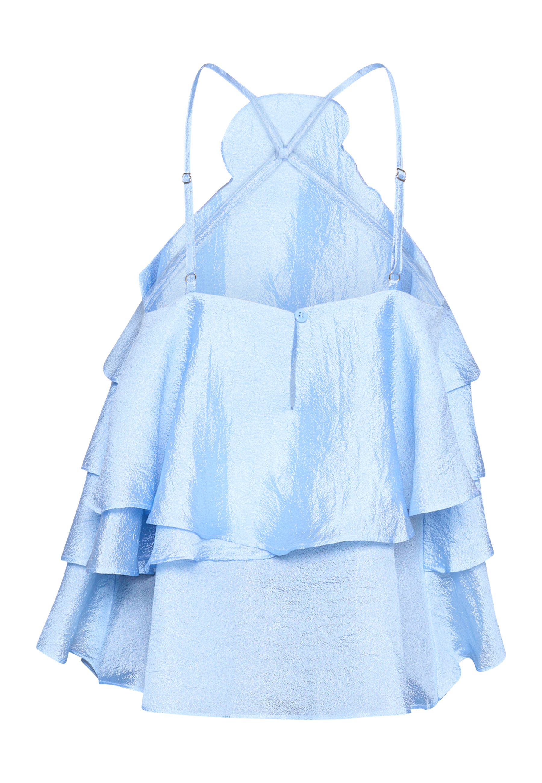 VIGGI-HL is a halterneck top in a textured, slightly shiny finish. It is decorated with ruffles across the chest. The neckline has a floral detail and the back closes with adjustable straps. The model is wearing a size S.