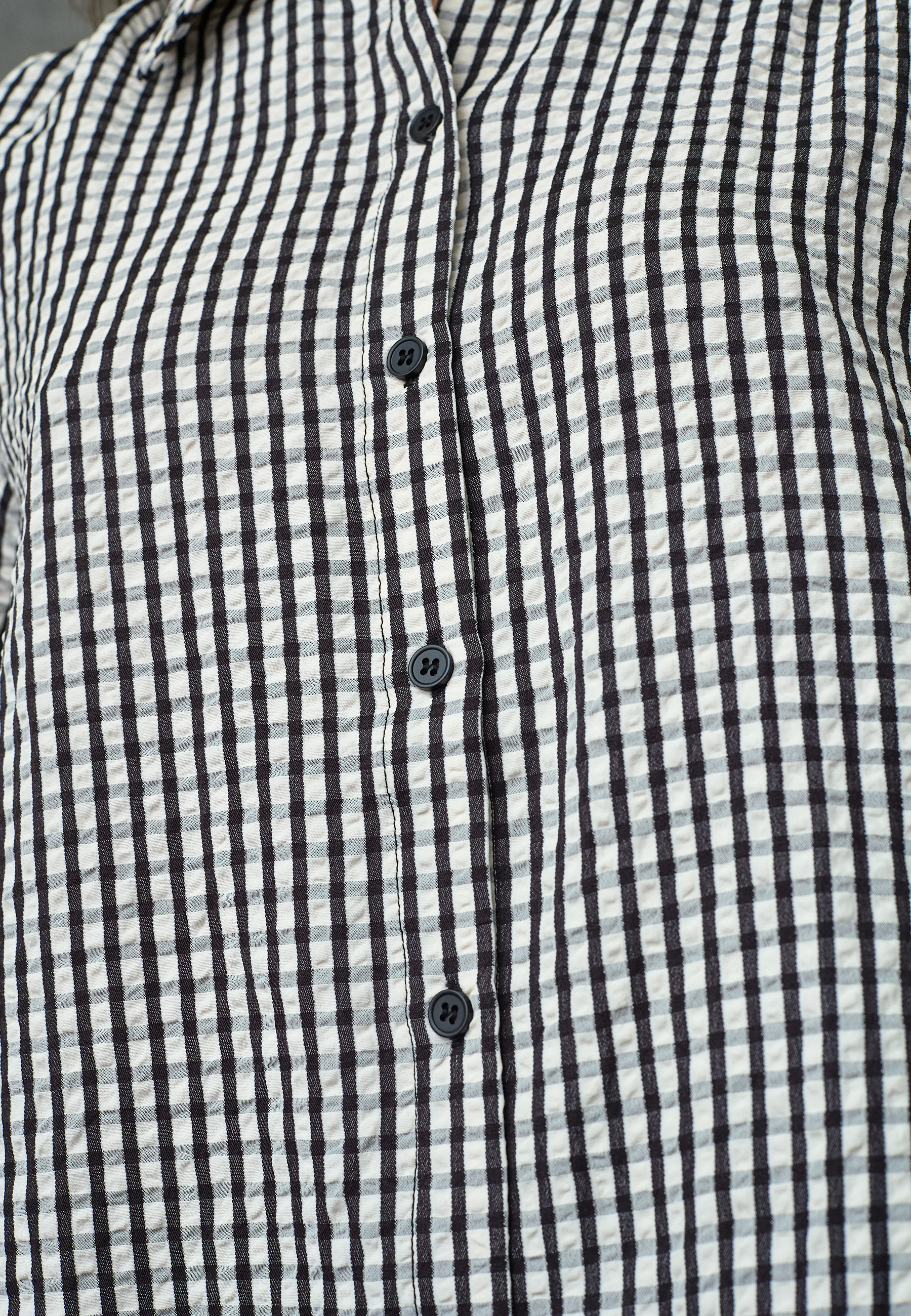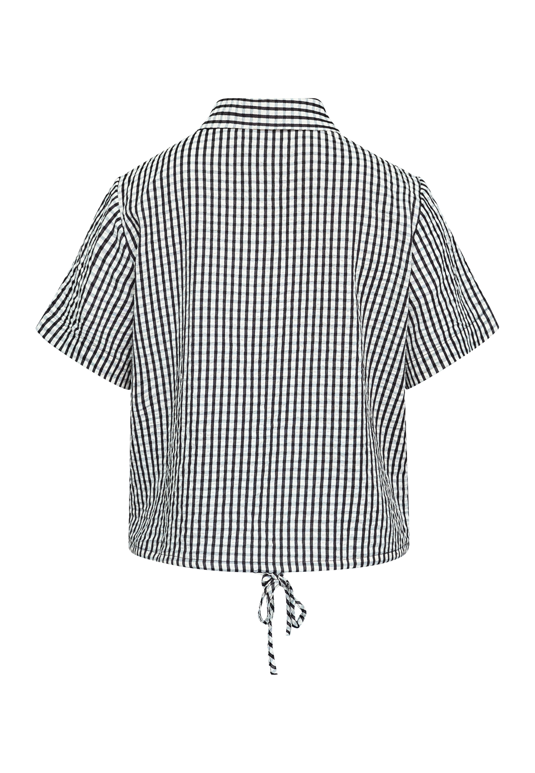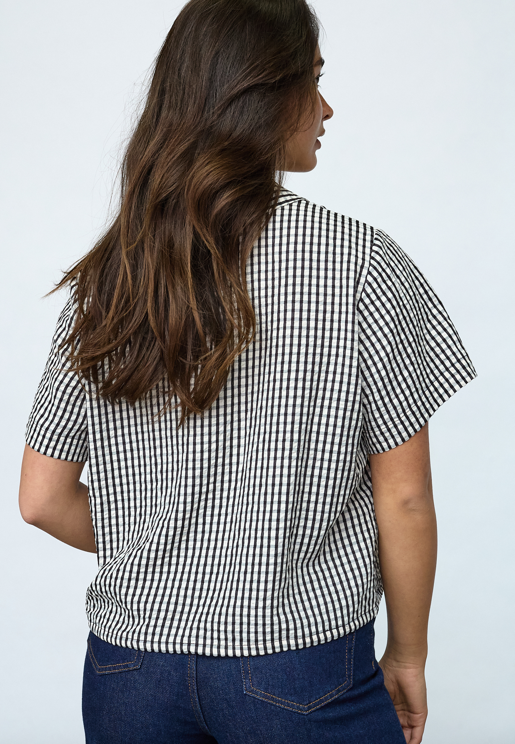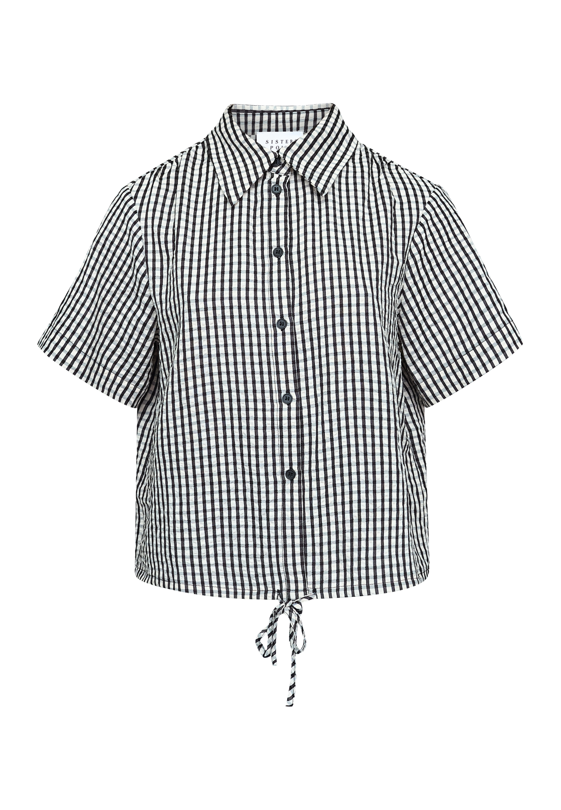 ELEO-SH1 is a short-sleeved shirt in light cotton crepe quality with a classic collar and tie at the bottom. The model is wearing a size S.