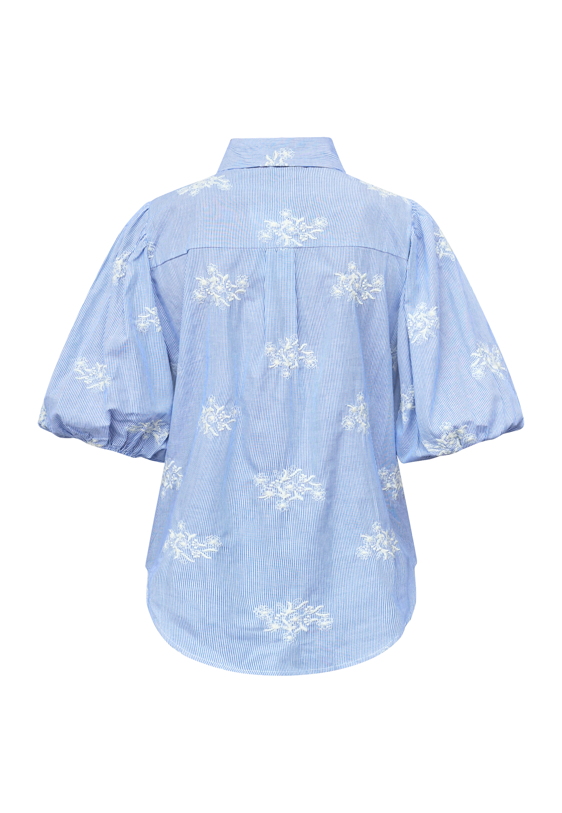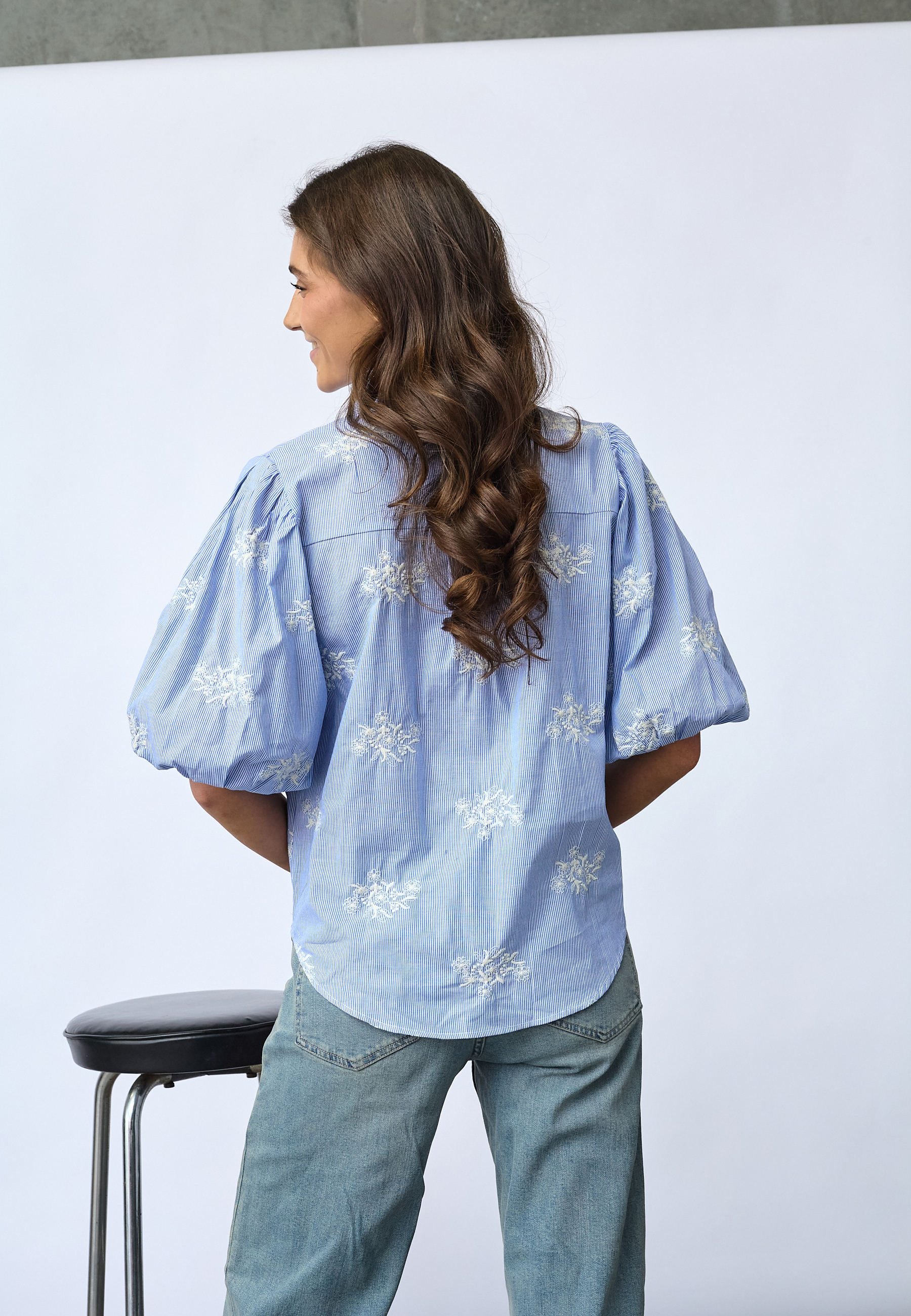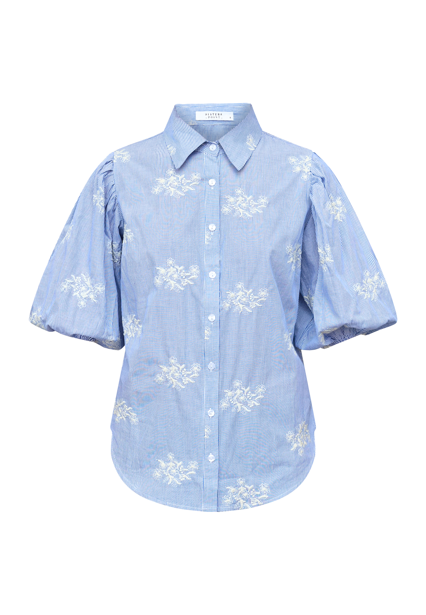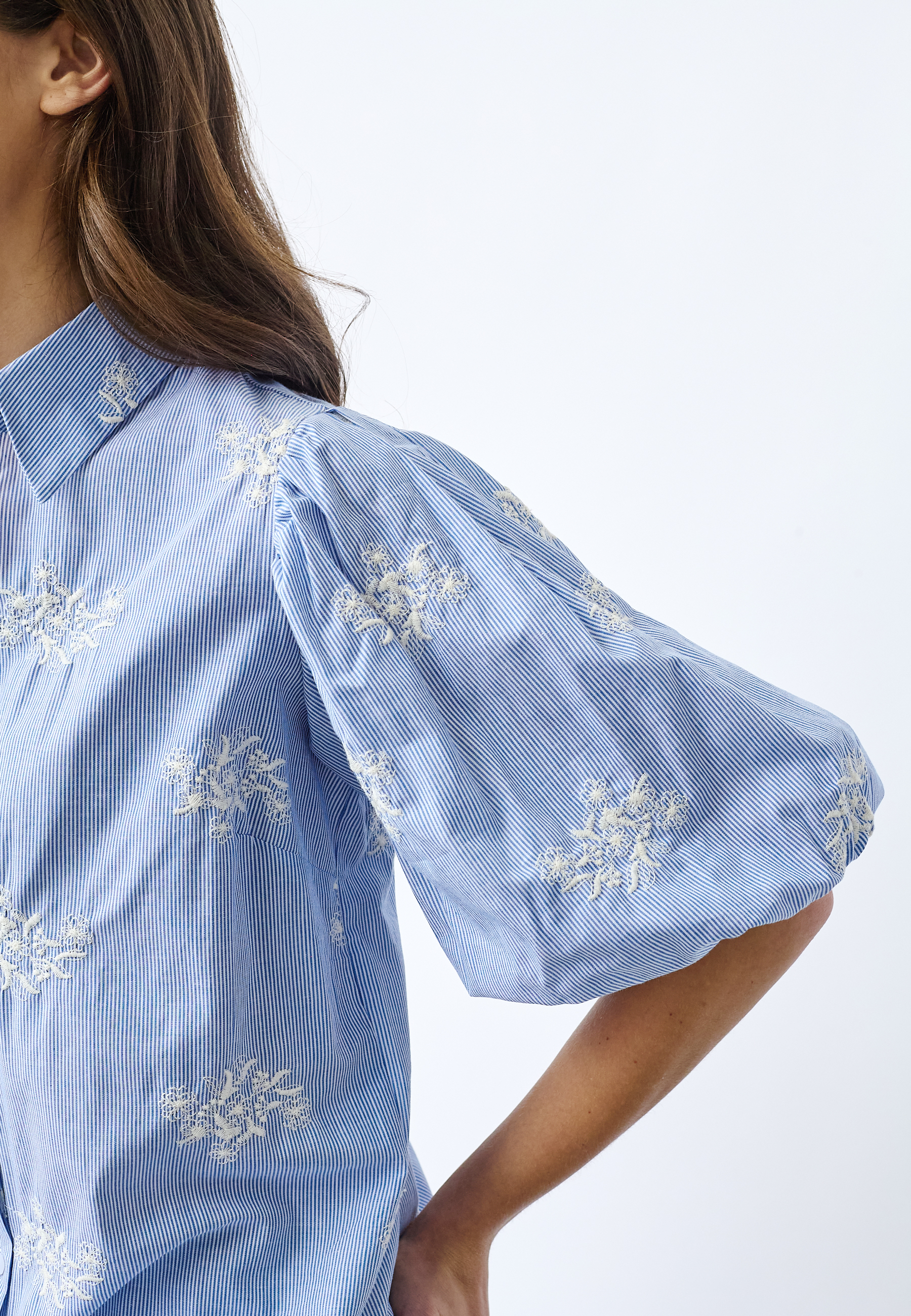 ELLA-SH83 is a shirt with stripes and small embroidery, a classic collar and a button-through closure. It has short puff sleeves that add volume and a loose fit that makes it comfortable. The model is wearing a size S