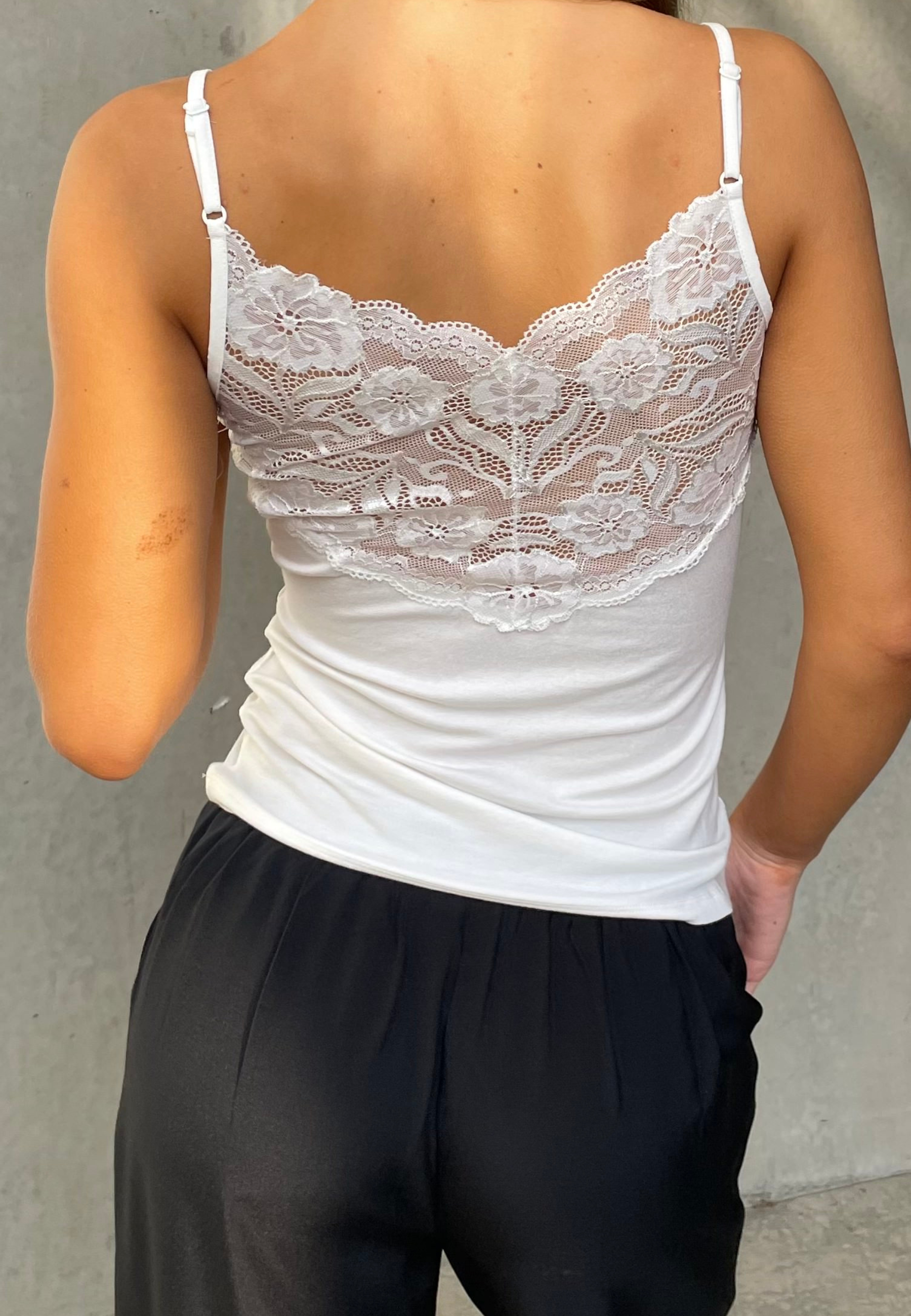VUMI-ST. Cream colored basic top with a slim fit and lace detail at the upper part of the front and back.
