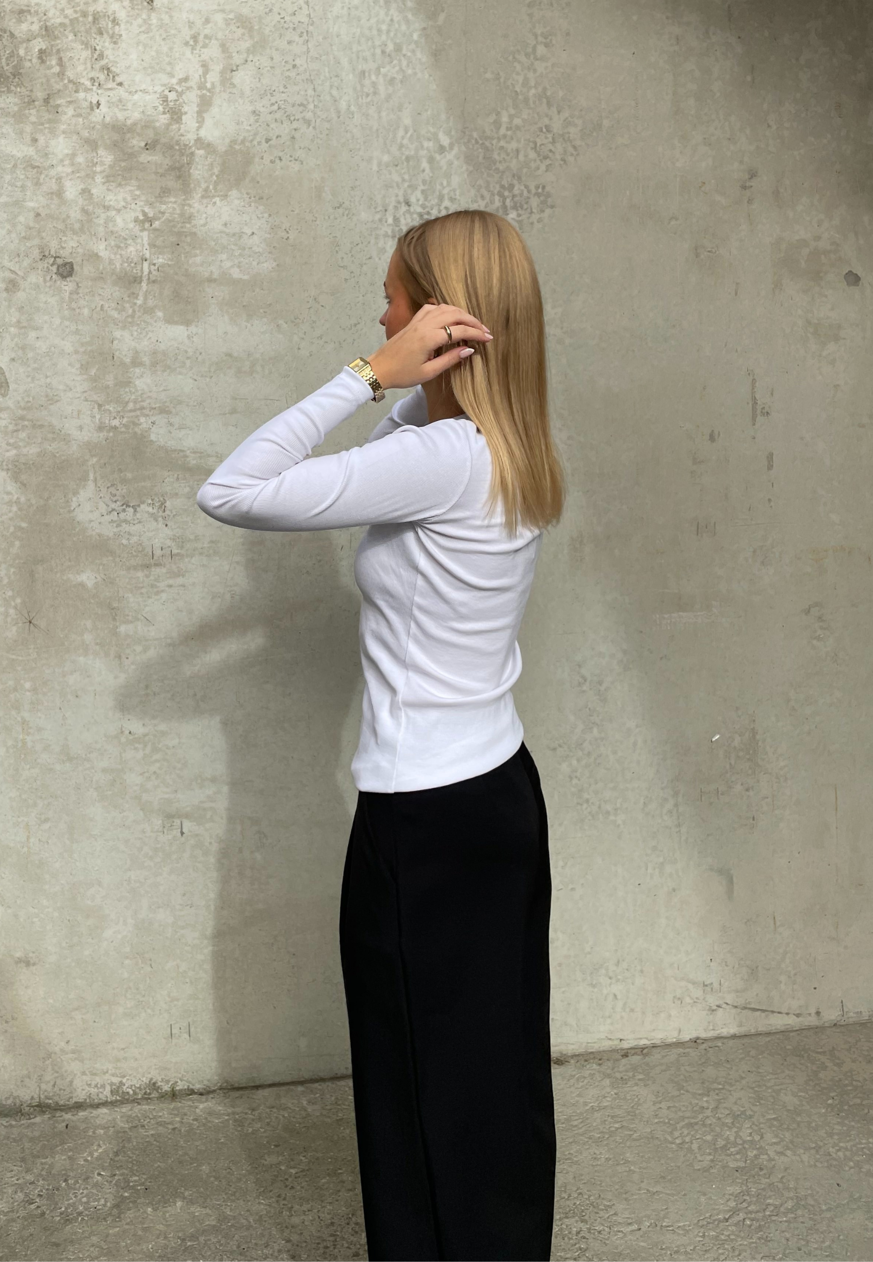 EIKE-LS is a plain and slim-fitted rib blouse. The blouse has a round neck and long sleeves.