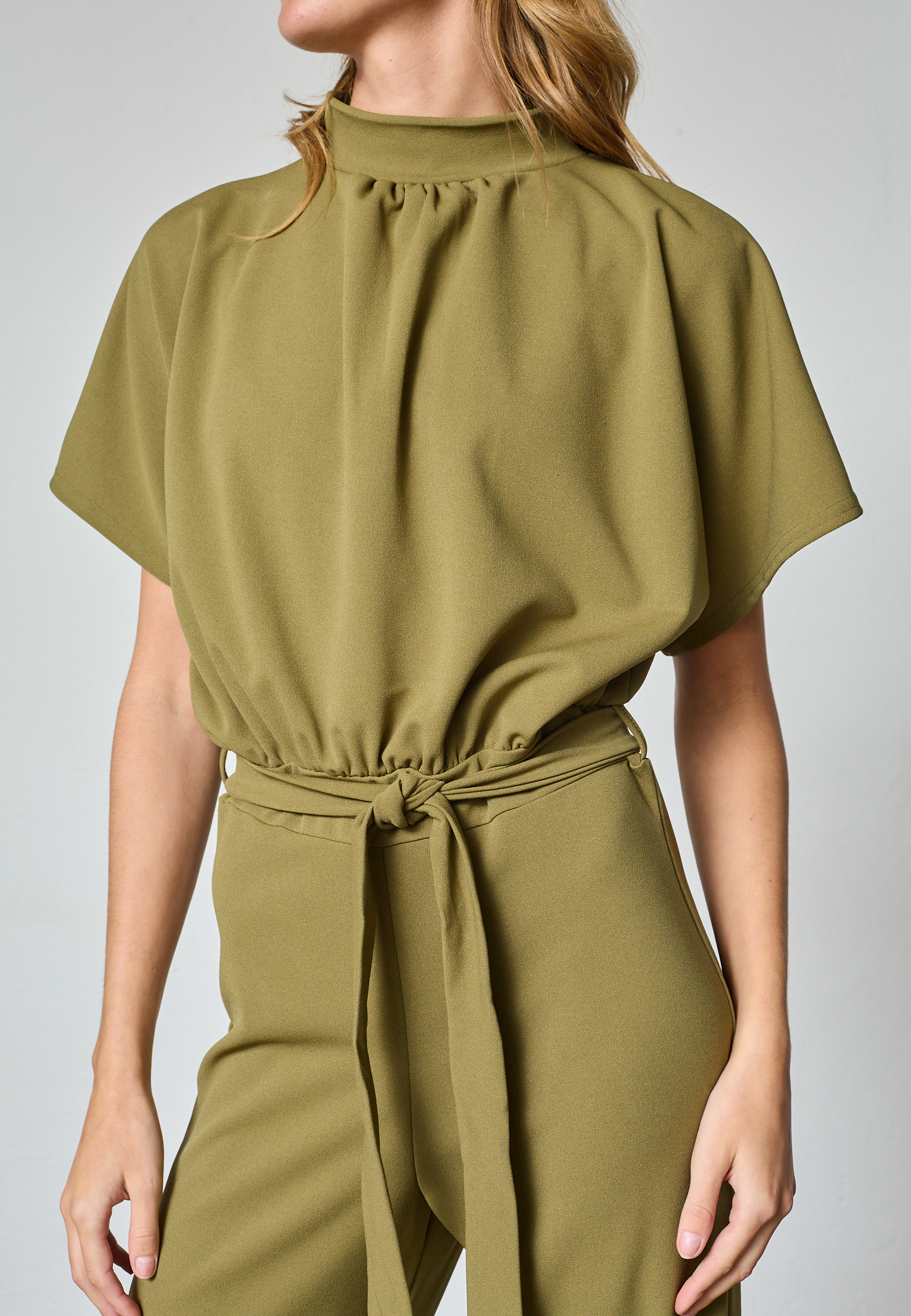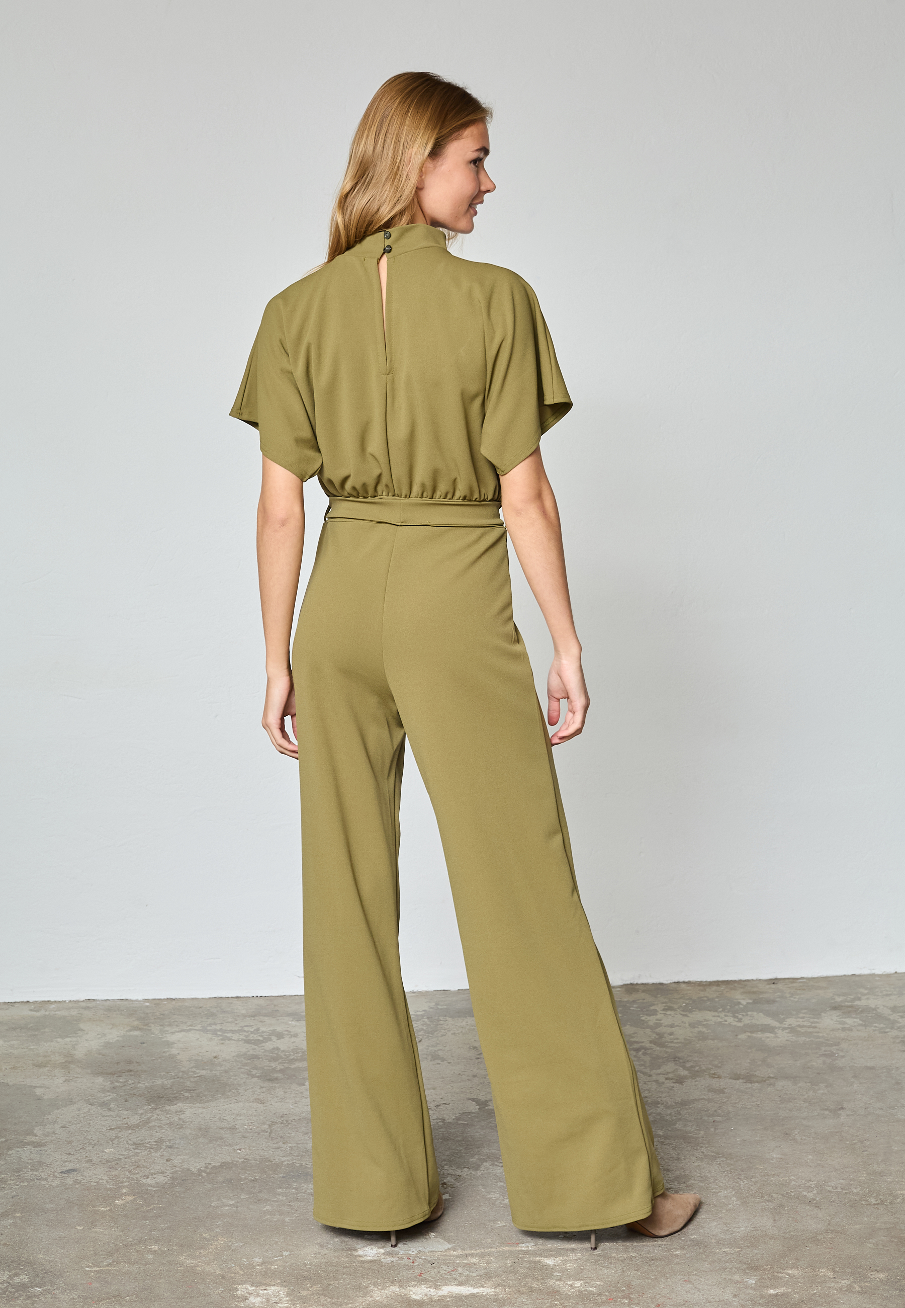 GIRL-JU is a one-colored jumpsuit with a feminine fit. The jumpsuit has a belt in waist, airy sleeves and wide legs. The model wears a size S.