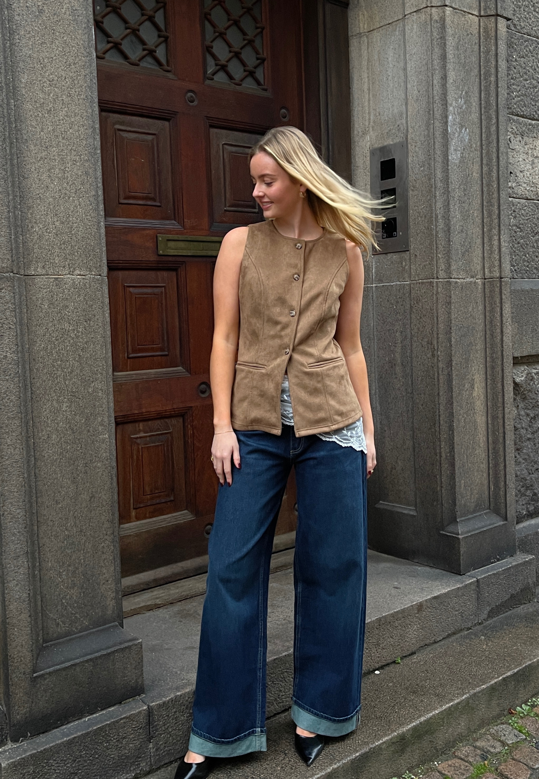 VELRA-VE is a sleeveless vest in a soft suede-like material with a round neckline. It features a full-length button closure and tailored seam details. The model is wearing size S.