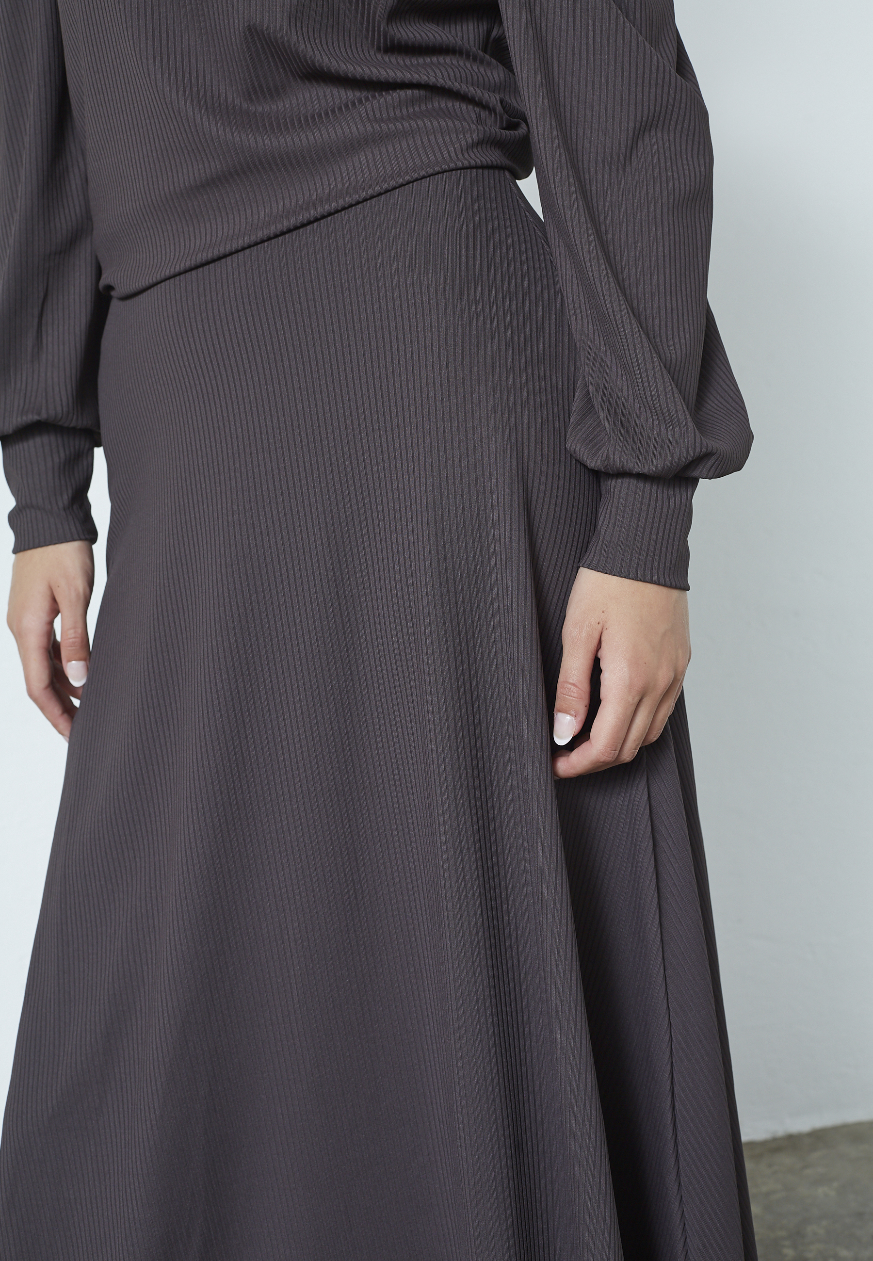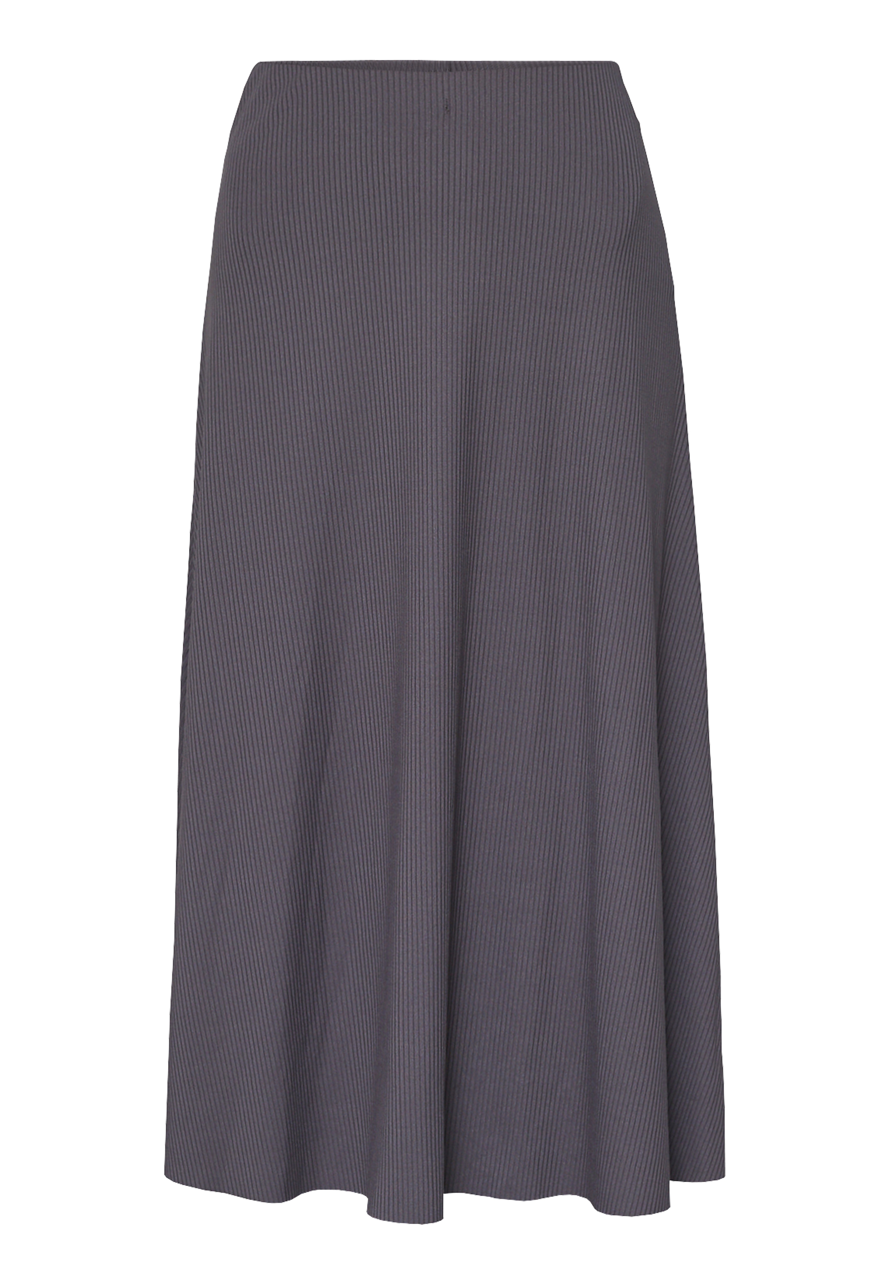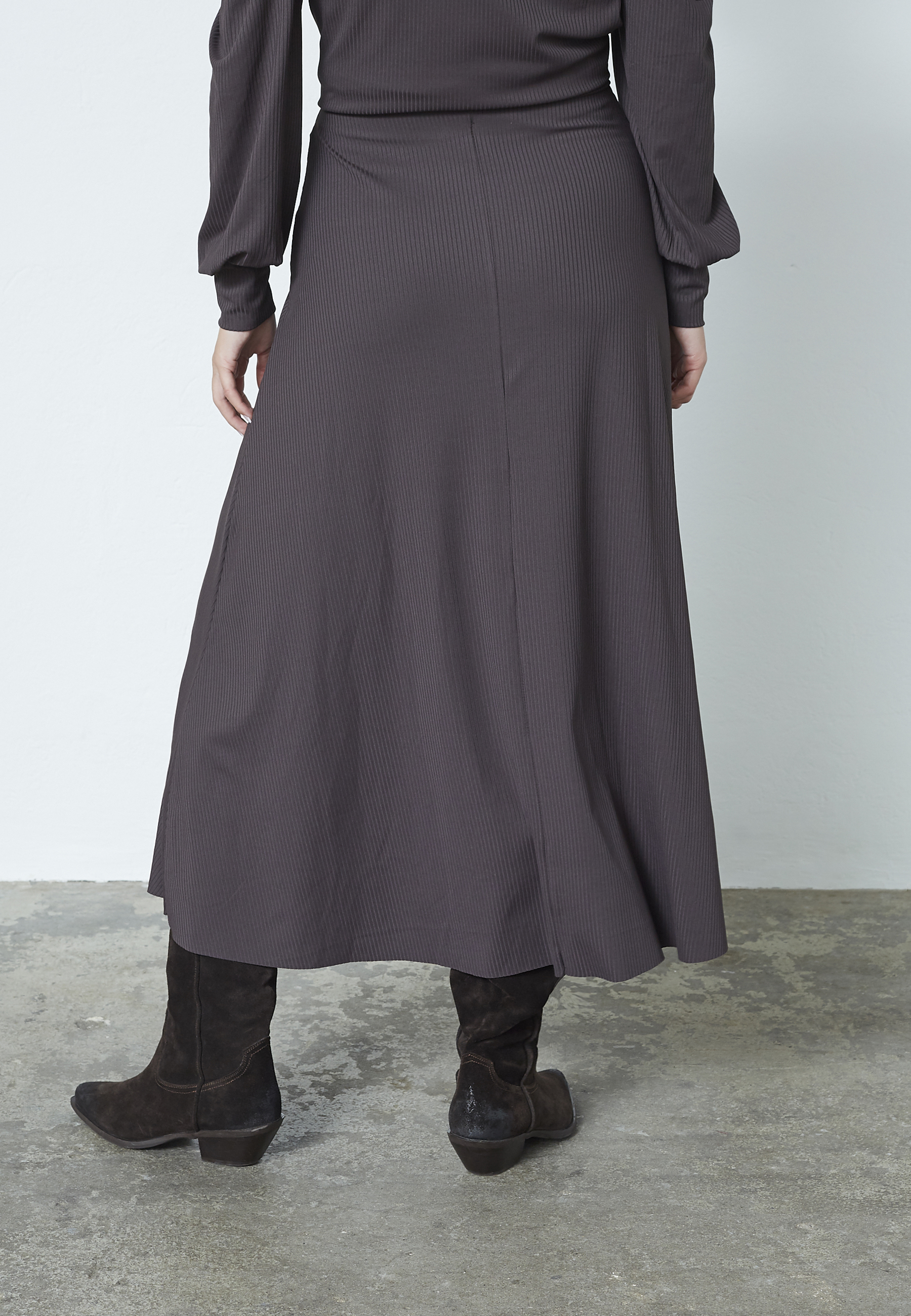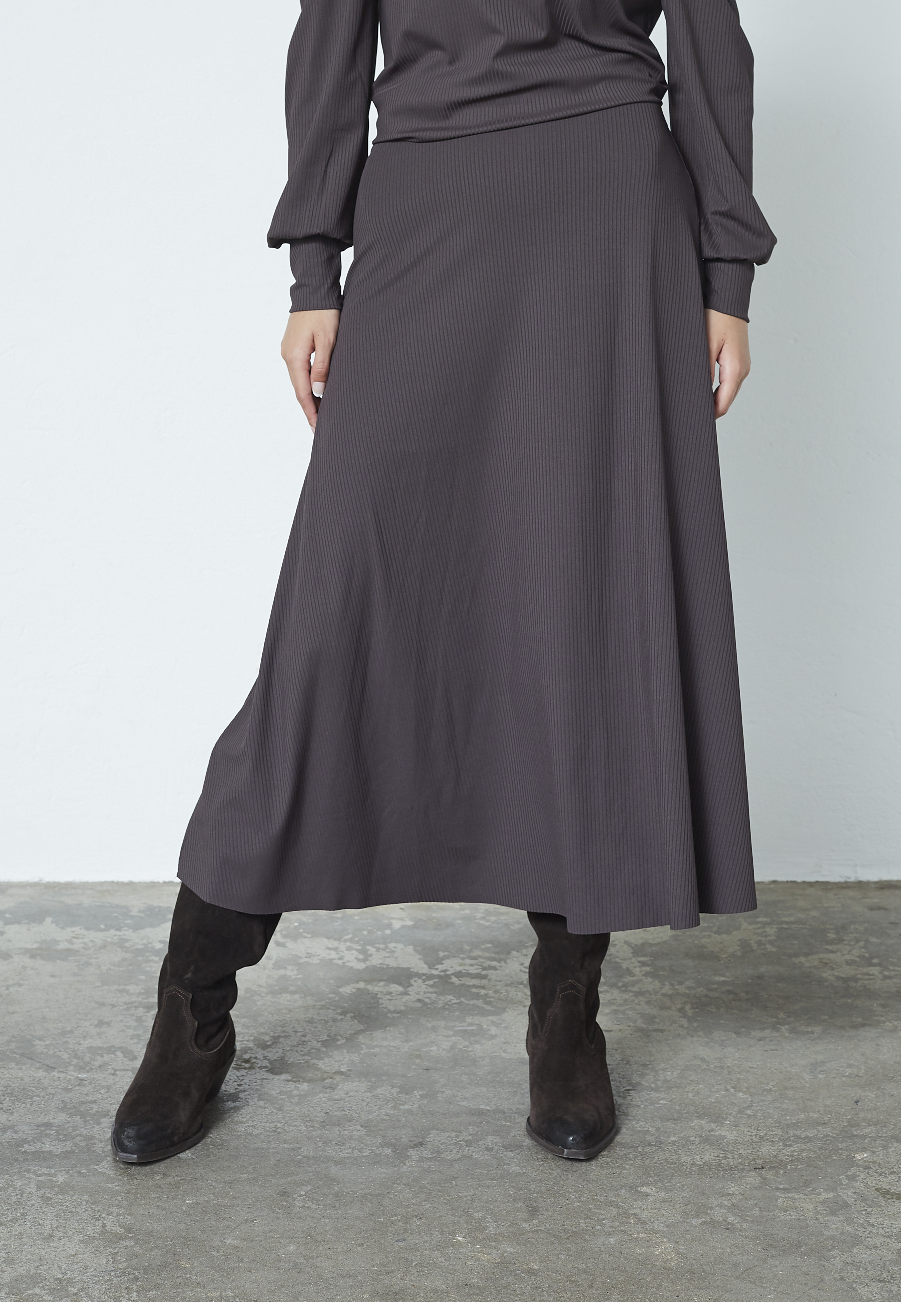 VYA-SK is a long, airy ribbed skirt. The skirt has a high waist with elastic. The model is wearing a size S and is 182 cm tall.