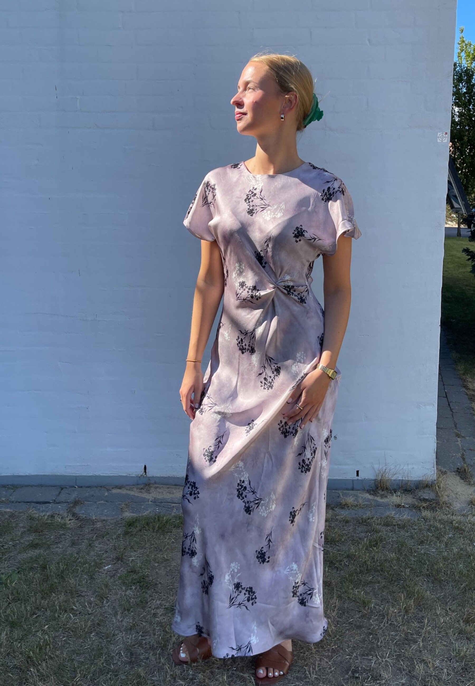 GISTA-DR1 is a long dress in a smooth, slightly shiny material with short, marked sleeves. The dress has a round neckline and a draped detail on the front that creates a feminine silhouette. The model has a size S on.