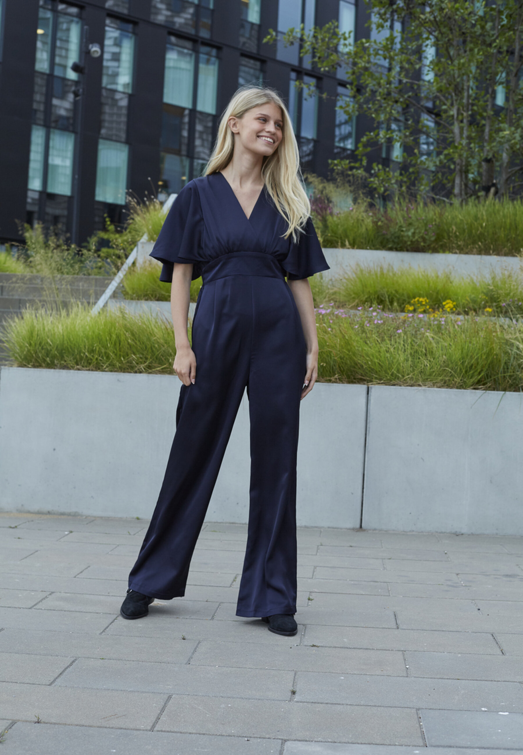 elegant satin jumpsuit with a flattering V-neck and wide legs. The model wears size S.