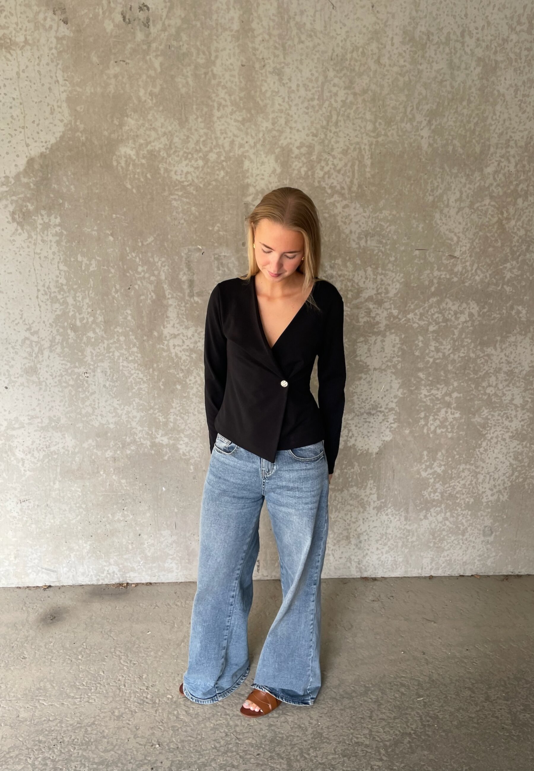 GEVELA-LS is a long-sleeved blouse with a wrap-around design and a v-neckline. It has a gold button that creates an asymmetric look. The model wears a size S.